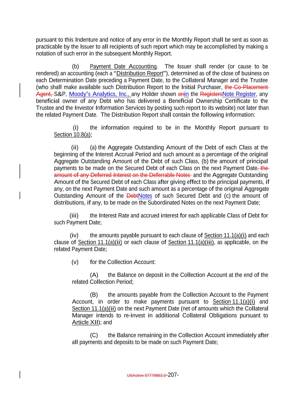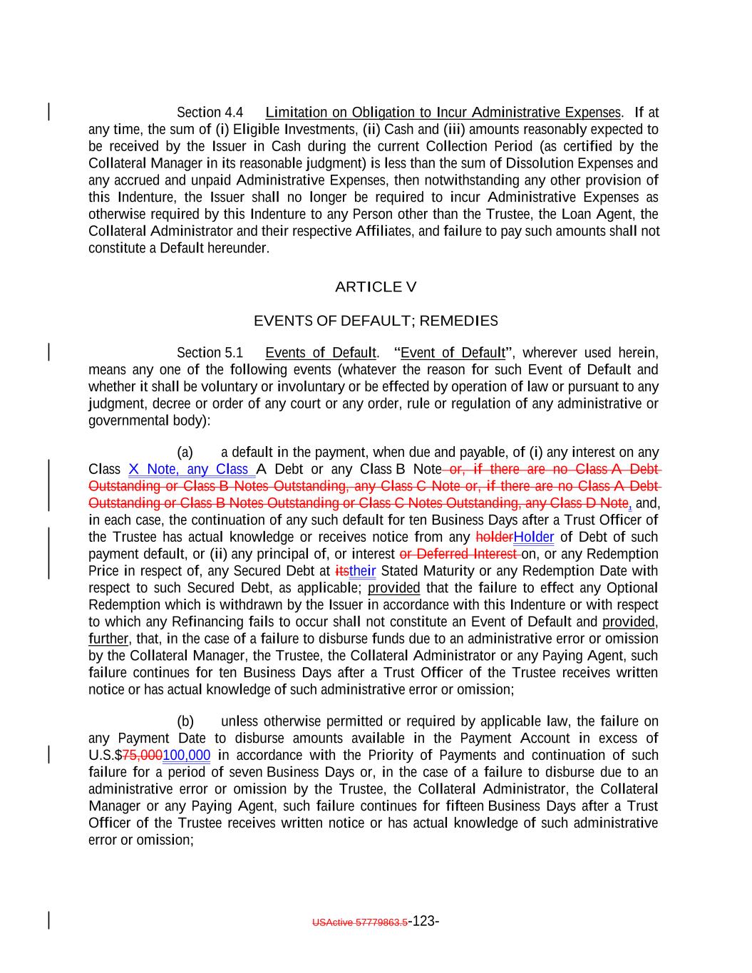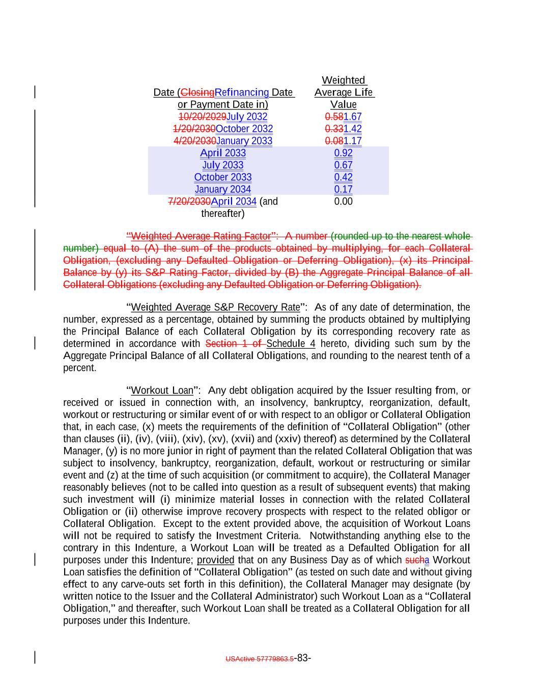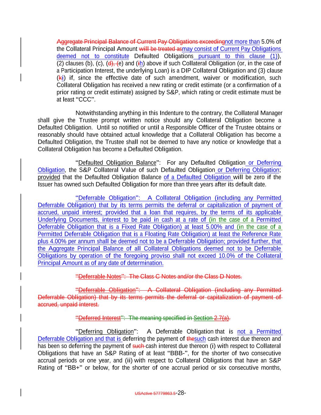 Aggregate Principal Balance of Current Pay Obligations exceedingnot more than 5.0% of the Collateral Principal Amount will be treated asmay consist of Current Pay Obligations deemed not to constitute Defaulted Obligations pursuant to this clause (1)), (2) clauses (b), (c), (d), (e) and (ih) above if such Collateral Obligation (or, in the case of a Participation Interest, the underlying Loan) is a DIP Collateral Obligation and (3) clause (ki) if, since the effective date of such amendment, waiver or modification, such Collateral Obligation has received a new rating or credit estimate (or a confirmation of a prior rating or credit estimate) assigned by S&P, which rating or credit estimate must be at least “CCC”. Notwithstanding anything in this Indenture to the contrary, the Collateral Manager shall give the Trustee prompt written notice should any Collateral Obligation become a Defaulted Obligation. Until so notified or until a Responsible Officer of the Trustee obtains or reasonably should have obtained actual knowledge that a Collateral Obligation has become a Defaulted Obligation, the Trustee shall not be deemed to have any notice or knowledge that a Collateral Obligation has become a Defaulted Obligation. “Defaulted Obligation Balance”: For any Defaulted Obligation or Deferring Obligation, the S&P Collateral Value of such Defaulted Obligation or Deferring Obligation; provided that the Defaulted Obligation Balance of a Defaulted Obligation will be zero if the Issuer has owned such Defaulted Obligation for more than three years after its default date. “Deferrable Obligation”: A Collateral Obligation (including any Permitted Deferrable Obligation) that by its terms permits the deferral or capitalization of payment of accrued, unpaid interest; provided that a loan that requires, by the terms of its applicable Underlying Documents, interest to be paid in cash at a rate of (in the case of a Permitted Deferrable Obligation that is a Fixed Rate Obligation) at least 5.00% and (in the case of a Permitted Deferrable Obligation that is a Floating Rate Obligation) at least the Reference Rate plus 4.00% per annum shall be deemed not to be a Deferrable Obligation; provided further, that the Aggregate Principal Balance of all Collateral Obligations deemed not to be Deferrable Obligations by operation of the foregoing proviso shall not exceed 10.0% of the Collateral Principal Amount as of any date of determination. “Deferrable Notes”: The Class C Notes and/or the Class D Notes. “Deferrable Obligation”: A Collateral Obligation (including any Permitted Deferrable Obligation) that by its terms permits the deferral or capitalization of payment of accrued, unpaid interest. “Deferred Interest”: The meaning specified in Section 2.7(a). “Deferring Obligation”: A Deferrable Obligation that is not a Permitted Deferrable Obligation and that is deferring the payment of thesuch cash interest due thereon and has been so deferring the payment of such cash interest due thereon (i) with respect to Collateral Obligations that have an S&P Rating of at least “BBB-”, for the shorter of two consecutive accrual periods or one year, and (ii) with respect to Collateral Obligations that have an S&P Rating of “BB+” or below, for the shorter of one accrual period or six consecutive months, USActive 57779863.5-28-