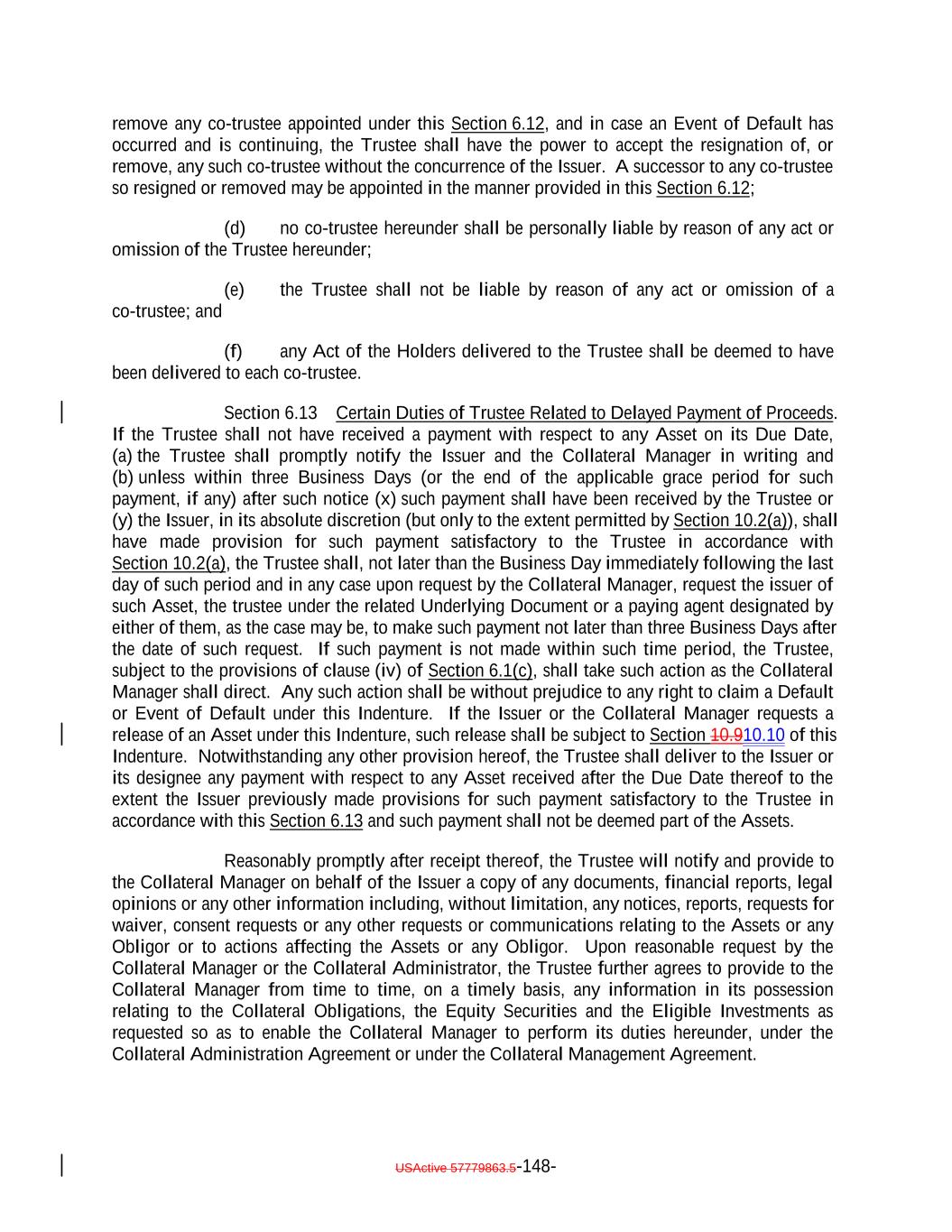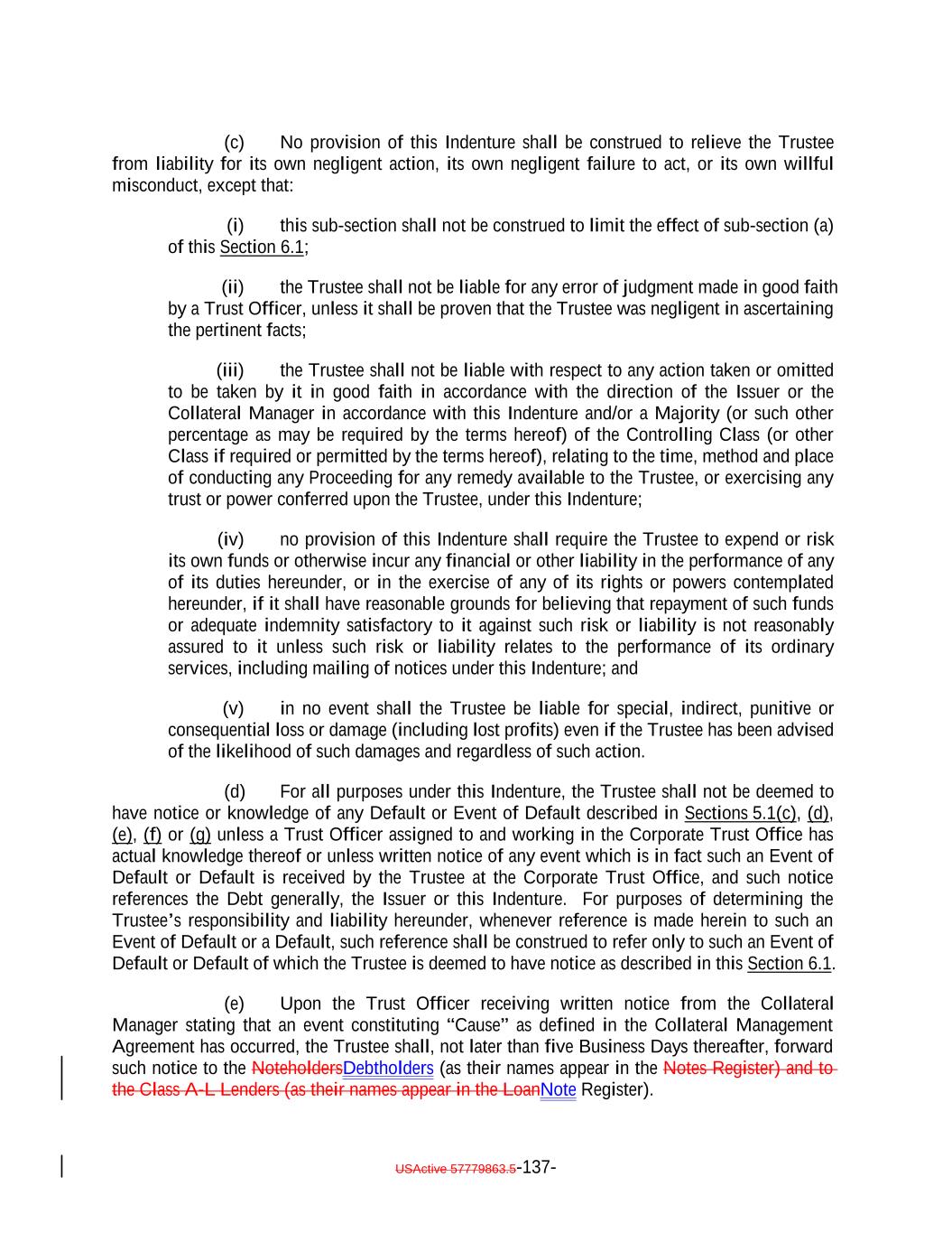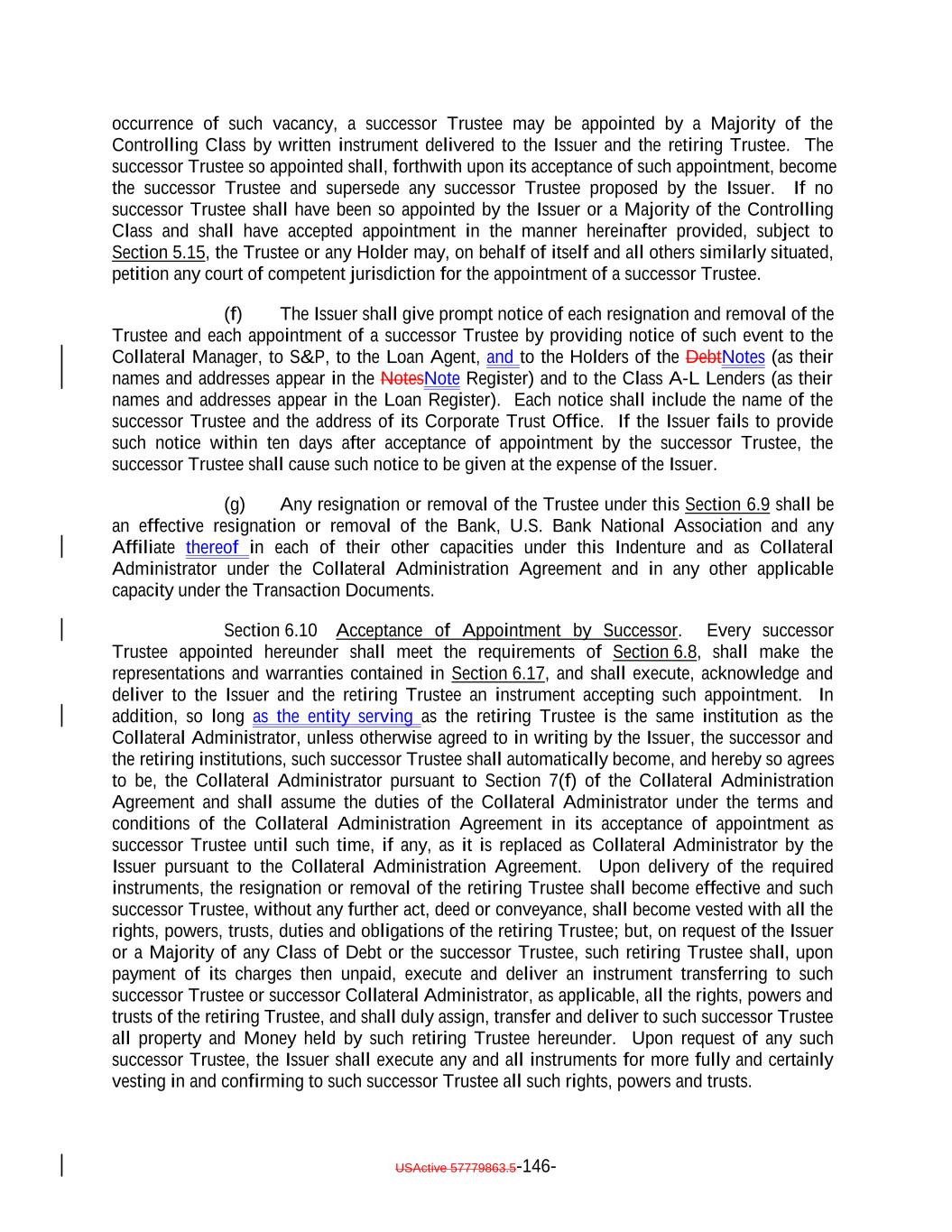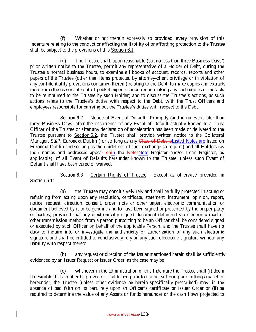 Aggregate Principal Balance of Current Pay Obligations exceedingnot more than 5.0% of the Collateral Principal Amount will be treated asmay consist of Current Pay Obligations deemed not to constitute Defaulted Obligations pursuant to this clause (1)), (2) clauses (b), (c), (d), (e) and (ih) above if such Collateral Obligation (or, in the case of a Participation Interest, the underlying Loan) is a DIP Collateral Obligation and (3) clause (ki) if, since the effective date of such amendment, waiver or modification, such Collateral Obligation has received a new rating or credit estimate (or a confirmation of a prior rating or credit estimate) assigned by S&P, which rating or credit estimate must be at least “CCC”. Notwithstanding anything in this Indenture to the contrary, the Collateral Manager shall give the Trustee prompt written notice should any Collateral Obligation become a Defaulted Obligation. Until so notified or until a Responsible Officer of the Trustee obtains or reasonably should have obtained actual knowledge that a Collateral Obligation has become a Defaulted Obligation, the Trustee shall not be deemed to have any notice or knowledge that a Collateral Obligation has become a Defaulted Obligation. “Defaulted Obligation Balance”: For any Defaulted Obligation or Deferring Obligation, the S&P Collateral Value of such Defaulted Obligation or Deferring Obligation; provided that the Defaulted Obligation Balance of a Defaulted Obligation will be zero if the Issuer has owned such Defaulted Obligation for more than three years after its default date. “Deferrable Obligation”: A Collateral Obligation (including any Permitted Deferrable Obligation) that by its terms permits the deferral or capitalization of payment of accrued, unpaid interest; provided that a loan that requires, by the terms of its applicable Underlying Documents, interest to be paid in cash at a rate of (in the case of a Permitted Deferrable Obligation that is a Fixed Rate Obligation) at least 5.00% and (in the case of a Permitted Deferrable Obligation that is a Floating Rate Obligation) at least the Reference Rate plus 4.00% per annum shall be deemed not to be a Deferrable Obligation; provided further, that the Aggregate Principal Balance of all Collateral Obligations deemed not to be Deferrable Obligations by operation of the foregoing proviso shall not exceed 10.0% of the Collateral Principal Amount as of any date of determination. “Deferrable Notes”: The Class C Notes and/or the Class D Notes. “Deferrable Obligation”: A Collateral Obligation (including any Permitted Deferrable Obligation) that by its terms permits the deferral or capitalization of payment of accrued, unpaid interest. “Deferred Interest”: The meaning specified in Section 2.7(a). “Deferring Obligation”: A Deferrable Obligation that is not a Permitted Deferrable Obligation and that is deferring the payment of thesuch cash interest due thereon and has been so deferring the payment of such cash interest due thereon (i) with respect to Collateral Obligations that have an S&P Rating of at least “BBB-”, for the shorter of two consecutive accrual periods or one year, and (ii) with respect to Collateral Obligations that have an S&P Rating of “BB+” or below, for the shorter of one accrual period or six consecutive months, USActive 57779863.5-28-