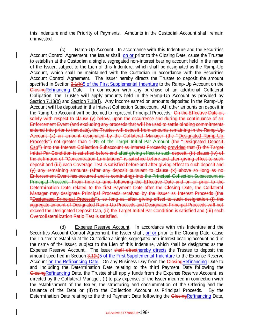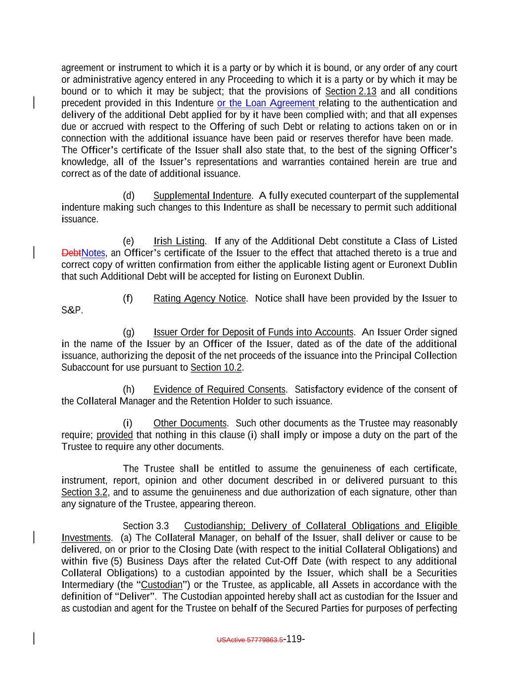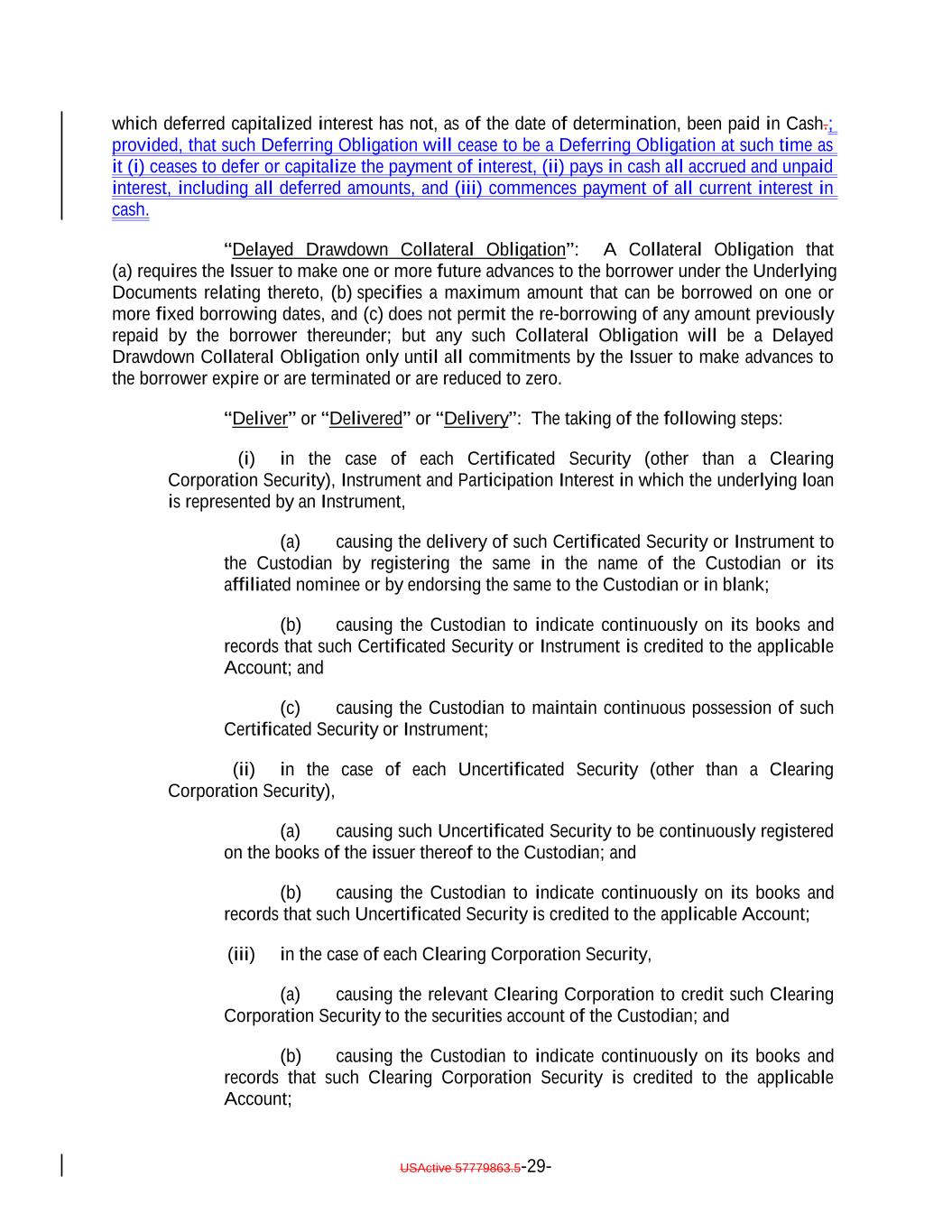 which deferred capitalized interest has not, as of the date of determination, been paid in Cash.; provided, that such Deferring Obligation will cease to be a Deferring Obligation at such time as it (i) ceases to defer or capitalize the payment of interest, (ii) pays in cash all accrued and unpaid interest, including all deferred amounts, and (iii) commences payment of all current interest in cash. “Delayed Drawdown Collateral Obligation”: A Collateral Obligation that (a) requires the Issuer to make one or more future advances to the borrower under the Underlying Documents relating thereto, (b) specifies a maximum amount that can be borrowed on one or more fixed borrowing dates, and (c) does not permit the re-borrowing of any amount previously repaid by the borrower thereunder; but any such Collateral Obligation will be a Delayed Drawdown Collateral Obligation only until all commitments by the Issuer to make advances to the borrower expire or are terminated or are reduced to zero. “Deliver” or “Delivered” or “Delivery”: The taking of the following steps: (i) in the case of each Certificated Security (other than a Clearing Corporation Security), Instrument and Participation Interest in which the underlying loan is represented by an Instrument, (a) causing the delivery of such Certificated Security or Instrument to the Custodian by registering the same in the name of the Custodian or its affiliated nominee or by endorsing the same to the Custodian or in blank; (b) causing the Custodian to indicate continuously on its books and records that such Certificated Security or Instrument is credited to the applicable Account; and (c) causing the Custodian to maintain continuous possession of such Certificated Security or Instrument; (ii) in the case of each Uncertificated Security (other than a Clearing Corporation Security), (a) causing such Uncertificated Security to be continuously registered on the books of the issuer thereof to the Custodian; and (b) causing the Custodian to indicate continuously on its books and records that such Uncertificated Security is credited to the applicable Account; (iii) in the case of each Clearing Corporation Security, (a) causing the relevant Clearing Corporation to credit such Clearing Corporation Security to the securities account of the Custodian; and (b) causing the Custodian to indicate continuously on its books and records that such Clearing Corporation Security is credited to the applicable Account; USActive 57779863.5-29-
