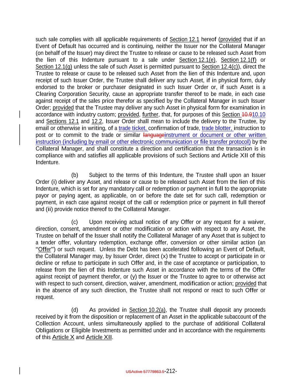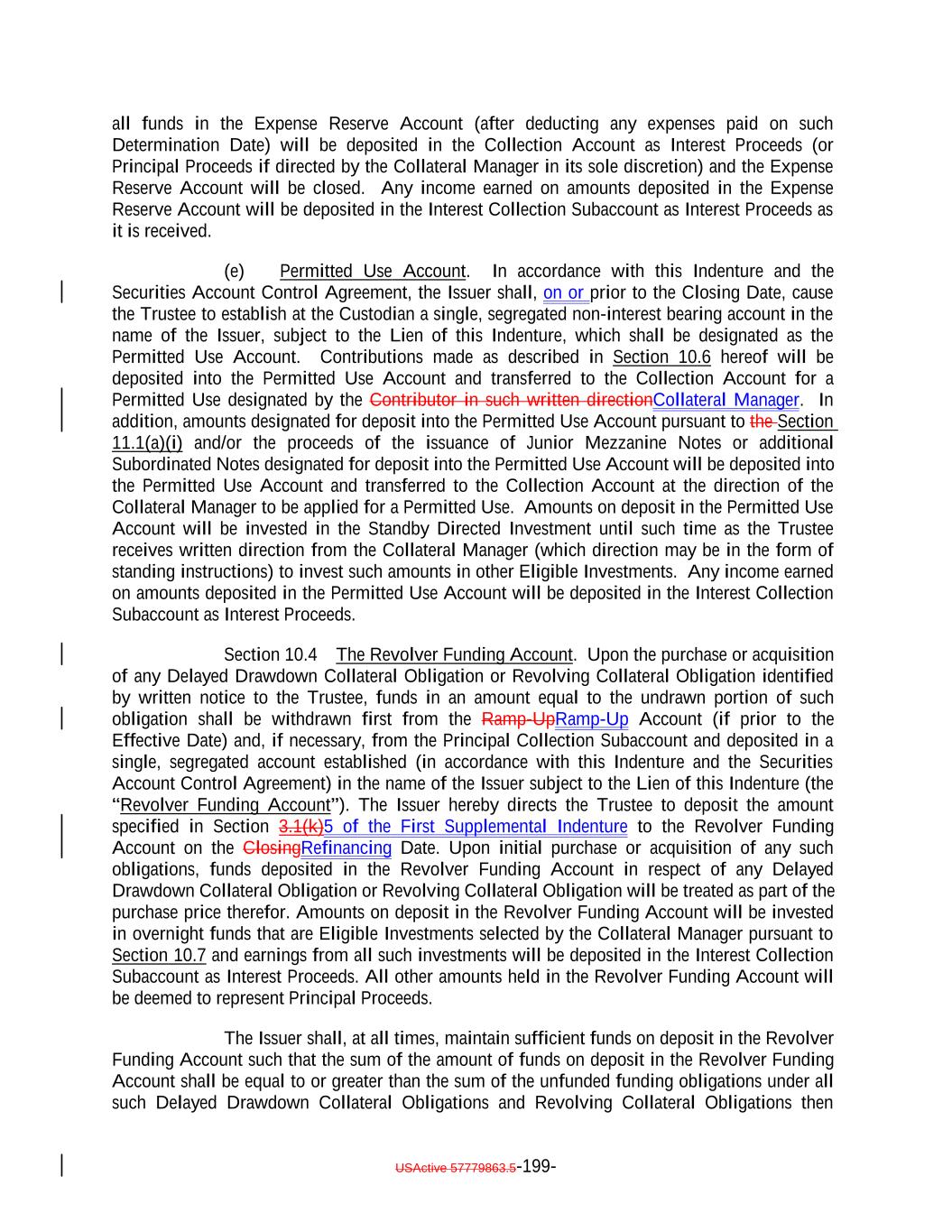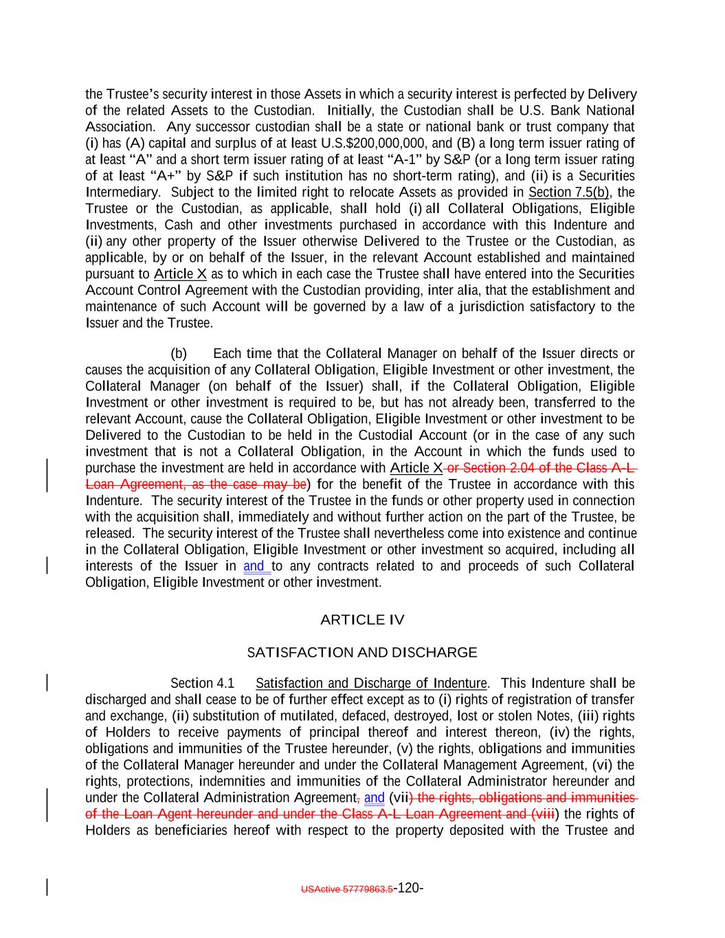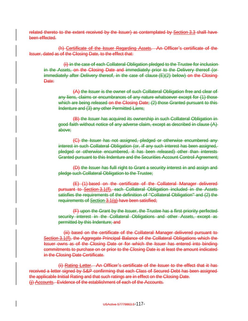 which deferred capitalized interest has not, as of the date of determination, been paid in Cash.; provided, that such Deferring Obligation will cease to be a Deferring Obligation at such time as it (i) ceases to defer or capitalize the payment of interest, (ii) pays in cash all accrued and unpaid interest, including all deferred amounts, and (iii) commences payment of all current interest in cash. “Delayed Drawdown Collateral Obligation”: A Collateral Obligation that (a) requires the Issuer to make one or more future advances to the borrower under the Underlying Documents relating thereto, (b) specifies a maximum amount that can be borrowed on one or more fixed borrowing dates, and (c) does not permit the re-borrowing of any amount previously repaid by the borrower thereunder; but any such Collateral Obligation will be a Delayed Drawdown Collateral Obligation only until all commitments by the Issuer to make advances to the borrower expire or are terminated or are reduced to zero. “Deliver” or “Delivered” or “Delivery”: The taking of the following steps: (i) in the case of each Certificated Security (other than a Clearing Corporation Security), Instrument and Participation Interest in which the underlying loan is represented by an Instrument, (a) causing the delivery of such Certificated Security or Instrument to the Custodian by registering the same in the name of the Custodian or its affiliated nominee or by endorsing the same to the Custodian or in blank; (b) causing the Custodian to indicate continuously on its books and records that such Certificated Security or Instrument is credited to the applicable Account; and (c) causing the Custodian to maintain continuous possession of such Certificated Security or Instrument; (ii) in the case of each Uncertificated Security (other than a Clearing Corporation Security), (a) causing such Uncertificated Security to be continuously registered on the books of the issuer thereof to the Custodian; and (b) causing the Custodian to indicate continuously on its books and records that such Uncertificated Security is credited to the applicable Account; (iii) in the case of each Clearing Corporation Security, (a) causing the relevant Clearing Corporation to credit such Clearing Corporation Security to the securities account of the Custodian; and (b) causing the Custodian to indicate continuously on its books and records that such Clearing Corporation Security is credited to the applicable Account; USActive 57779863.5-29-