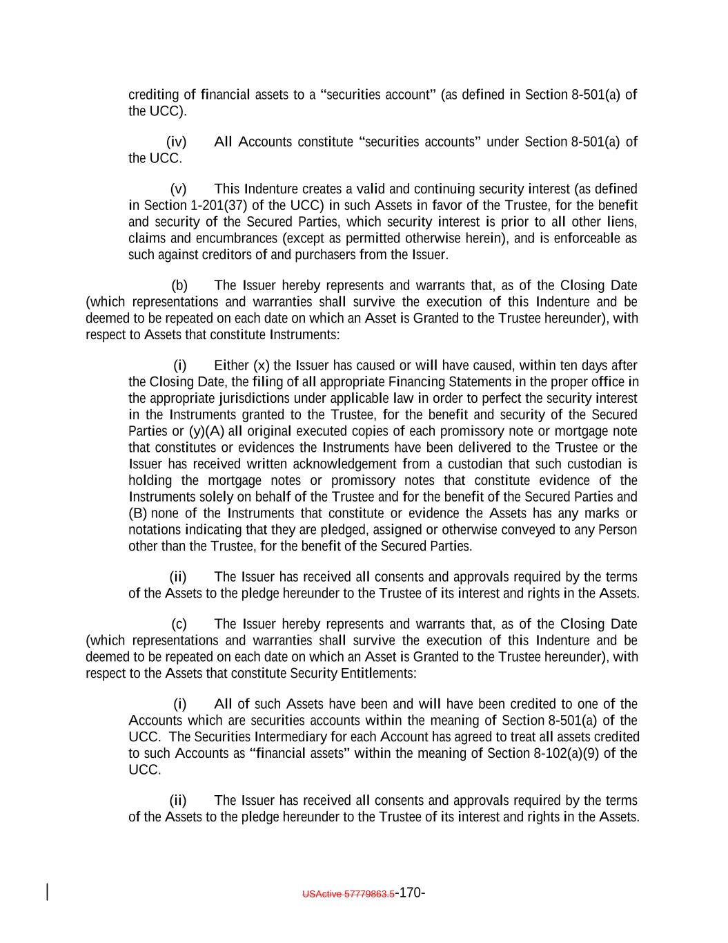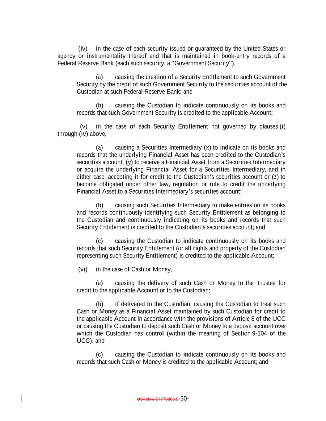 (iv) in the case of each security issued or guaranteed by the United States or agency or instrumentality thereof and that is maintained in book-entry records of a Federal Reserve Bank (each such security, a “Government Security”), (a) causing the creation of a Security Entitlement to such Government Security by the credit of such Government Security to the securities account of the Custodian at such Federal Reserve Bank; and (b) causing the Custodian to indicate continuously on its books and records that such Government Security is credited to the applicable Account; (v) in the case of each Security Entitlement not governed by clauses (i) through (iv) above, (a) causing a Securities Intermediary (x) to indicate on its books and records that the underlying Financial Asset has been credited to the Custodian’s securities account, (y) to receive a Financial Asset from a Securities Intermediary or acquire the underlying Financial Asset for a Securities Intermediary, and in either case, accepting it for credit to the Custodian’s securities account or (z) to become obligated under other law, regulation or rule to credit the underlying Financial Asset to a Securities Intermediary’s securities account; (b) causing such Securities Intermediary to make entries on its books and records continuously identifying such Security Entitlement as belonging to the Custodian and continuously indicating on its books and records that such Security Entitlement is credited to the Custodian’s securities account; and (c) causing the Custodian to indicate continuously on its books and records that such Security Entitlement (or all rights and property of the Custodian representing such Security Entitlement) is credited to the applicable Account; (vi) in the case of Cash or Money, (a) causing the delivery of such Cash or Money to the Trustee for credit to the applicable Account or to the Custodian; (b) if delivered to the Custodian, causing the Custodian to treat such Cash or Money as a Financial Asset maintained by such Custodian for credit to the applicable Account in accordance with the provisions of Article 8 of the UCC or causing the Custodian to deposit such Cash or Money to a deposit account over which the Custodian has control (within the meaning of Section 9-104 of the UCC); and (c) causing the Custodian to indicate continuously on its books and records that such Cash or Money is credited to the applicable Account; and USActive 57779863.5-30-