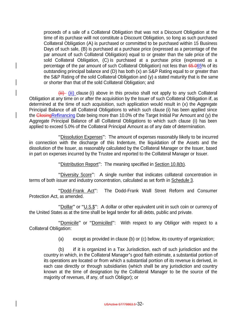 proceeds of a sale of a Collateral Obligation that was not a Discount Obligation at the time of its purchase will not constitute a Discount Obligation, so long as such purchased Collateral Obligation (A) is purchased or committed to be purchased within 15 Business Days of such sale, (B) is purchased at a purchase price (expressed as a percentage of the par amount of such Collateral Obligation) equal to or greater than the sale price of the sold Collateral Obligation, (C) is purchased at a purchase price (expressed as a percentage of the par amount of such Collateral Obligation) not less than 65.065% of its outstanding principal balance and (D) has both (x) an S&P Rating equal to or greater than the S&P Rating of the sold Collateral Obligation and (y) a stated maturity that is the same or shorter than that of the sold Collateral Obligation; and (ii) (ii) clause (i) above in this proviso shall not apply to any such Collateral Obligation at any time on or after the acquisition by the Issuer of such Collateral Obligation if, as determined at the time of such acquisition, such application would result in (x) the Aggregate Principal Balance of all Collateral Obligations to which such clause (i) has been applied since the ClosingRefinancing Date being more than 10.0% of the Target Initial Par Amount and (y) the Aggregate Principal Balance of all Collateral Obligations to which such clause (i) has been applied to exceed 5.0% of the Collateral Principal Amount as of any date of determination. “Dissolution Expenses”: The amount of expenses reasonably likely to be incurred in connection with the discharge of this Indenture, the liquidation of the Assets and the dissolution of the Issuer, as reasonably calculated by the Collateral Manager or the Issuer, based in part on expenses incurred by the Trustee and reported to the Collateral Manager or Issuer. “Distribution Report”: The meaning specified in Section 10.8(b). “Diversity Score”: A single number that indicates collateral concentration in terms of both issuer and industry concentration, calculated as set forth in Schedule 3. “Dodd-Frank Act”: The Dodd-Frank Wall Street Reform and Consumer Protection Act, as amended. “Dollar” or “U.S.$”: A dollar or other equivalent unit in such coin or currency of the United States as at the time shall be legal tender for all debts, public and private. “Domicile” or “Domiciled”: With respect to any Obligor with respect to a Collateral Obligation: (a) except as provided in clause (b) or (c) below, its country of organization; (b) if it is organized in a Tax Jurisdiction, each of such jurisdiction and the country in which, in the Collateral Manager’s good faith estimate, a substantial portion of its operations are located or from which a substantial portion of its revenue is derived, in each case directly or through subsidiaries (which shall be any jurisdiction and country known at the time of designation by the Collateral Manager to be the source of the majority of revenues, if any, of such Obligor); or USActive 57779863.5-32-