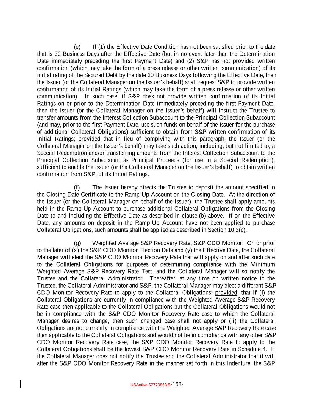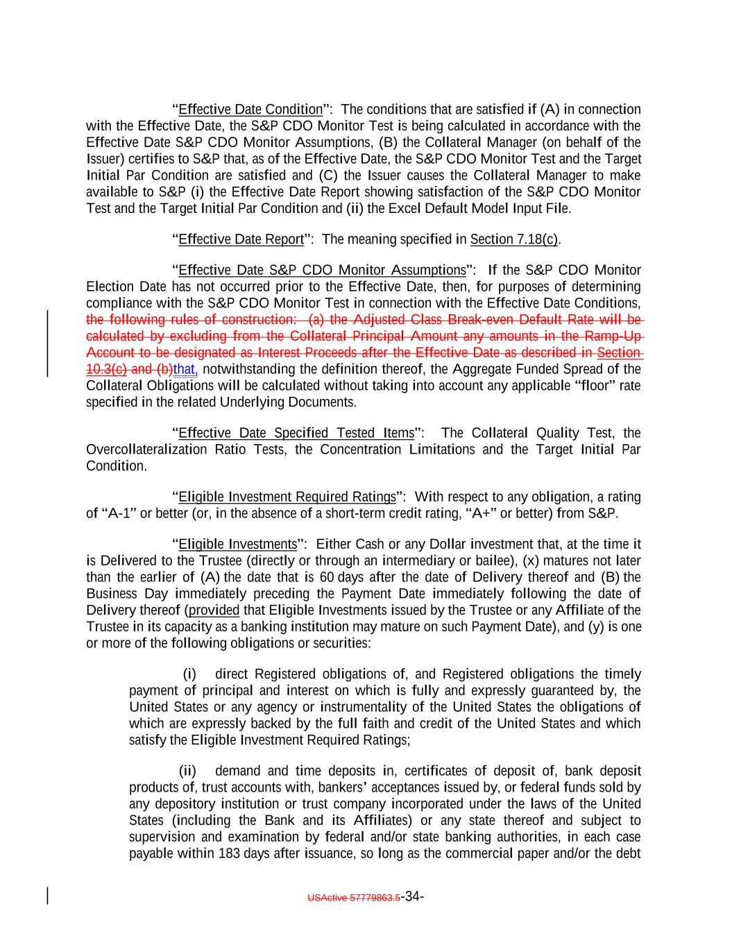 “Effective Date Condition”: The conditions that are satisfied if (A) in connection with the Effective Date, the S&P CDO Monitor Test is being calculated in accordance with the Effective Date S&P CDO Monitor Assumptions, (B) the Collateral Manager (on behalf of the Issuer) certifies to S&P that, as of the Effective Date, the S&P CDO Monitor Test and the Target Initial Par Condition are satisfied and (C) the Issuer causes the Collateral Manager to make available to S&P (i) the Effective Date Report showing satisfaction of the S&P CDO Monitor Test and the Target Initial Par Condition and (ii) the Excel Default Model Input File. “Effective Date Report”: The meaning specified in Section 7.18(c). “Effective Date S&P CDO Monitor Assumptions”: If the S&P CDO Monitor Election Date has not occurred prior to the Effective Date, then, for purposes of determining compliance with the S&P CDO Monitor Test in connection with the Effective Date Conditions, the following rules of construction: (a) the Adjusted Class Break-even Default Rate will be calculated by excluding from the Collateral Principal Amount any amounts in the Ramp-Up Account to be designated as Interest Proceeds after the Effective Date as described in Section 10.3(c) and (b)that, notwithstanding the definition thereof, the Aggregate Funded Spread of the Collateral Obligations will be calculated without taking into account any applicable “floor” rate specified in the related Underlying Documents. “Effective Date Specified Tested Items”: The Collateral Quality Test, the Overcollateralization Ratio Tests, the Concentration Limitations and the Target Initial Par Condition. “Eligible Investment Required Ratings”: With respect to any obligation, a rating of “A-1” or better (or, in the absence of a short-term credit rating, “A+” or better) from S&P. “Eligible Investments”: Either Cash or any Dollar investment that, at the time it is Delivered to the Trustee (directly or through an intermediary or bailee), (x) matures not later than the earlier of (A) the date that is 60 days after the date of Delivery thereof and (B) the Business Day immediately preceding the Payment Date immediately following the date of Delivery thereof (provided that Eligible Investments issued by the Trustee or any Affiliate of the Trustee in its capacity as a banking institution may mature on such Payment Date), and (y) is one or more of the following obligations or securities: (i) direct Registered obligations of, and Registered obligations the timely payment of principal and interest on which is fully and expressly guaranteed by, the United States or any agency or instrumentality of the United States the obligations of which are expressly backed by the full faith and credit of the United States and which satisfy the Eligible Investment Required Ratings; (ii) demand and time deposits in, certificates of deposit of, bank deposit products of, trust accounts with, bankers’ acceptances issued by, or federal funds sold by any depository institution or trust company incorporated under the laws of the United States (including the Bank and its Affiliates) or any state thereof and subject to supervision and examination by federal and/or state banking authorities, in each case payable within 183 days after issuance, so long as the commercial paper and/or the debt USActive 57779863.5-34-