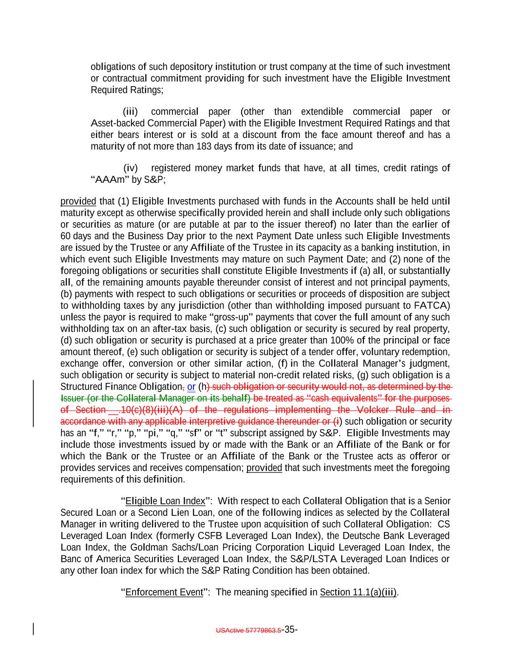 obligations of such depository institution or trust company at the time of such investment or contractual commitment providing for such investment have the Eligible Investment Required Ratings; (iii) commercial paper (other than extendible commercial paper or Asset-backed Commercial Paper) with the Eligible Investment Required Ratings and that either bears interest or is sold at a discount from the face amount thereof and has a maturity of not more than 183 days from its date of issuance; and (iv) registered money market funds that have, at all times, credit ratings of “AAAm” by S&P; provided that (1) Eligible Investments purchased with funds in the Accounts shall be held until maturity except as otherwise specifically provided herein and shall include only such obligations or securities as mature (or are putable at par to the issuer thereof) no later than the earlier of 60 days and the Business Day prior to the next Payment Date unless such Eligible Investments are issued by the Trustee or any Affiliate of the Trustee in its capacity as a banking institution, in which event such Eligible Investments may mature on such Payment Date; and (2) none of the foregoing obligations or securities shall constitute Eligible Investments if (a) all, or substantially all, of the remaining amounts payable thereunder consist of interest and not principal payments, (b) payments with respect to such obligations or securities or proceeds of disposition are subject to withholding taxes by any jurisdiction (other than withholding imposed pursuant to FATCA) unless the payor is required to make “gross-up” payments that cover the full amount of any such withholding tax on an after-tax basis, (c) such obligation or security is secured by real property, (d) such obligation or security is purchased at a price greater than 100% of the principal or face amount thereof, (e) such obligation or security is subject of a tender offer, voluntary redemption, exchange offer, conversion or other similar action, (f) in the Collateral Manager’s judgment, such obligation or security is subject to material non-credit related risks, (g) such obligation is a Structured Finance Obligation, or (h) such obligation or security would not, as determined by the Issuer (or the Collateral Manager on its behalf) be treated as “cash equivalents” for the purposes of Section __.10(c)(8)(iii)(A) of the regulations implementing the Volcker Rule and in accordance with any applicable interpretive guidance thereunder or (i) such obligation or security has an “f,” “r,” “p,” “pi,” “q,” “sf” or “t” subscript assigned by S&P. Eligible Investments may include those investments issued by or made with the Bank or an Affiliate of the Bank or for which the Bank or the Trustee or an Affiliate of the Bank or the Trustee acts as offeror or provides services and receives compensation; provided that such investments meet the foregoing requirements of this definition. “Eligible Loan Index”: With respect to each Collateral Obligation that is a Senior Secured Loan or a Second Lien Loan, one of the following indices as selected by the Collateral Manager in writing delivered to the Trustee upon acquisition of such Collateral Obligation: CS Leveraged Loan Index (formerly CSFB Leveraged Loan Index), the Deutsche Bank Leveraged Loan Index, the Goldman Sachs/Loan Pricing Corporation Liquid Leveraged Loan Index, the Banc of America Securities Leveraged Loan Index, the S&P/LSTA Leveraged Loan Indices or any other loan index for which the S&P Rating Condition has been obtained. “Enforcement Event”: The meaning specified in Section 11.1(a)(iii). USActive 57779863.5-35-