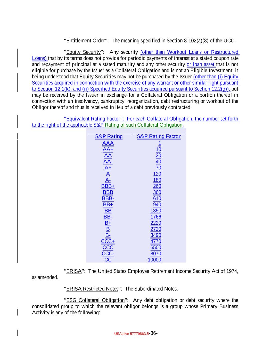 USActive 57779863.5-36- 1 BBB- 40 610 S&P Rating BB+ 940 A+ BB 70 1350 AA+ BB- S&P Rating Factor 1766 A 10 B+ 120 2220 “Entitlement Order”: The meaning specified in Section 8-102(a)(8) of the UCC. “Equity Security”: Any security (other than Workout Loans or Restructured Loans) that by its terms does not provide for periodic payments of interest at a stated coupon rate and repayment of principal at a stated maturity and any other security or loan asset that is not eligible for purchase by the Issuer as a Collateral Obligation and is not an Eligible Investment; it being understood that Equity Securities may not be purchased by the Issuer (other than (i) Equity Securities acquired in connection with the exercise of any warrant or other similar right pursuant to Section 12.1(k), and (ii) Specified Equity Securities acquired pursuant to Section 12.2(g)), but may be received by the Issuer in exchange for a Collateral Obligation or a portion thereof in connection with an insolvency, bankruptcy, reorganization, debt restructuring or workout of the Obligor thereof and thus is received in lieu of a debt previously contracted. “Equivalent Rating Factor”: For each Collateral Obligation, the number set forth to the right of the applicable S&P Rating of such Collateral Obligation: B 2720 A- B- 180 3490 AA CCC+ 4770 BBB+ 20 CCC 260 6500 AAA CCC- 8070 BBB CC 360 10000 AA- “ERISA”: The United States Employee Retirement Income Security Act of 1974, as amended. “ERISA Restricted Notes”: The Subordinated Notes. “ESG Collateral Obligation”: Any debt obligation or debt security where the consolidated group to which the relevant obligor belongs is a group whose Primary Business Activity is any of the following: