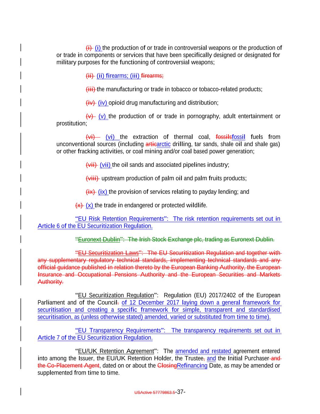 (i) (i) the production of or trade in controversial weapons or the production of or trade in components or services that have been specifically designed or designated for military purposes for the functioning of controversial weapons; (ii) (ii) firearms; (iii) firearms; (iii) the manufacturing or trade in tobacco or tobacco-related products; (iv) (iv) opioid drug manufacturing and distribution; (v) (v) the production of or trade in pornography, adult entertainment or prostitution; (vi) (vi) the extraction of thermal coal, fossilsfossil fuels from unconventional sources (including articarctic drilling, tar sands, shale oil and shale gas) or other fracking activities, or coal mining and/or coal based power generation; (vii) (vii) the oil sands and associated pipelines industry; (viii) upstream production of palm oil and palm fruits products; (ix) (ix) the provision of services relating to payday lending; and (x) (x) the trade in endangered or protected wildlife. “EU Risk Retention Requirements”: The risk retention requirements set out in Article 6 of the EU Securitization Regulation. “Euronext Dublin”: The Irish Stock Exchange plc, trading as Euronext Dublin. “EU Securitization Laws”: The EU Securitization Regulation and together with any supplementary regulatory technical standards, implementing technical standards and any official guidance published in relation thereto by the European Banking Authority, the European Insurance and Occupational Pensions Authority and the European Securities and Markets Authority. “EU Securitization Regulation”: Regulation (EU) 2017/2402 of the European Parliament and of the Council. of 12 December 2017 laying down a general framework for securitisation and creating a specific framework for simple, transparent and standardised securitisation, as (unless otherwise stated) amended, varied or substituted from time to time). “EU Transparency Requirements”: The transparency requirements set out in Article 7 of the EU Securitization Regulation. “EU/UK Retention Agreement”: The amended and restated agreement entered into among the Issuer, the EU/UK Retention Holder, the Trustee, and the Initial Purchaser and the Co-Placement Agent, dated on or about the ClosingRefinancing Date, as may be amended or supplemented from time to time. USActive 57779863.5-37-