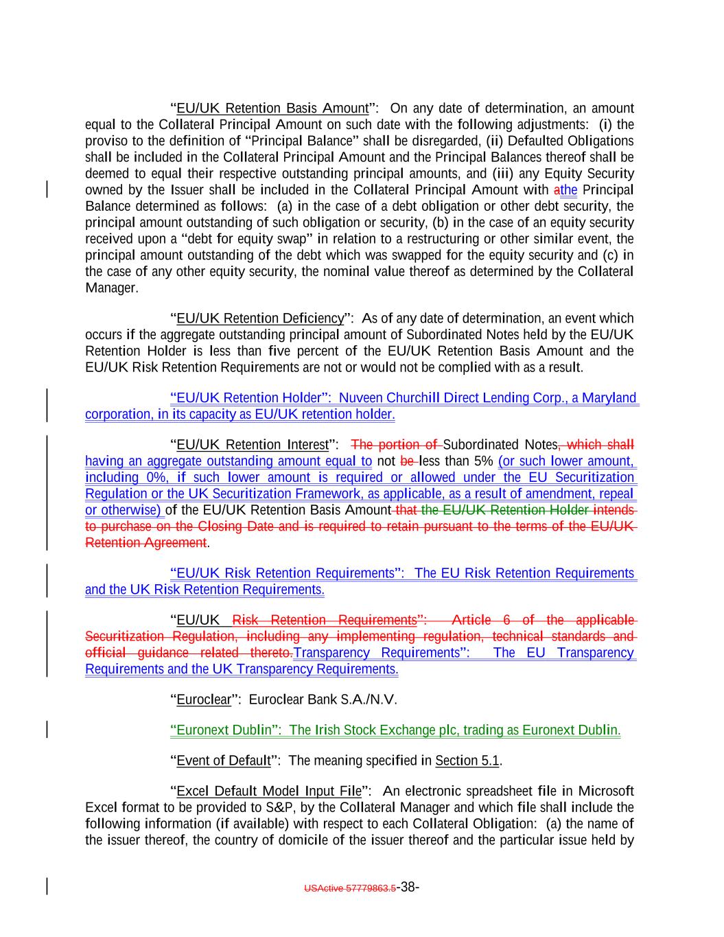 “EU/UK Retention Basis Amount”: On any date of determination, an amount equal to the Collateral Principal Amount on such date with the following adjustments: (i) the proviso to the definition of “Principal Balance” shall be disregarded, (ii) Defaulted Obligations shall be included in the Collateral Principal Amount and the Principal Balances thereof shall be deemed to equal their respective outstanding principal amounts, and (iii) any Equity Security owned by the Issuer shall be included in the Collateral Principal Amount with athe Principal Balance determined as follows: (a) in the case of a debt obligation or other debt security, the principal amount outstanding of such obligation or security, (b) in the case of an equity security received upon a “debt for equity swap” in relation to a restructuring or other similar event, the principal amount outstanding of the debt which was swapped for the equity security and (c) in the case of any other equity security, the nominal value thereof as determined by the Collateral Manager. “EU/UK Retention Deficiency”: As of any date of determination, an event which occurs if the aggregate outstanding principal amount of Subordinated Notes held by the EU/UK Retention Holder is less than five percent of the EU/UK Retention Basis Amount and the EU/UK Risk Retention Requirements are not or would not be complied with as a result. “EU/UK Retention Holder”: Nuveen Churchill Direct Lending Corp., a Maryland corporation, in its capacity as EU/UK retention holder. “EU/UK Retention Interest”: The portion of Subordinated Notes, which shall having an aggregate outstanding amount equal to not be less than 5% (or such lower amount, including 0%, if such lower amount is required or allowed under the EU Securitization Regulation or the UK Securitization Framework, as applicable, as a result of amendment, repeal or otherwise) of the EU/UK Retention Basis Amount that the EU/UK Retention Holder intends to purchase on the Closing Date and is required to retain pursuant to the terms of the EU/UK Retention Agreement. “EU/UK Risk Retention Requirements”: The EU Risk Retention Requirements and the UK Risk Retention Requirements. “EU/UK Risk Retention Requirements”: Article 6 of the applicable Securitization Regulation, including any implementing regulation, technical standards and official guidance related thereto.Transparency Requirements”: The EU Transparency Requirements and the UK Transparency Requirements. “Euroclear”: Euroclear Bank S.A./N.V. “Euronext Dublin”: The Irish Stock Exchange plc, trading as Euronext Dublin. “Event of Default”: The meaning specified in Section 5.1. “Excel Default Model Input File”: An electronic spreadsheet file in Microsoft Excel format to be provided to S&P, by the Collateral Manager and which file shall include the following information (if available) with respect to each Collateral Obligation: (a) the name of the issuer thereof, the country of domicile of the issuer thereof and the particular issue held by USActive 57779863.5-38-