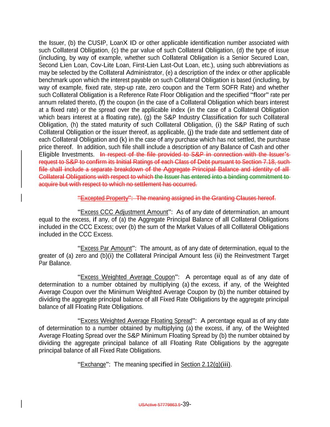 the Issuer, (b) the CUSIP, LoanX ID or other applicable identification number associated with such Collateral Obligation, (c) the par value of such Collateral Obligation, (d) the type of issue (including, by way of example, whether such Collateral Obligation is a Senior Secured Loan, Second Lien Loan, Cov-Lite Loan, First-Lien Last-Out Loan, etc.), using such abbreviations as may be selected by the Collateral Administrator, (e) a description of the index or other applicable benchmark upon which the interest payable on such Collateral Obligation is based (including, by way of example, fixed rate, step-up rate, zero coupon and the Term SOFR Rate) and whether such Collateral Obligation is a Reference Rate Floor Obligation and the specified “floor” rate per annum related thereto, (f) the coupon (in the case of a Collateral Obligation which bears interest at a fixed rate) or the spread over the applicable index (in the case of a Collateral Obligation which bears interest at a floating rate), (g) the S&P Industry Classification for such Collateral Obligation, (h) the stated maturity of such Collateral Obligation, (i) the S&P Rating of such Collateral Obligation or the issuer thereof, as applicable, (j) the trade date and settlement date of each Collateral Obligation and (k) in the case of any purchase which has not settled, the purchase price thereof. In addition, such file shall include a description of any Balance of Cash and other Eligible Investments. In respect of the file provided to S&P in connection with the Issuer’s request to S&P to confirm its Initial Ratings of each Class of Debt pursuant to Section 7.18, such file shall include a separate breakdown of the Aggregate Principal Balance and identity of all Collateral Obligations with respect to which the Issuer has entered into a binding commitment to acquire but with respect to which no settlement has occurred. “Excepted Property”: The meaning assigned in the Granting Clauses hereof. “Excess CCC Adjustment Amount”: As of any date of determination, an amount equal to the excess, if any, of (a) the Aggregate Principal Balance of all Collateral Obligations included in the CCC Excess; over (b) the sum of the Market Values of all Collateral Obligations included in the CCC Excess. “Excess Par Amount”: The amount, as of any date of determination, equal to the greater of (a) zero and (b)(i) the Collateral Principal Amount less (ii) the Reinvestment Target Par Balance. “Excess Weighted Average Coupon”: A percentage equal as of any date of determination to a number obtained by multiplying (a) the excess, if any, of the Weighted Average Coupon over the Minimum Weighted Average Coupon by (b) the number obtained by dividing the aggregate principal balance of all Fixed Rate Obligations by the aggregate principal balance of all Floating Rate Obligations. “Excess Weighted Average Floating Spread”: A percentage equal as of any date of determination to a number obtained by multiplying (a) the excess, if any, of the Weighted Average Floating Spread over the S&P Minimum Floating Spread by (b) the number obtained by dividing the aggregate principal balance of all Floating Rate Obligations by the aggregate principal balance of all Fixed Rate Obligations. “Exchange”: The meaning specified in Section 2.12(g)(iii). USActive 57779863.5-39-