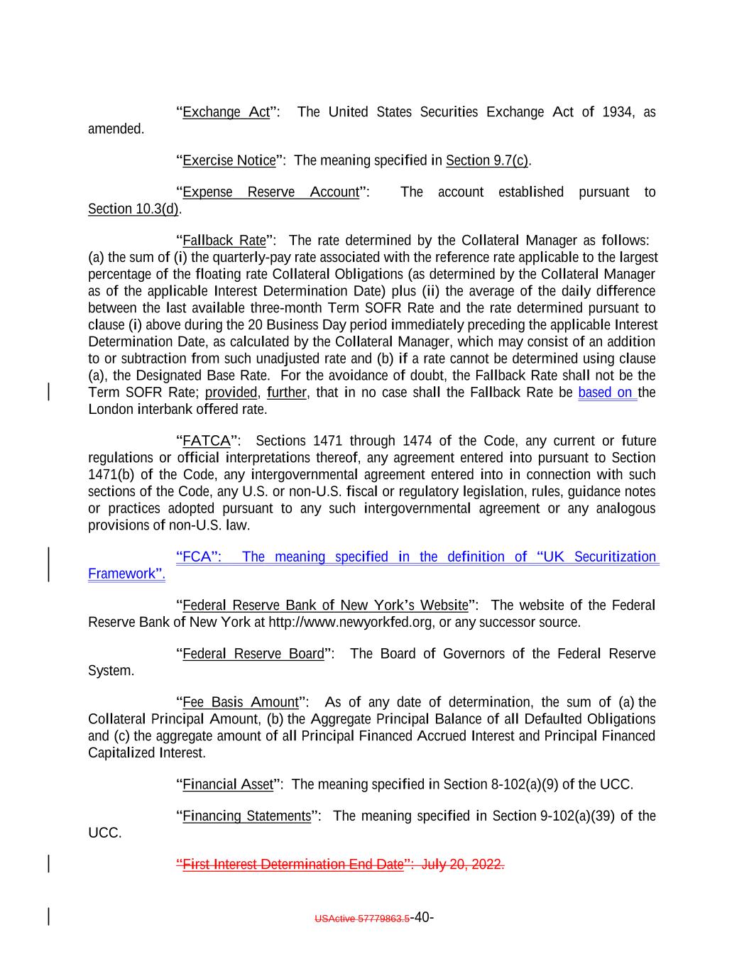 “Exchange Act”: The United States Securities Exchange Act of 1934, as amended. “Exercise Notice”: The meaning specified in Section 9.7(c). “Expense Reserve Account”: The account established pursuant to Section 10.3(d). “Fallback Rate”: The rate determined by the Collateral Manager as follows: (a) the sum of (i) the quarterly-pay rate associated with the reference rate applicable to the largest percentage of the floating rate Collateral Obligations (as determined by the Collateral Manager as of the applicable Interest Determination Date) plus (ii) the average of the daily difference between the last available three-month Term SOFR Rate and the rate determined pursuant to clause (i) above during the 20 Business Day period immediately preceding the applicable Interest Determination Date, as calculated by the Collateral Manager, which may consist of an addition to or subtraction from such unadjusted rate and (b) if a rate cannot be determined using clause (a), the Designated Base Rate. For the avoidance of doubt, the Fallback Rate shall not be the Term SOFR Rate; provided, further, that in no case shall the Fallback Rate be based on the London interbank offered rate. “FATCA”: Sections 1471 through 1474 of the Code, any current or future regulations or official interpretations thereof, any agreement entered into pursuant to Section 1471(b) of the Code, any intergovernmental agreement entered into in connection with such sections of the Code, any U.S. or non-U.S. fiscal or regulatory legislation, rules, guidance notes or practices adopted pursuant to any such intergovernmental agreement or any analogous provisions of non-U.S. law. “FCA”: The meaning specified in the definition of “UK Securitization Framework”. “Federal Reserve Bank of New York’s Website”: The website of the Federal Reserve Bank of New York at http://www.newyorkfed.org, or any successor source. “Federal Reserve Board”: The Board of Governors of the Federal Reserve System. “Fee Basis Amount”: As of any date of determination, the sum of (a) the Collateral Principal Amount, (b) the Aggregate Principal Balance of all Defaulted Obligations and (c) the aggregate amount of all Principal Financed Accrued Interest and Principal Financed Capitalized Interest. “Financial Asset”: The meaning specified in Section 8-102(a)(9) of the UCC. “Financing Statements”: The meaning specified in Section 9-102(a)(39) of the UCC. “First Interest Determination End Date”: July 20, 2022. USActive 57779863.5-40-