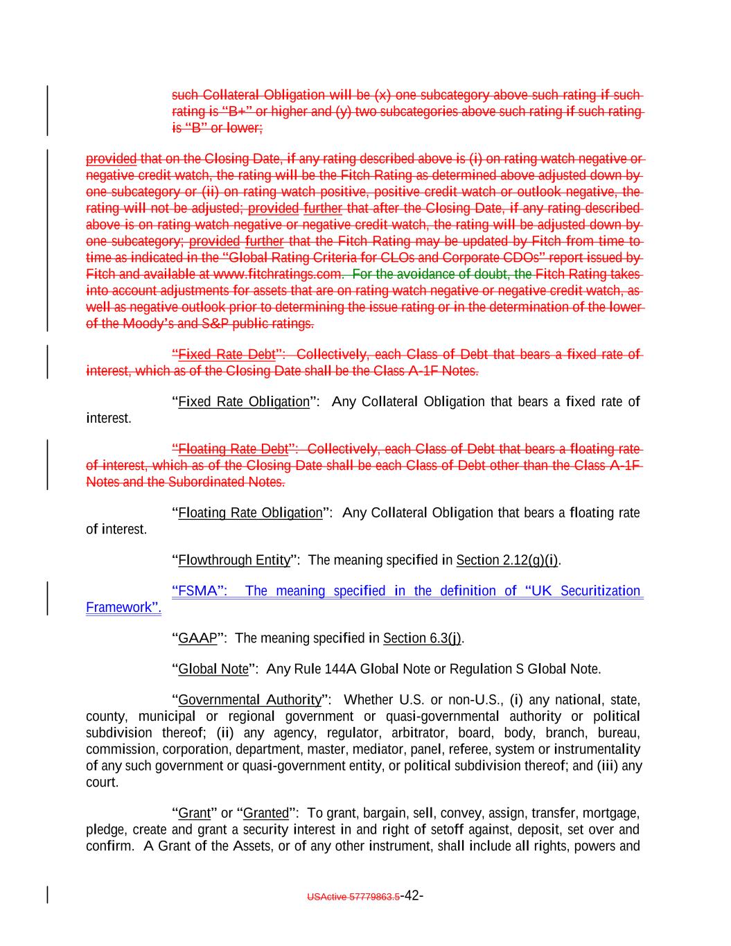 such Collateral Obligation will be (x) one subcategory above such rating if such rating is “B+” or higher and (y) two subcategories above such rating if such rating is “B” or lower; provided that on the Closing Date, if any rating described above is (i) on rating watch negative or negative credit watch, the rating will be the Fitch Rating as determined above adjusted down by one subcategory or (ii) on rating watch positive, positive credit watch or outlook negative, the rating will not be adjusted; provided further that after the Closing Date, if any rating described above is on rating watch negative or negative credit watch, the rating will be adjusted down by one subcategory; provided further that the Fitch Rating may be updated by Fitch from time to time as indicated in the “Global Rating Criteria for CLOs and Corporate CDOs” report issued by Fitch and available at www.fitchratings.com. For the avoidance of doubt, the Fitch Rating takes into account adjustments for assets that are on rating watch negative or negative credit watch, as well as negative outlook prior to determining the issue rating or in the determination of the lower of the Moody’s and S&P public ratings. “Fixed Rate Debt”: Collectively, each Class of Debt that bears a fixed rate of interest, which as of the Closing Date shall be the Class A-1F Notes. “Fixed Rate Obligation”: Any Collateral Obligation that bears a fixed rate of interest. “Floating Rate Debt”: Collectively, each Class of Debt that bears a floating rate of interest, which as of the Closing Date shall be each Class of Debt other than the Class A-1F Notes and the Subordinated Notes. “Floating Rate Obligation”: Any Collateral Obligation that bears a floating rate of interest. “Flowthrough Entity”: The meaning specified in Section 2.12(g)(i). “FSMA”: The meaning specified in the definition of “UK Securitization Framework”. “GAAP”: The meaning specified in Section 6.3(j). “Global Note”: Any Rule 144A Global Note or Regulation S Global Note. “Governmental Authority”: Whether U.S. or non-U.S., (i) any national, state, county, municipal or regional government or quasi-governmental authority or political subdivision thereof; (ii) any agency, regulator, arbitrator, board, body, branch, bureau, commission, corporation, department, master, mediator, panel, referee, system or instrumentality of any such government or quasi-government entity, or political subdivision thereof; and (iii) any court. “Grant” or “Granted”: To grant, bargain, sell, convey, assign, transfer, mortgage, pledge, create and grant a security interest in and right of setoff against, deposit, set over and confirm. A Grant of the Assets, or of any other instrument, shall include all rights, powers and USActive 57779863.5-42-