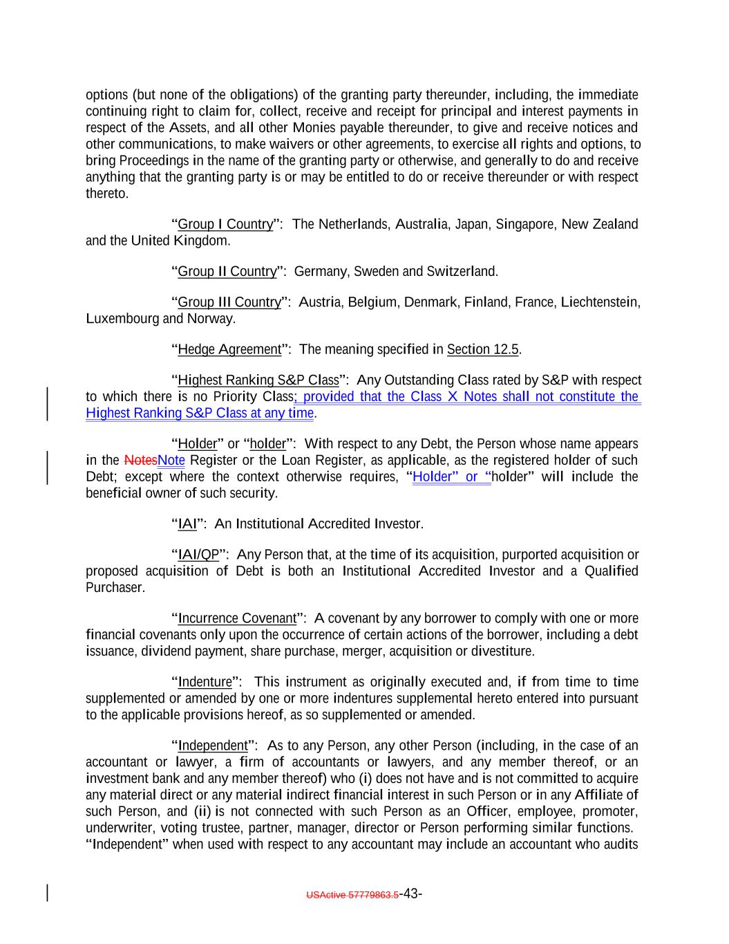 options (but none of the obligations) of the granting party thereunder, including, the immediate continuing right to claim for, collect, receive and receipt for principal and interest payments in respect of the Assets, and all other Monies payable thereunder, to give and receive notices and other communications, to make waivers or other agreements, to exercise all rights and options, to bring Proceedings in the name of the granting party or otherwise, and generally to do and receive anything that the granting party is or may be entitled to do or receive thereunder or with respect thereto. “Group I Country”: The Netherlands, Australia, Japan, Singapore, New Zealand and the United Kingdom. “Group II Country”: Germany, Sweden and Switzerland. “Group III Country”: Austria, Belgium, Denmark, Finland, France, Liechtenstein, Luxembourg and Norway. “Hedge Agreement”: The meaning specified in Section 12.5. “Highest Ranking S&P Class”: Any Outstanding Class rated by S&P with respect to which there is no Priority Class; provided that the Class X Notes shall not constitute the Highest Ranking S&P Class at any time. “Holder” or “holder”: With respect to any Debt, the Person whose name appears in the NotesNote Register or the Loan Register, as applicable, as the registered holder of such Debt; except where the context otherwise requires, “Holder” or “holder” will include the beneficial owner of such security. “IAI”: An Institutional Accredited Investor. “IAI/QP”: Any Person that, at the time of its acquisition, purported acquisition or proposed acquisition of Debt is both an Institutional Accredited Investor and a Qualified Purchaser. “Incurrence Covenant”: A covenant by any borrower to comply with one or more financial covenants only upon the occurrence of certain actions of the borrower, including a debt issuance, dividend payment, share purchase, merger, acquisition or divestiture. “Indenture”: This instrument as originally executed and, if from time to time supplemented or amended by one or more indentures supplemental hereto entered into pursuant to the applicable provisions hereof, as so supplemented or amended. “Independent”: As to any Person, any other Person (including, in the case of an accountant or lawyer, a firm of accountants or lawyers, and any member thereof, or an investment bank and any member thereof) who (i) does not have and is not committed to acquire any material direct or any material indirect financial interest in such Person or in any Affiliate of such Person, and (ii) is not connected with such Person as an Officer, employee, promoter, underwriter, voting trustee, partner, manager, director or Person performing similar functions. “Independent” when used with respect to any accountant may include an accountant who audits USActive 57779863.5-43-