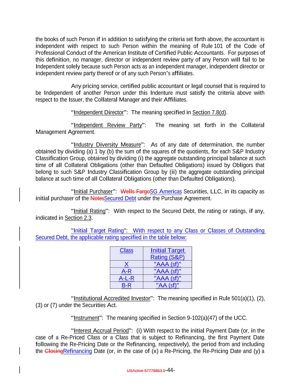 USActive 57779863.5-44- A-R Initial Target Rating (S&P) "AAA (sf)" the books of such Person if in addition to satisfying the criteria set forth above, the accountant is independent with respect to such Person within the meaning of Rule 101 of the Code of Professional Conduct of the American Institute of Certified Public Accountants. For purposes of this definition, no manager, director or independent review party of any Person will fail to be Independent solely because such Person acts as an independent manager, independent director or independent review party thereof or of any such Person’s affiliates. Any pricing service, certified public accountant or legal counsel that is required to be Independent of another Person under this Indenture must satisfy the criteria above with respect to the Issuer, the Collateral Manager and their Affiliates. “Independent Director”: The meaning specified in Section 7.8(d). “Independent Review Party”: The meaning set forth in the Collateral Management Agreement. “Industry Diversity Measure”: As of any date of determination, the number obtained by dividing (a) 1 by (b) the sum of the squares of the quotients, for each S&P Industry Classification Group, obtained by dividing (i) the aggregate outstanding principal balance at such time of all Collateral Obligations (other than Defaulted Obligations) issued by Obligors that belong to such S&P Industry Classification Group by (ii) the aggregate outstanding principal balance at such time of all Collateral Obligations (other than Defaulted Obligations). “Initial Purchaser”: Wells FargoSG Americas Securities, LLC, in its capacity as initial purchaser of the NotesSecured Debt under the Purchase Agreement. “Initial Rating”: With respect to the Secured Debt, the rating or ratings, if any, indicated in Section 2.3. "Initial Target Rating": With respect to any Class or Classes of Outstanding Secured Debt, the applicable rating specified in the table below: A-L-R "AAA (sf)" X B-R "AAA (sf)" "AA (sf)" Class “Institutional Accredited Investor”: The meaning specified in Rule 501(a)(1), (2), (3) or (7) under the Securities Act. “Instrument”: The meaning specified in Section 9-102(a)(47) of the UCC. “Interest Accrual Period”: (i) With respect to the initial Payment Date (or, in the case of a Re-Priced Class or a Class that is subject to Refinancing, the first Payment Date following the Re-Pricing Date or the Refinancing, respectively), the period from and including the ClosingRefinancing Date (or, in the case of (x) a Re-Pricing, the Re-Pricing Date and (y) a