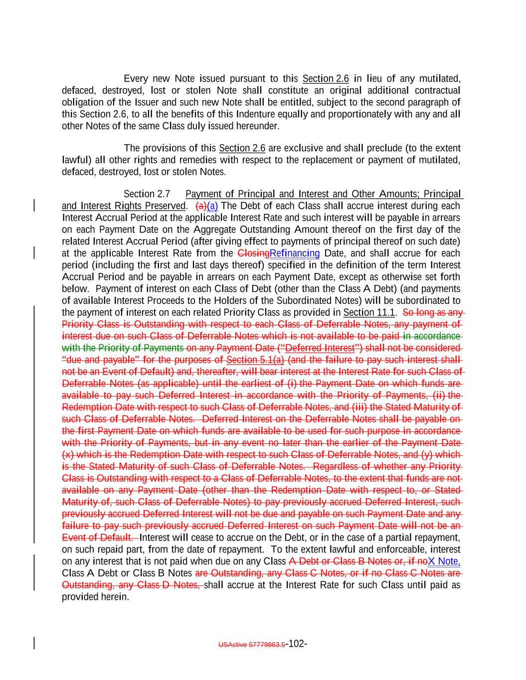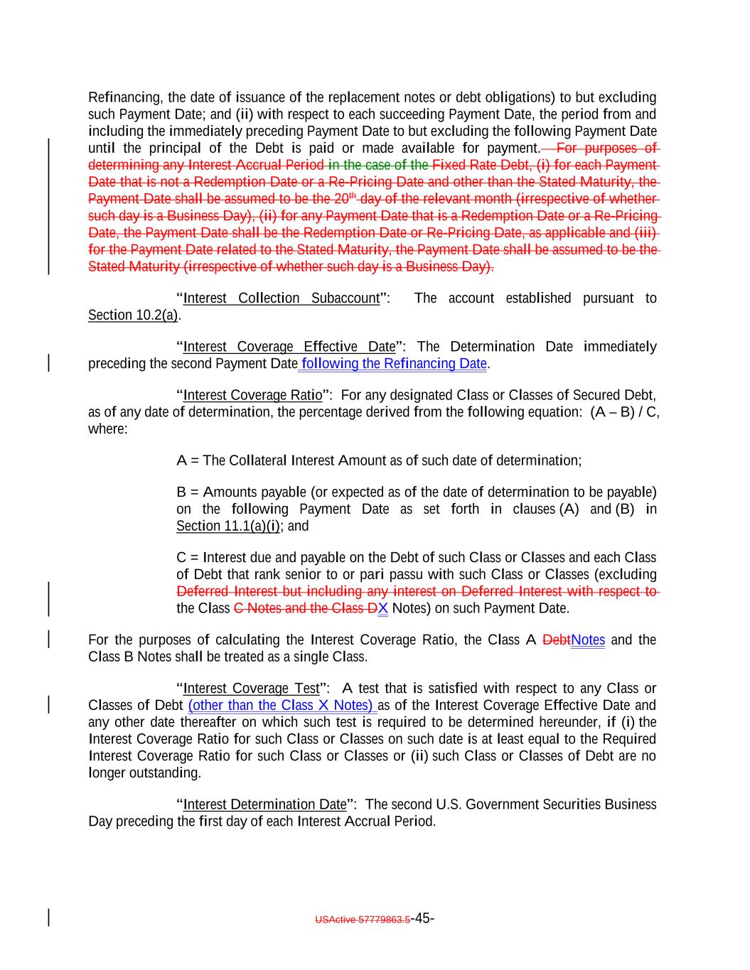 Refinancing, the date of issuance of the replacement notes or debt obligations) to but excluding such Payment Date; and (ii) with respect to each succeeding Payment Date, the period from and including the immediately preceding Payment Date to but excluding the following Payment Date until the principal of the Debt is paid or made available for payment. For purposes of determining any Interest Accrual Period in the case of the Fixed Rate Debt, (i) for each Payment Date that is not a Redemption Date or a Re-Pricing Date and other than the Stated Maturity, the Payment Date shall be assumed to be the 20th day of the relevant month (irrespective of whether such day is a Business Day), (ii) for any Payment Date that is a Redemption Date or a Re-Pricing Date, the Payment Date shall be the Redemption Date or Re-Pricing Date, as applicable and (iii) for the Payment Date related to the Stated Maturity, the Payment Date shall be assumed to be the Stated Maturity (irrespective of whether such day is a Business Day). “Interest Collection Subaccount”: The account established pursuant to Section 10.2(a). “Interest Coverage Effective Date”: The Determination Date immediately preceding the second Payment Date following the Refinancing Date. “Interest Coverage Ratio”: For any designated Class or Classes of Secured Debt, as of any date of determination, the percentage derived from the following equation: (A – B) / C, where: A = The Collateral Interest Amount as of such date of determination; B = Amounts payable (or expected as of the date of determination to be payable) on the following Payment Date as set forth in clauses (A) and (B) in Section 11.1(a)(i); and C = Interest due and payable on the Debt of such Class or Classes and each Class of Debt that rank senior to or pari passu with such Class or Classes (excluding Deferred Interest but including any interest on Deferred Interest with respect to the Class C Notes and the Class DX Notes) on such Payment Date. For the purposes of calculating the Interest Coverage Ratio, the Class A DebtNotes and the Class B Notes shall be treated as a single Class. “Interest Coverage Test”: A test that is satisfied with respect to any Class or Classes of Debt (other than the Class X Notes) as of the Interest Coverage Effective Date and any other date thereafter on which such test is required to be determined hereunder, if (i) the Interest Coverage Ratio for such Class or Classes on such date is at least equal to the Required Interest Coverage Ratio for such Class or Classes or (ii) such Class or Classes of Debt are no longer outstanding. “Interest Determination Date”: The second U.S. Government Securities Business Day preceding the first day of each Interest Accrual Period. USActive 57779863.5-45-