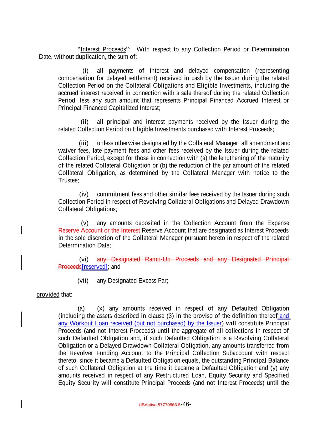 “Interest Proceeds”: With respect to any Collection Period or Determination Date, without duplication, the sum of: (i) all payments of interest and delayed compensation (representing compensation for delayed settlement) received in cash by the Issuer during the related Collection Period on the Collateral Obligations and Eligible Investments, including the accrued interest received in connection with a sale thereof during the related Collection Period, less any such amount that represents Principal Financed Accrued Interest or Principal Financed Capitalized Interest; (ii) all principal and interest payments received by the Issuer during the related Collection Period on Eligible Investments purchased with Interest Proceeds; (iii) unless otherwise designated by the Collateral Manager, all amendment and waiver fees, late payment fees and other fees received by the Issuer during the related Collection Period, except for those in connection with (a) the lengthening of the maturity of the related Collateral Obligation or (b) the reduction of the par amount of the related Collateral Obligation, as determined by the Collateral Manager with notice to the Trustee; (iv) commitment fees and other similar fees received by the Issuer during such Collection Period in respect of Revolving Collateral Obligations and Delayed Drawdown Collateral Obligations; (v) any amounts deposited in the Collection Account from the Expense Reserve Account or the Interest Reserve Account that are designated as Interest Proceeds in the sole discretion of the Collateral Manager pursuant hereto in respect of the related Determination Date; (vi) any Designated Ramp-Up Proceeds and any Designated Principal Proceeds[reserved]; and (vii) any Designated Excess Par; provided that: (a) (x) any amounts received in respect of any Defaulted Obligation (including the assets described in clause (3) in the proviso of the definition thereof and any Workout Loan received (but not purchased) by the Issuer) will constitute Principal Proceeds (and not Interest Proceeds) until the aggregate of all collections in respect of such Defaulted Obligation and, if such Defaulted Obligation is a Revolving Collateral Obligation or a Delayed Drawdown Collateral Obligation, any amounts transferred from the Revolver Funding Account to the Principal Collection Subaccount with respect thereto, since it became a Defaulted Obligation equals, the outstanding Principal Balance of such Collateral Obligation at the time it became a Defaulted Obligation and (y) any amounts received in respect of any Restructured Loan, Equity Security and Specified Equity Security will constitute Principal Proceeds (and not Interest Proceeds) until the USActive 57779863.5-46-