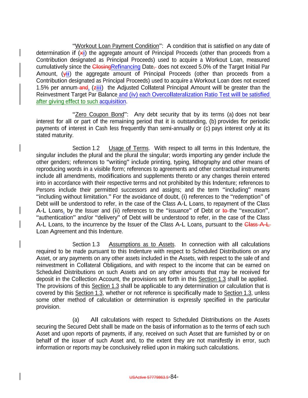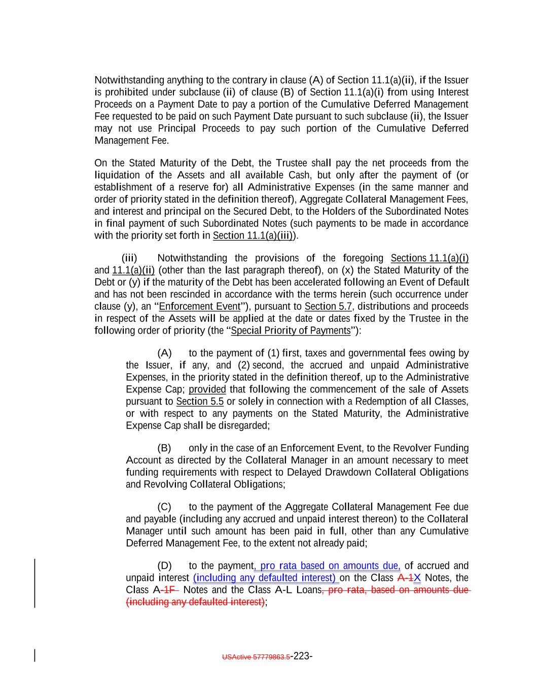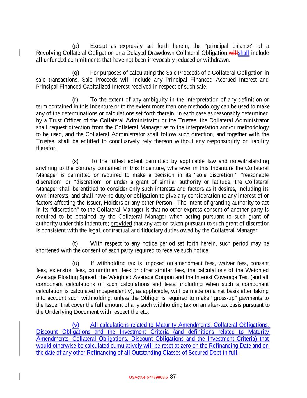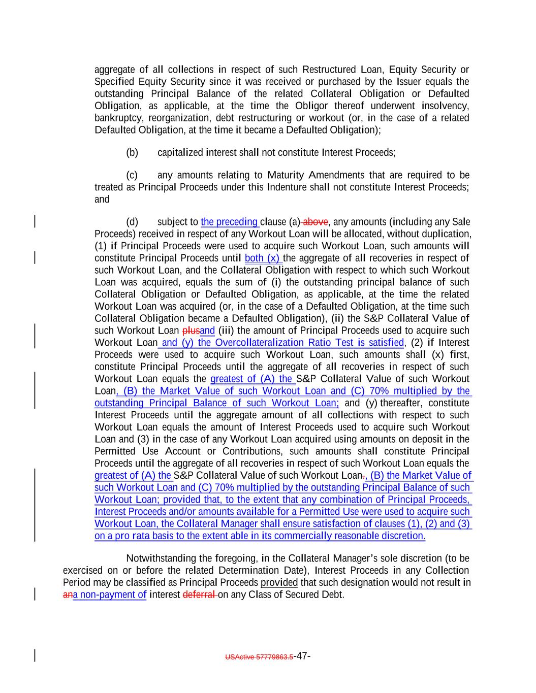aggregate of all collections in respect of such Restructured Loan, Equity Security or Specified Equity Security since it was received or purchased by the Issuer equals the outstanding Principal Balance of the related Collateral Obligation or Defaulted Obligation, as applicable, at the time the Obligor thereof underwent insolvency, bankruptcy, reorganization, debt restructuring or workout (or, in the case of a related Defaulted Obligation, at the time it became a Defaulted Obligation); (b) capitalized interest shall not constitute Interest Proceeds; (c) any amounts relating to Maturity Amendments that are required to be treated as Principal Proceeds under this Indenture shall not constitute Interest Proceeds; and (d) subject to the preceding clause (a) above, any amounts (including any Sale Proceeds) received in respect of any Workout Loan will be allocated, without duplication, (1) if Principal Proceeds were used to acquire such Workout Loan, such amounts will constitute Principal Proceeds until both (x) the aggregate of all recoveries in respect of such Workout Loan, and the Collateral Obligation with respect to which such Workout Loan was acquired, equals the sum of (i) the outstanding principal balance of such Collateral Obligation or Defaulted Obligation, as applicable, at the time the related Workout Loan was acquired (or, in the case of a Defaulted Obligation, at the time such Collateral Obligation became a Defaulted Obligation), (ii) the S&P Collateral Value of such Workout Loan plusand (iii) the amount of Principal Proceeds used to acquire such Workout Loan and (y) the Overcollateralization Ratio Test is satisfied, (2) if Interest Proceeds were used to acquire such Workout Loan, such amounts shall (x) first, constitute Principal Proceeds until the aggregate of all recoveries in respect of such Workout Loan equals the greatest of (A) the S&P Collateral Value of such Workout Loan, (B) the Market Value of such Workout Loan and (C) 70% multiplied by the outstanding Principal Balance of such Workout Loan; and (y) thereafter, constitute Interest Proceeds until the aggregate amount of all collections with respect to such Workout Loan equals the amount of Interest Proceeds used to acquire such Workout Loan and (3) in the case of any Workout Loan acquired using amounts on deposit in the Permitted Use Account or Contributions, such amounts shall constitute Principal Proceeds until the aggregate of all recoveries in respect of such Workout Loan equals the greatest of (A) the S&P Collateral Value of such Workout Loan., (B) the Market Value of such Workout Loan and (C) 70% multiplied by the outstanding Principal Balance of such Workout Loan; provided that, to the extent that any combination of Principal Proceeds, Interest Proceeds and/or amounts available for a Permitted Use were used to acquire such Workout Loan, the Collateral Manager shall ensure satisfaction of clauses (1), (2) and (3) on a pro rata basis to the extent able in its commercially reasonable discretion. Notwithstanding the foregoing, in the Collateral Manager’s sole discretion (to be exercised on or before the related Determination Date), Interest Proceeds in any Collection Period may be classified as Principal Proceeds provided that such designation would not result in ana non-payment of interest deferral on any Class of Secured Debt. USActive 57779863.5-47-