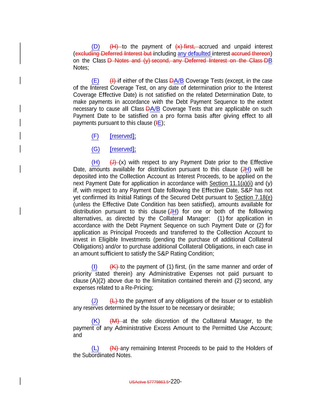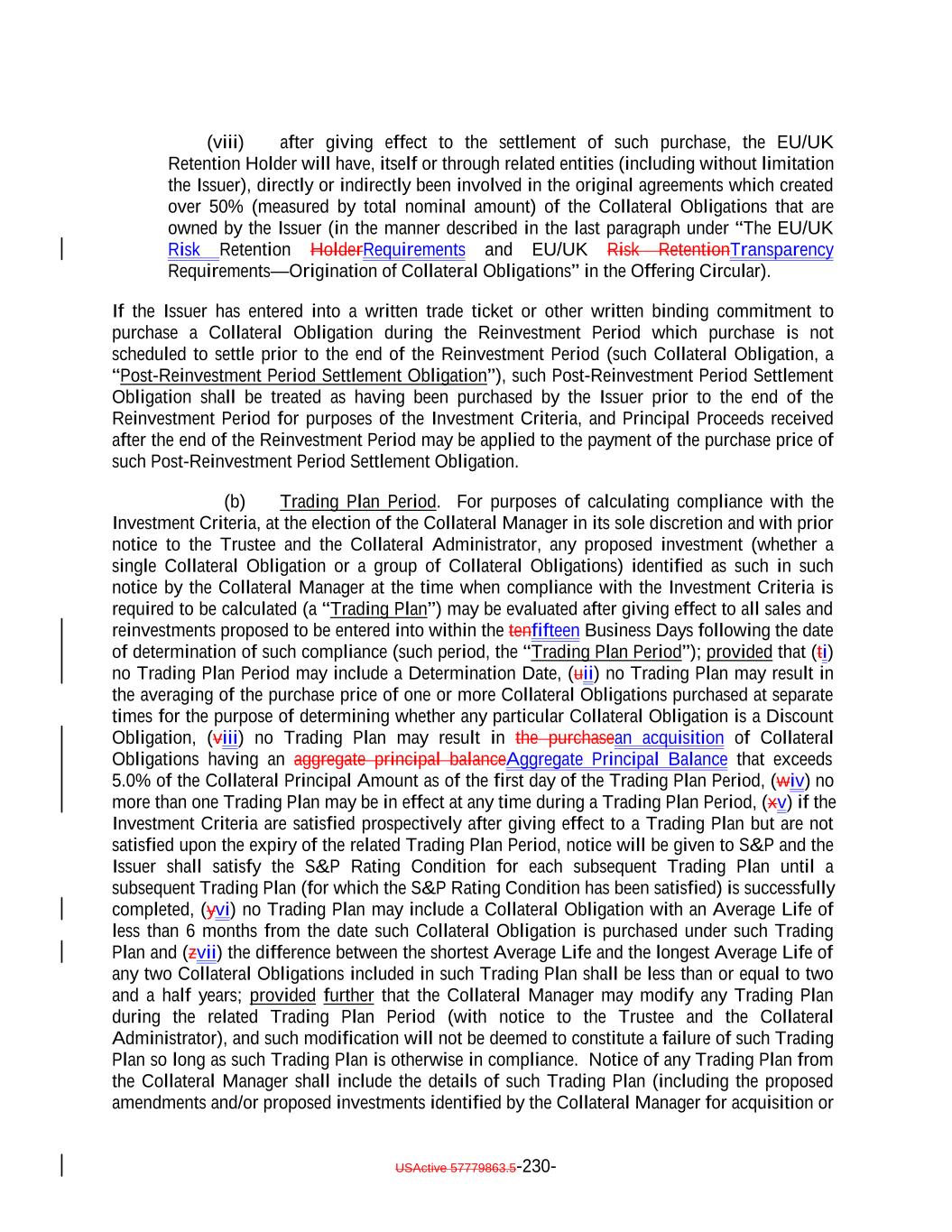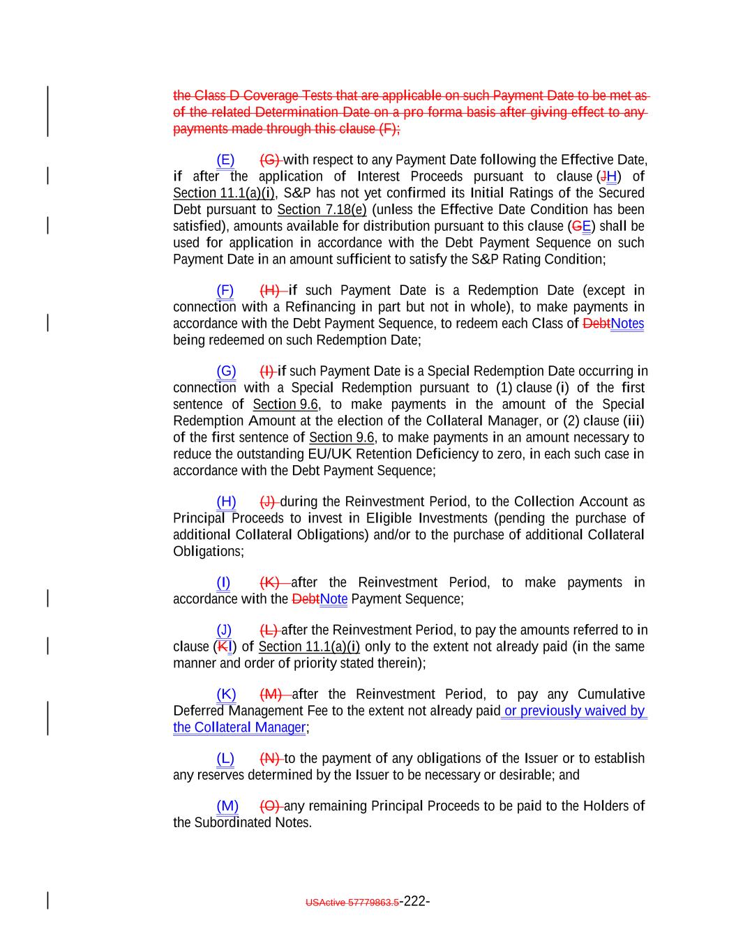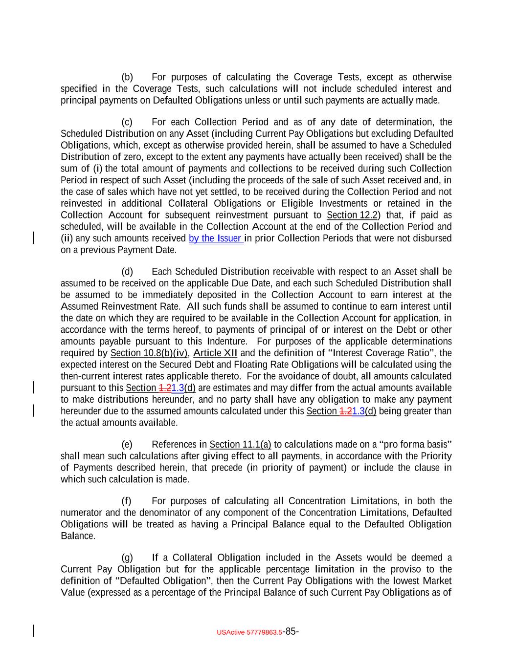 aggregate of all collections in respect of such Restructured Loan, Equity Security or Specified Equity Security since it was received or purchased by the Issuer equals the outstanding Principal Balance of the related Collateral Obligation or Defaulted Obligation, as applicable, at the time the Obligor thereof underwent insolvency, bankruptcy, reorganization, debt restructuring or workout (or, in the case of a related Defaulted Obligation, at the time it became a Defaulted Obligation); (b) capitalized interest shall not constitute Interest Proceeds; (c) any amounts relating to Maturity Amendments that are required to be treated as Principal Proceeds under this Indenture shall not constitute Interest Proceeds; and (d) subject to the preceding clause (a) above, any amounts (including any Sale Proceeds) received in respect of any Workout Loan will be allocated, without duplication, (1) if Principal Proceeds were used to acquire such Workout Loan, such amounts will constitute Principal Proceeds until both (x) the aggregate of all recoveries in respect of such Workout Loan, and the Collateral Obligation with respect to which such Workout Loan was acquired, equals the sum of (i) the outstanding principal balance of such Collateral Obligation or Defaulted Obligation, as applicable, at the time the related Workout Loan was acquired (or, in the case of a Defaulted Obligation, at the time such Collateral Obligation became a Defaulted Obligation), (ii) the S&P Collateral Value of such Workout Loan plusand (iii) the amount of Principal Proceeds used to acquire such Workout Loan and (y) the Overcollateralization Ratio Test is satisfied, (2) if Interest Proceeds were used to acquire such Workout Loan, such amounts shall (x) first, constitute Principal Proceeds until the aggregate of all recoveries in respect of such Workout Loan equals the greatest of (A) the S&P Collateral Value of such Workout Loan, (B) the Market Value of such Workout Loan and (C) 70% multiplied by the outstanding Principal Balance of such Workout Loan; and (y) thereafter, constitute Interest Proceeds until the aggregate amount of all collections with respect to such Workout Loan equals the amount of Interest Proceeds used to acquire such Workout Loan and (3) in the case of any Workout Loan acquired using amounts on deposit in the Permitted Use Account or Contributions, such amounts shall constitute Principal Proceeds until the aggregate of all recoveries in respect of such Workout Loan equals the greatest of (A) the S&P Collateral Value of such Workout Loan., (B) the Market Value of such Workout Loan and (C) 70% multiplied by the outstanding Principal Balance of such Workout Loan; provided that, to the extent that any combination of Principal Proceeds, Interest Proceeds and/or amounts available for a Permitted Use were used to acquire such Workout Loan, the Collateral Manager shall ensure satisfaction of clauses (1), (2) and (3) on a pro rata basis to the extent able in its commercially reasonable discretion. Notwithstanding the foregoing, in the Collateral Manager’s sole discretion (to be exercised on or before the related Determination Date), Interest Proceeds in any Collection Period may be classified as Principal Proceeds provided that such designation would not result in ana non-payment of interest deferral on any Class of Secured Debt. USActive 57779863.5-47-