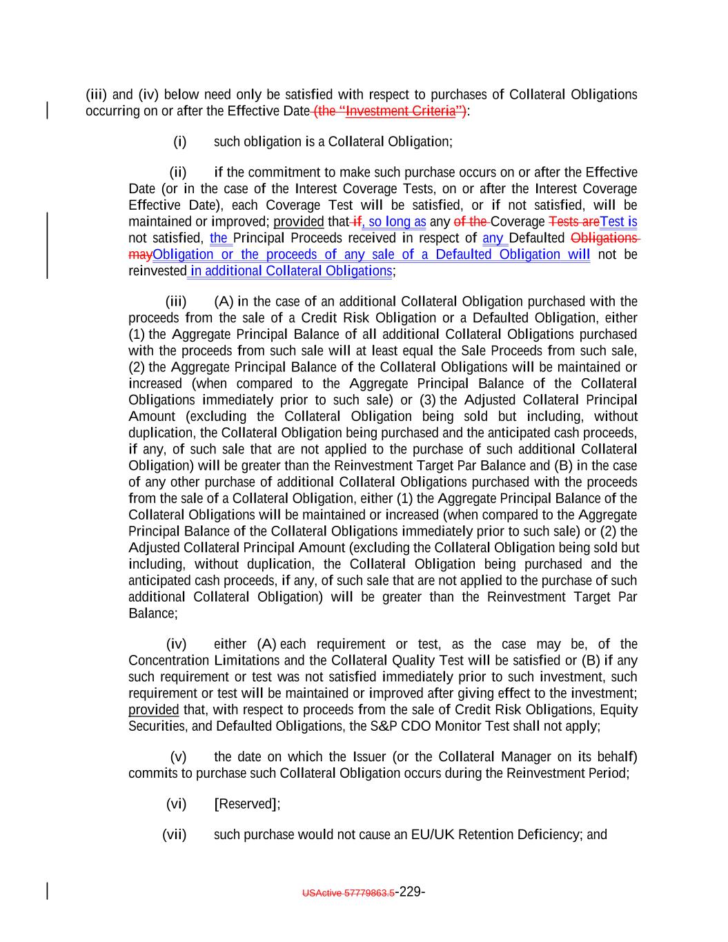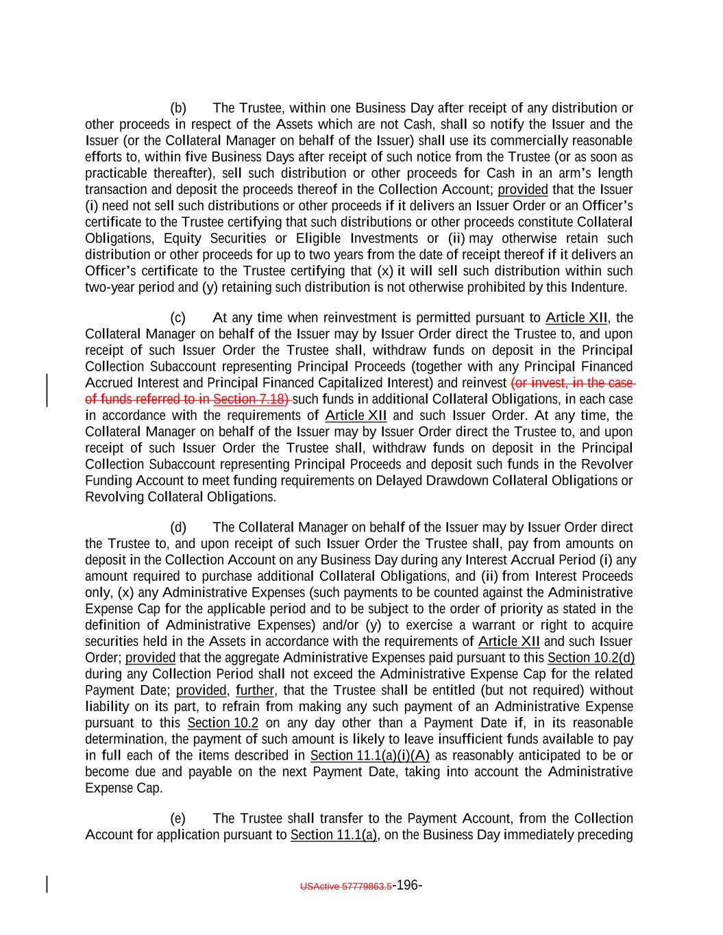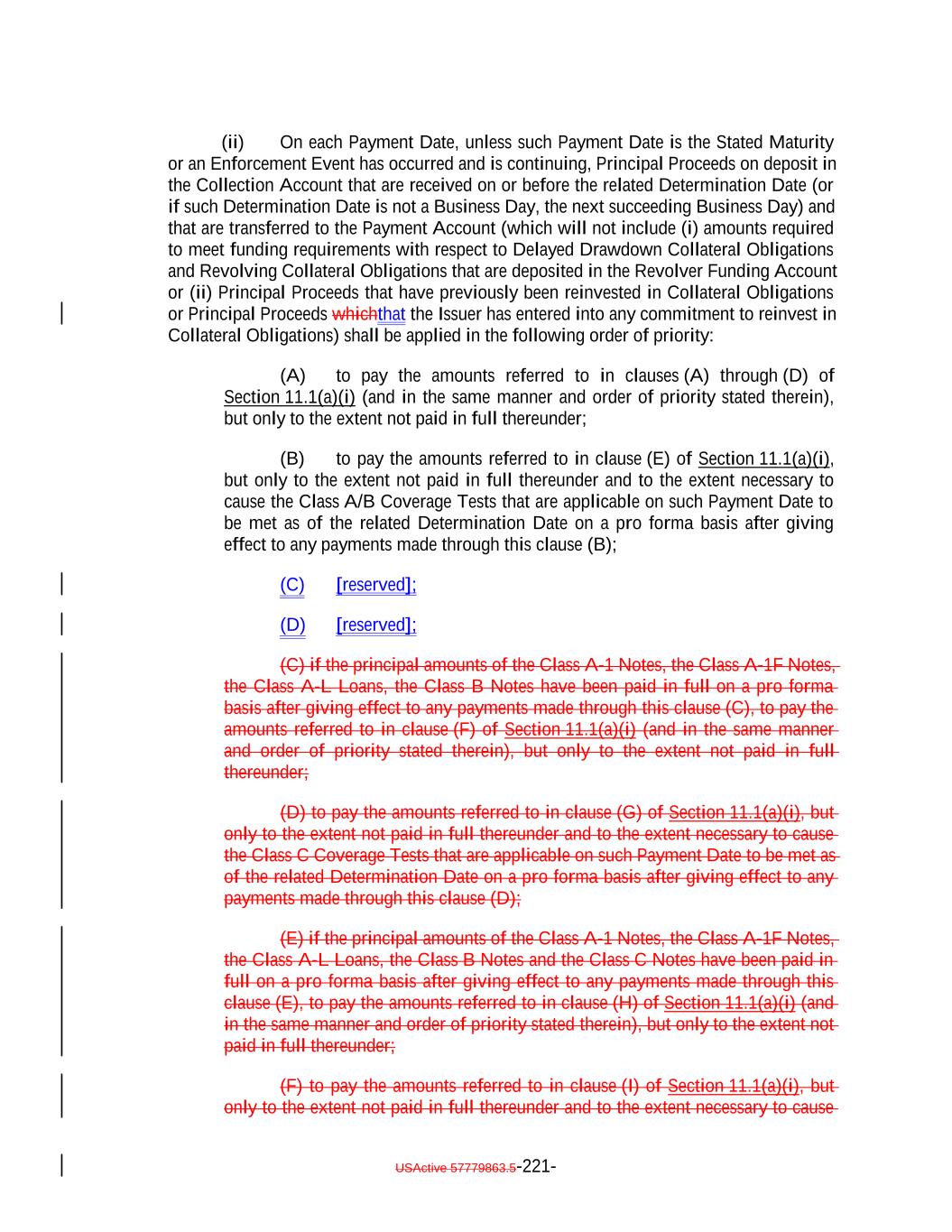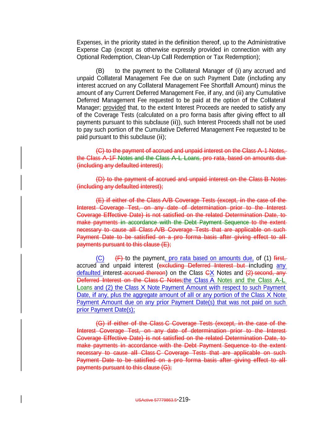 aggregate of all collections in respect of such Restructured Loan, Equity Security or Specified Equity Security since it was received or purchased by the Issuer equals the outstanding Principal Balance of the related Collateral Obligation or Defaulted Obligation, as applicable, at the time the Obligor thereof underwent insolvency, bankruptcy, reorganization, debt restructuring or workout (or, in the case of a related Defaulted Obligation, at the time it became a Defaulted Obligation); (b) capitalized interest shall not constitute Interest Proceeds; (c) any amounts relating to Maturity Amendments that are required to be treated as Principal Proceeds under this Indenture shall not constitute Interest Proceeds; and (d) subject to the preceding clause (a) above, any amounts (including any Sale Proceeds) received in respect of any Workout Loan will be allocated, without duplication, (1) if Principal Proceeds were used to acquire such Workout Loan, such amounts will constitute Principal Proceeds until both (x) the aggregate of all recoveries in respect of such Workout Loan, and the Collateral Obligation with respect to which such Workout Loan was acquired, equals the sum of (i) the outstanding principal balance of such Collateral Obligation or Defaulted Obligation, as applicable, at the time the related Workout Loan was acquired (or, in the case of a Defaulted Obligation, at the time such Collateral Obligation became a Defaulted Obligation), (ii) the S&P Collateral Value of such Workout Loan plusand (iii) the amount of Principal Proceeds used to acquire such Workout Loan and (y) the Overcollateralization Ratio Test is satisfied, (2) if Interest Proceeds were used to acquire such Workout Loan, such amounts shall (x) first, constitute Principal Proceeds until the aggregate of all recoveries in respect of such Workout Loan equals the greatest of (A) the S&P Collateral Value of such Workout Loan, (B) the Market Value of such Workout Loan and (C) 70% multiplied by the outstanding Principal Balance of such Workout Loan; and (y) thereafter, constitute Interest Proceeds until the aggregate amount of all collections with respect to such Workout Loan equals the amount of Interest Proceeds used to acquire such Workout Loan and (3) in the case of any Workout Loan acquired using amounts on deposit in the Permitted Use Account or Contributions, such amounts shall constitute Principal Proceeds until the aggregate of all recoveries in respect of such Workout Loan equals the greatest of (A) the S&P Collateral Value of such Workout Loan., (B) the Market Value of such Workout Loan and (C) 70% multiplied by the outstanding Principal Balance of such Workout Loan; provided that, to the extent that any combination of Principal Proceeds, Interest Proceeds and/or amounts available for a Permitted Use were used to acquire such Workout Loan, the Collateral Manager shall ensure satisfaction of clauses (1), (2) and (3) on a pro rata basis to the extent able in its commercially reasonable discretion. Notwithstanding the foregoing, in the Collateral Manager’s sole discretion (to be exercised on or before the related Determination Date), Interest Proceeds in any Collection Period may be classified as Principal Proceeds provided that such designation would not result in ana non-payment of interest deferral on any Class of Secured Debt. USActive 57779863.5-47-