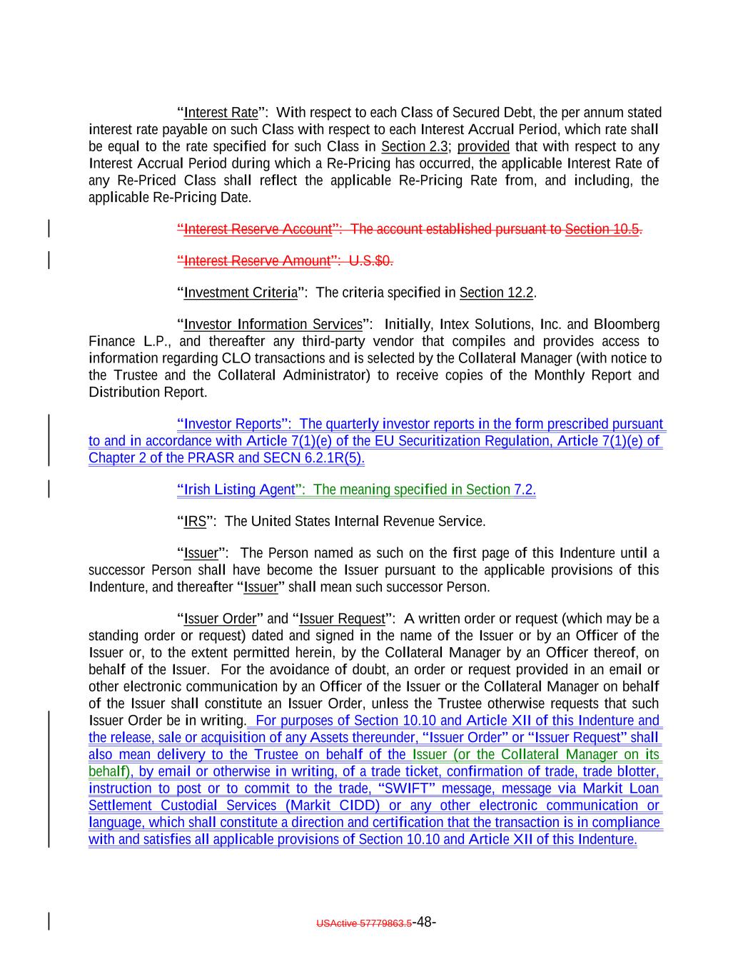 “Interest Rate”: With respect to each Class of Secured Debt, the per annum stated interest rate payable on such Class with respect to each Interest Accrual Period, which rate shall be equal to the rate specified for such Class in Section 2.3; provided that with respect to any Interest Accrual Period during which a Re-Pricing has occurred, the applicable Interest Rate of any Re-Priced Class shall reflect the applicable Re-Pricing Rate from, and including, the applicable Re-Pricing Date. “Interest Reserve Account”: The account established pursuant to Section 10.5. “Interest Reserve Amount”: U.S.$0. “Investment Criteria”: The criteria specified in Section 12.2. “Investor Information Services”: Initially, Intex Solutions, Inc. and Bloomberg Finance L.P., and thereafter any third-party vendor that compiles and provides access to information regarding CLO transactions and is selected by the Collateral Manager (with notice to the Trustee and the Collateral Administrator) to receive copies of the Monthly Report and Distribution Report. “Investor Reports”: The quarterly investor reports in the form prescribed pursuant to and in accordance with Article 7(1)(e) of the EU Securitization Regulation, Article 7(1)(e) of Chapter 2 of the PRASR and SECN 6.2.1R(5). “Irish Listing Agent”: The meaning specified in Section 7.2. “IRS”: The United States Internal Revenue Service. “Issuer”: The Person named as such on the first page of this Indenture until a successor Person shall have become the Issuer pursuant to the applicable provisions of this Indenture, and thereafter “Issuer” shall mean such successor Person. “Issuer Order” and “Issuer Request”: A written order or request (which may be a standing order or request) dated and signed in the name of the Issuer or by an Officer of the Issuer or, to the extent permitted herein, by the Collateral Manager by an Officer thereof, on behalf of the Issuer. For the avoidance of doubt, an order or request provided in an email or other electronic communication by an Officer of the Issuer or the Collateral Manager on behalf of the Issuer shall constitute an Issuer Order, unless the Trustee otherwise requests that such Issuer Order be in writing. For purposes of Section 10.10 and Article XII of this Indenture and the release, sale or acquisition of any Assets thereunder, “Issuer Order” or “Issuer Request” shall also mean delivery to the Trustee on behalf of the Issuer (or the Collateral Manager on its behalf), by email or otherwise in writing, of a trade ticket, confirmation of trade, trade blotter, instruction to post or to commit to the trade, “SWIFT” message, message via Markit Loan Settlement Custodial Services (Markit CIDD) or any other electronic communication or language, which shall constitute a direction and certification that the transaction is in compliance with and satisfies all applicable provisions of Section 10.10 and Article XII of this Indenture. USActive 57779863.5-48-
