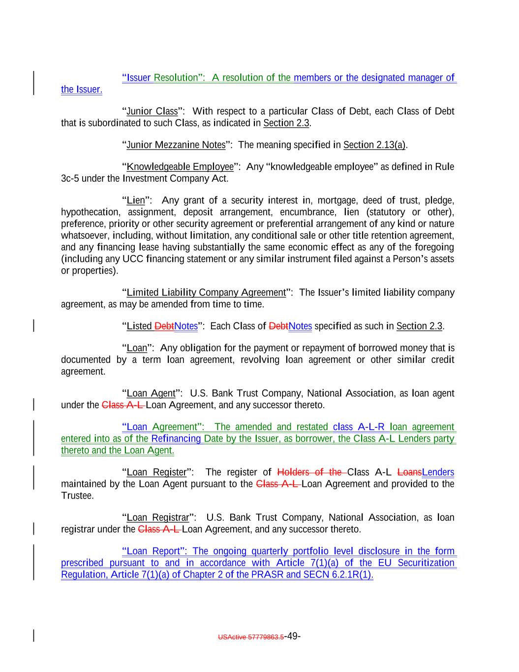 “Issuer Resolution”: A resolution of the members or the designated manager of the Issuer. “Junior Class”: With respect to a particular Class of Debt, each Class of Debt that is subordinated to such Class, as indicated in Section 2.3. “Junior Mezzanine Notes”: The meaning specified in Section 2.13(a). “Knowledgeable Employee”: Any “knowledgeable employee” as defined in Rule 3c-5 under the Investment Company Act. “Lien”: Any grant of a security interest in, mortgage, deed of trust, pledge, hypothecation, assignment, deposit arrangement, encumbrance, lien (statutory or other), preference, priority or other security agreement or preferential arrangement of any kind or nature whatsoever, including, without limitation, any conditional sale or other title retention agreement, and any financing lease having substantially the same economic effect as any of the foregoing (including any UCC financing statement or any similar instrument filed against a Person’s assets or properties). “Limited Liability Company Agreement”: The Issuer’s limited liability company agreement, as may be amended from time to time. “Listed DebtNotes”: Each Class of DebtNotes specified as such in Section 2.3. “Loan”: Any obligation for the payment or repayment of borrowed money that is documented by a term loan agreement, revolving loan agreement or other similar credit agreement. “Loan Agent”: U.S. Bank Trust Company, National Association, as loan agent under the Class A-L Loan Agreement, and any successor thereto. “Loan Agreement”: The amended and restated class A-L-R loan agreement entered into as of the Refinancing Date by the Issuer, as borrower, the Class A-L Lenders party thereto and the Loan Agent. “Loan Register”: The register of Holders of the Class A-L LoansLenders maintained by the Loan Agent pursuant to the Class A-L Loan Agreement and provided to the Trustee. “Loan Registrar”: U.S. Bank Trust Company, National Association, as loan registrar under the Class A-L Loan Agreement, and any successor thereto. “Loan Report”: The ongoing quarterly portfolio level disclosure in the form prescribed pursuant to and in accordance with Article 7(1)(a) of the EU Securitization Regulation, Article 7(1)(a) of Chapter 2 of the PRASR and SECN 6.2.1R(1). USActive 57779863.5-49-