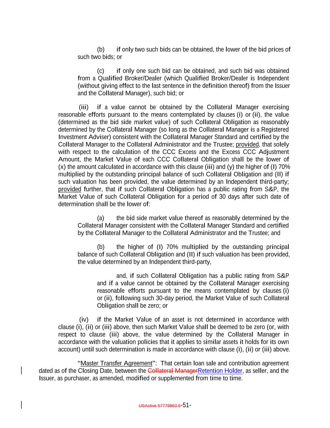 (b) if only two such bids can be obtained, the lower of the bid prices of such two bids; or (c) if only one such bid can be obtained, and such bid was obtained from a Qualified Broker/Dealer (which Qualified Broker/Dealer is Independent (without giving effect to the last sentence in the definition thereof) from the Issuer and the Collateral Manager), such bid; or (iii) if a value cannot be obtained by the Collateral Manager exercising reasonable efforts pursuant to the means contemplated by clauses (i) or (ii), the value (determined as the bid side market value) of such Collateral Obligation as reasonably determined by the Collateral Manager (so long as the Collateral Manager is a Registered Investment Adviser) consistent with the Collateral Manager Standard and certified by the Collateral Manager to the Collateral Administrator and the Trustee; provided, that solely with respect to the calculation of the CCC Excess and the Excess CCC Adjustment Amount, the Market Value of each CCC Collateral Obligation shall be the lower of (x) the amount calculated in accordance with this clause (iii) and (y) the higher of (I) 70% multiplied by the outstanding principal balance of such Collateral Obligation and (II) if such valuation has been provided, the value determined by an Independent third-party; provided further, that if such Collateral Obligation has a public rating from S&P, the Market Value of such Collateral Obligation for a period of 30 days after such date of determination shall be the lower of: (a) the bid side market value thereof as reasonably determined by the Collateral Manager consistent with the Collateral Manager Standard and certified by the Collateral Manager to the Collateral Administrator and the Trustee; and (b) the higher of (I) 70% multiplied by the outstanding principal balance of such Collateral Obligation and (II) if such valuation has been provided, the value determined by an Independent third-party, and, if such Collateral Obligation has a public rating from S&P and if a value cannot be obtained by the Collateral Manager exercising reasonable efforts pursuant to the means contemplated by clauses (i) or (ii), following such 30-day period, the Market Value of such Collateral Obligation shall be zero; or (iv) if the Market Value of an asset is not determined in accordance with clause (i), (ii) or (iii) above, then such Market Value shall be deemed to be zero (or, with respect to clause (iii) above, the value determined by the Collateral Manager in accordance with the valuation policies that it applies to similar assets it holds for its own account) until such determination is made in accordance with clause (i), (ii) or (iii) above. “Master Transfer Agreement”: That certain loan sale and contribution agreement dated as of the Closing Date, between the Collateral ManagerRetention Holder, as seller, and the Issuer, as purchaser, as amended, modified or supplemented from time to time. USActive 57779863.5-51-