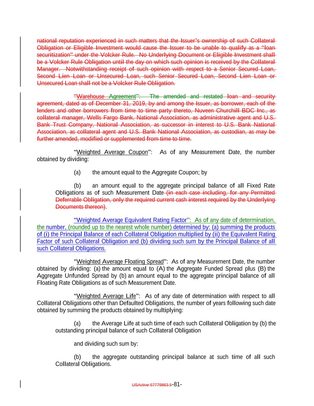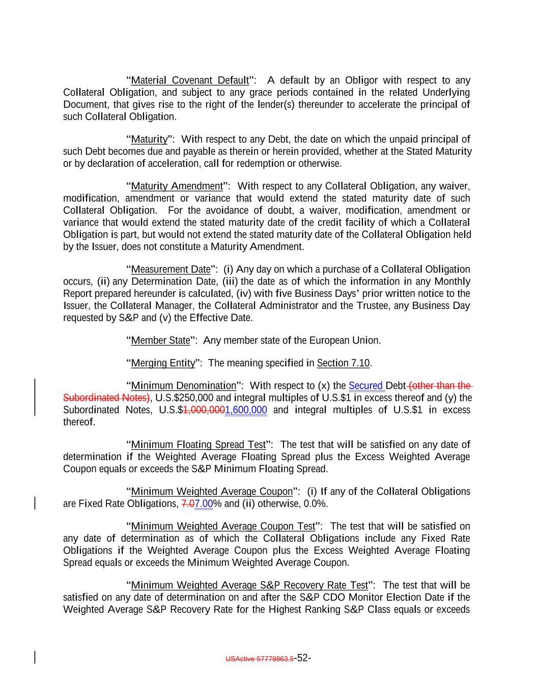 “Material Covenant Default”: A default by an Obligor with respect to any Collateral Obligation, and subject to any grace periods contained in the related Underlying Document, that gives rise to the right of the lender(s) thereunder to accelerate the principal of such Collateral Obligation. “Maturity”: With respect to any Debt, the date on which the unpaid principal of such Debt becomes due and payable as therein or herein provided, whether at the Stated Maturity or by declaration of acceleration, call for redemption or otherwise. “Maturity Amendment”: With respect to any Collateral Obligation, any waiver, modification, amendment or variance that would extend the stated maturity date of such Collateral Obligation. For the avoidance of doubt, a waiver, modification, amendment or variance that would extend the stated maturity date of the credit facility of which a Collateral Obligation is part, but would not extend the stated maturity date of the Collateral Obligation held by the Issuer, does not constitute a Maturity Amendment. “Measurement Date”: (i) Any day on which a purchase of a Collateral Obligation occurs, (ii) any Determination Date, (iii) the date as of which the information in any Monthly Report prepared hereunder is calculated, (iv) with five Business Days’ prior written notice to the Issuer, the Collateral Manager, the Collateral Administrator and the Trustee, any Business Day requested by S&P and (v) the Effective Date. “Member State”: Any member state of the European Union. “Merging Entity”: The meaning specified in Section 7.10. “Minimum Denomination”: With respect to (x) the Secured Debt (other than the Subordinated Notes), U.S.$250,000 and integral multiples of U.S.$1 in excess thereof and (y) the Subordinated Notes, U.S.$1,000,0001,600,000 and integral multiples of U.S.$1 in excess thereof. “Minimum Floating Spread Test”: The test that will be satisfied on any date of determination if the Weighted Average Floating Spread plus the Excess Weighted Average Coupon equals or exceeds the S&P Minimum Floating Spread. “Minimum Weighted Average Coupon”: (i) If any of the Collateral Obligations are Fixed Rate Obligations, 7.07.00% and (ii) otherwise, 0.0%. “Minimum Weighted Average Coupon Test”: The test that will be satisfied on any date of determination as of which the Collateral Obligations include any Fixed Rate Obligations if the Weighted Average Coupon plus the Excess Weighted Average Floating Spread equals or exceeds the Minimum Weighted Average Coupon. “Minimum Weighted Average S&P Recovery Rate Test”: The test that will be satisfied on any date of determination on and after the S&P CDO Monitor Election Date if the Weighted Average S&P Recovery Rate for the Highest Ranking S&P Class equals or exceeds USActive 57779863.5-52-