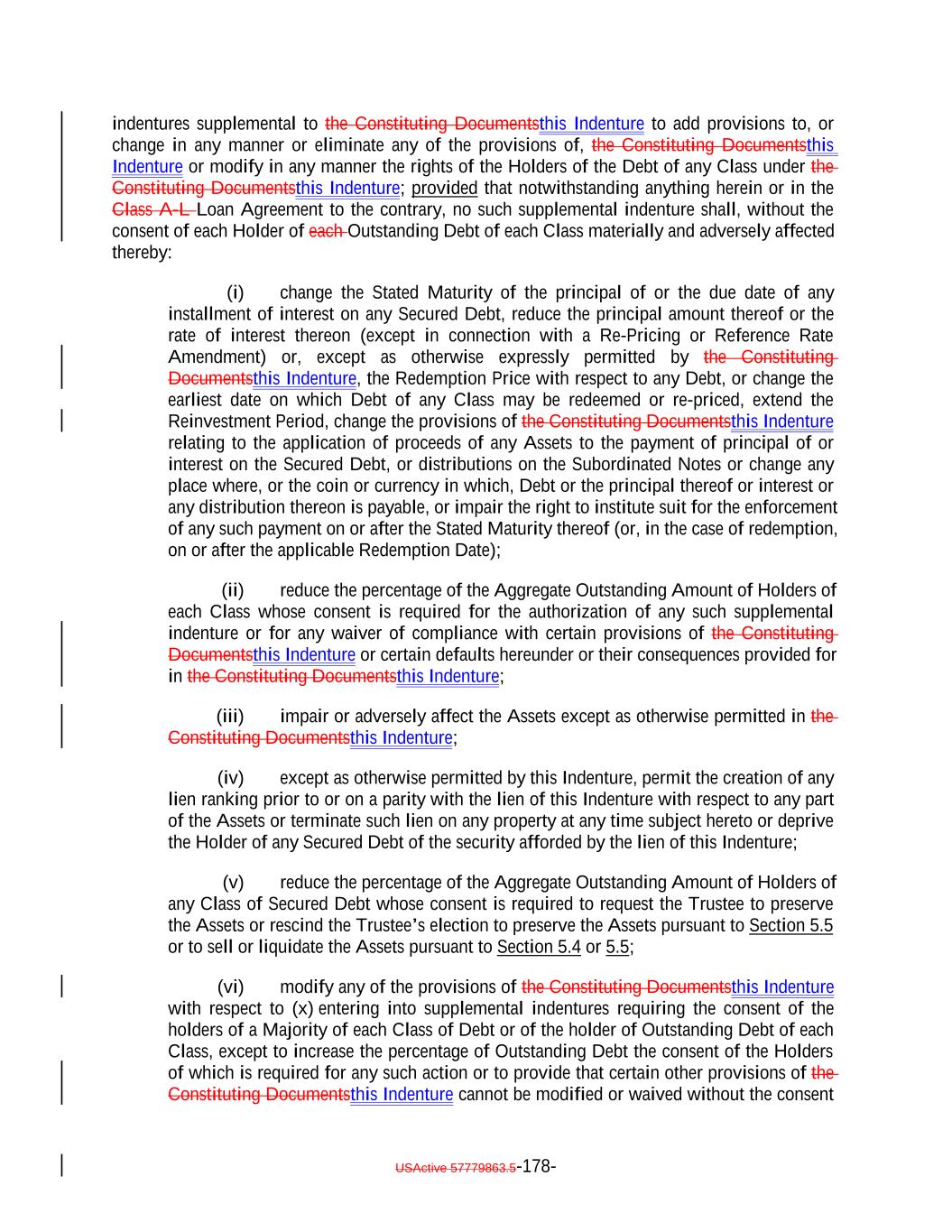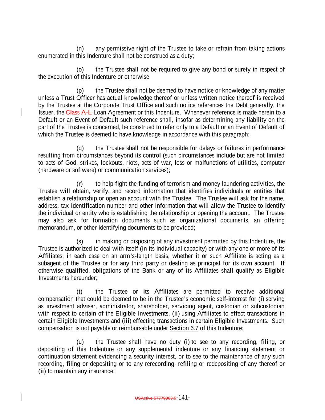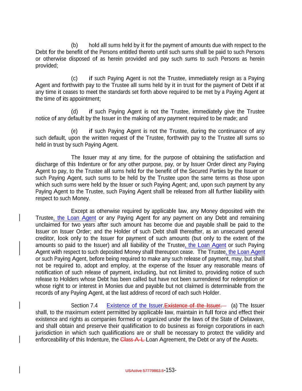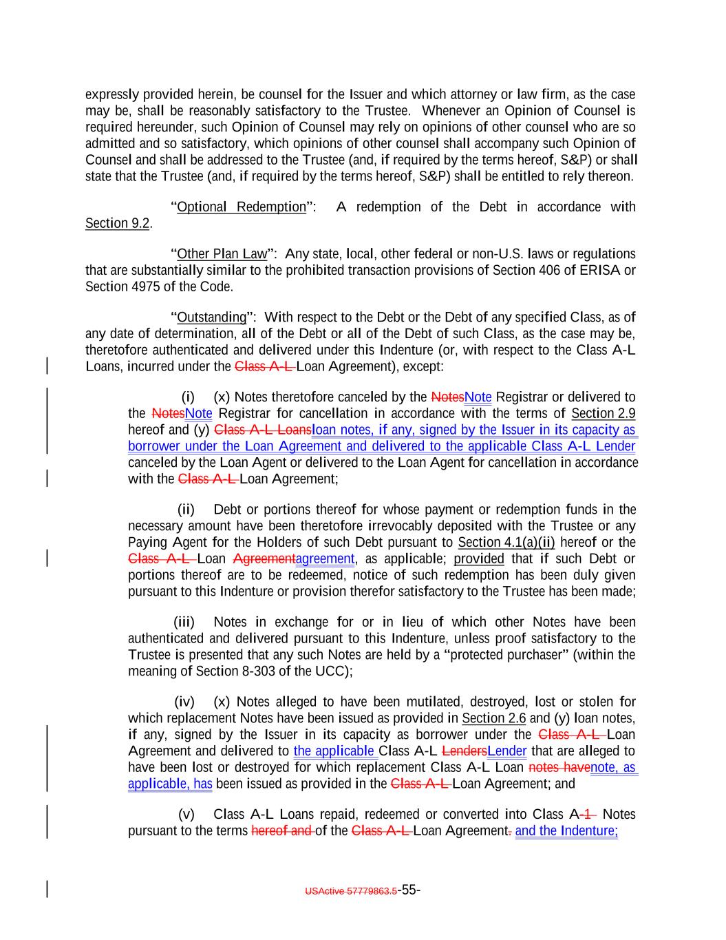 expressly provided herein, be counsel for the Issuer and which attorney or law firm, as the case may be, shall be reasonably satisfactory to the Trustee. Whenever an Opinion of Counsel is required hereunder, such Opinion of Counsel may rely on opinions of other counsel who are so admitted and so satisfactory, which opinions of other counsel shall accompany such Opinion of Counsel and shall be addressed to the Trustee (and, if required by the terms hereof, S&P) or shall state that the Trustee (and, if required by the terms hereof, S&P) shall be entitled to rely thereon. “Optional Redemption”: A redemption of the Debt in accordance with Section 9.2. “Other Plan Law”: Any state, local, other federal or non-U.S. laws or regulations that are substantially similar to the prohibited transaction provisions of Section 406 of ERISA or Section 4975 of the Code. “Outstanding”: With respect to the Debt or the Debt of any specified Class, as of any date of determination, all of the Debt or all of the Debt of such Class, as the case may be, theretofore authenticated and delivered under this Indenture (or, with respect to the Class A-L Loans, incurred under the Class A-L Loan Agreement), except: (i) (x) Notes theretofore canceled by the NotesNote Registrar or delivered to the NotesNote Registrar for cancellation in accordance with the terms of Section 2.9 hereof and (y) Class A-L Loansloan notes, if any, signed by the Issuer in its capacity as borrower under the Loan Agreement and delivered to the applicable Class A-L Lender canceled by the Loan Agent or delivered to the Loan Agent for cancellation in accordance with the Class A-L Loan Agreement; (ii) Debt or portions thereof for whose payment or redemption funds in the necessary amount have been theretofore irrevocably deposited with the Trustee or any Paying Agent for the Holders of such Debt pursuant to Section 4.1(a)(ii) hereof or the Class A-L Loan Agreementagreement, as applicable; provided that if such Debt or portions thereof are to be redeemed, notice of such redemption has been duly given pursuant to this Indenture or provision therefor satisfactory to the Trustee has been made; (iii) Notes in exchange for or in lieu of which other Notes have been authenticated and delivered pursuant to this Indenture, unless proof satisfactory to the Trustee is presented that any such Notes are held by a “protected purchaser” (within the meaning of Section 8-303 of the UCC); (iv) (x) Notes alleged to have been mutilated, destroyed, lost or stolen for which replacement Notes have been issued as provided in Section 2.6 and (y) loan notes, if any, signed by the Issuer in its capacity as borrower under the Class A-L Loan Agreement and delivered to the applicable Class A-L LendersLender that are alleged to have been lost or destroyed for which replacement Class A-L Loan notes havenote, as applicable, has been issued as provided in the Class A-L Loan Agreement; and (v) Class A-L Loans repaid, redeemed or converted into Class A-1 Notes pursuant to the terms hereof and of the Class A-L Loan Agreement. and the Indenture; USActive 57779863.5-55-