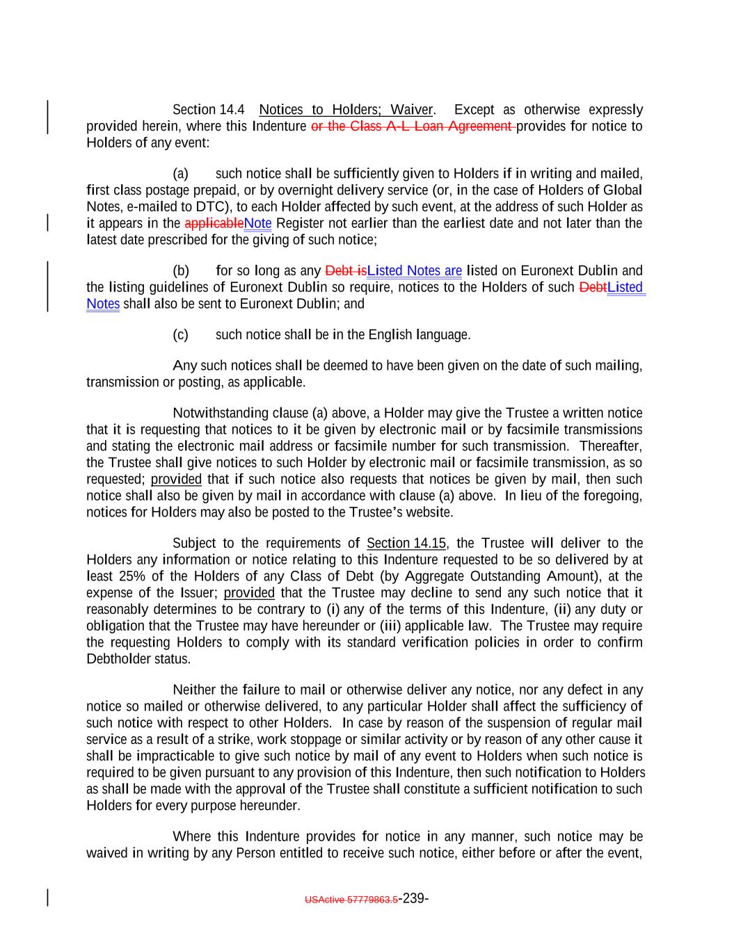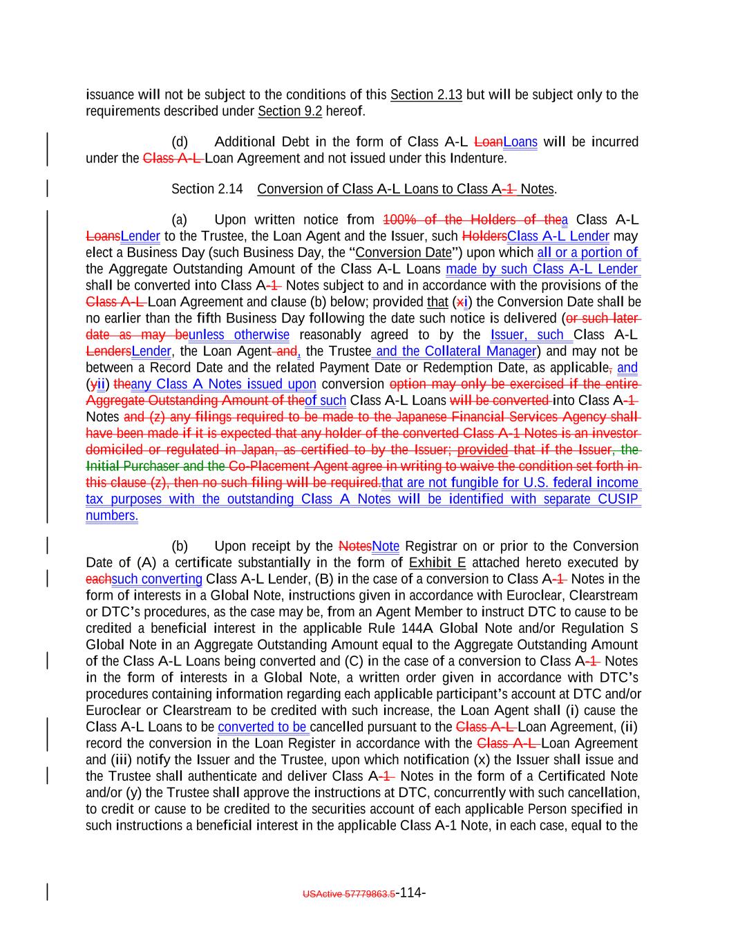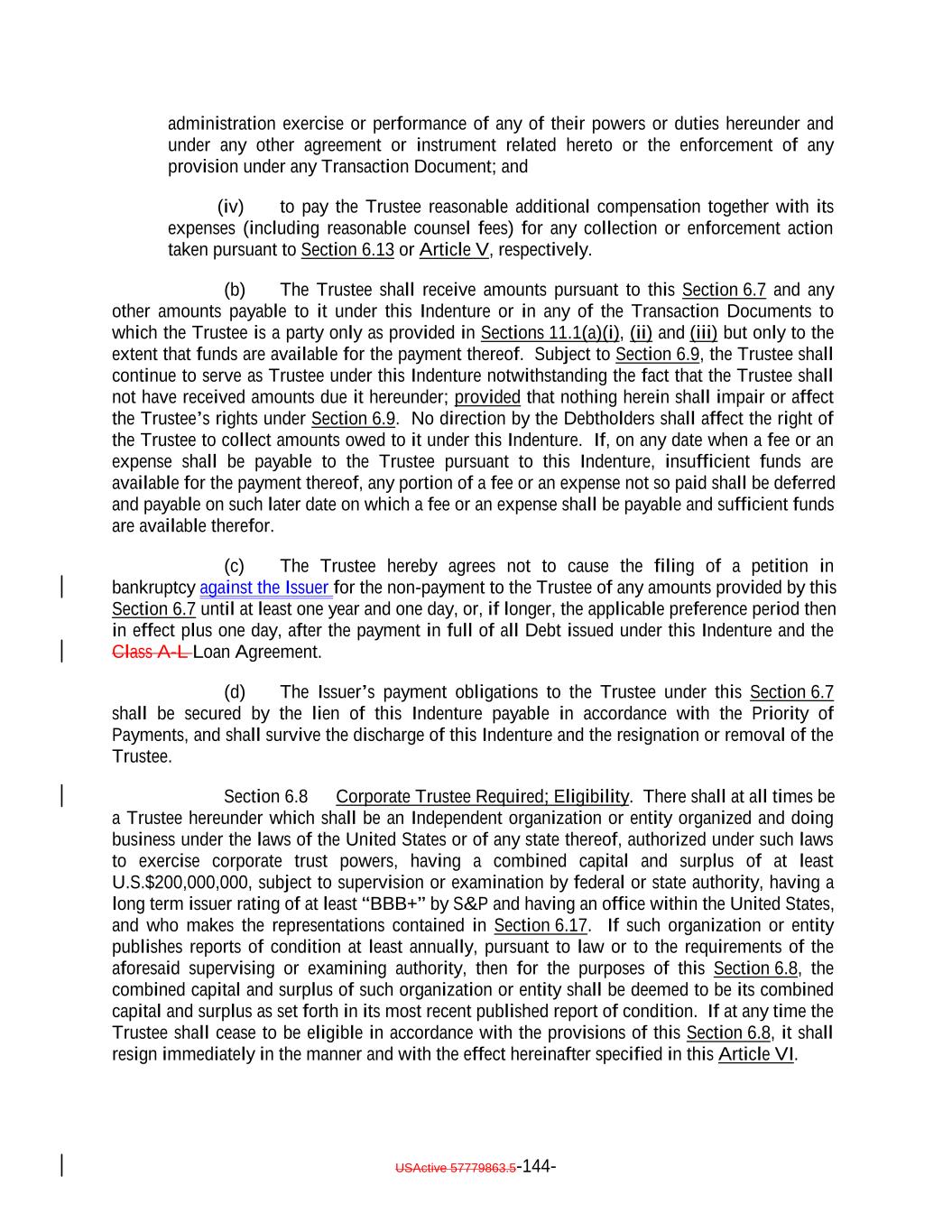 expressly provided herein, be counsel for the Issuer and which attorney or law firm, as the case may be, shall be reasonably satisfactory to the Trustee. Whenever an Opinion of Counsel is required hereunder, such Opinion of Counsel may rely on opinions of other counsel who are so admitted and so satisfactory, which opinions of other counsel shall accompany such Opinion of Counsel and shall be addressed to the Trustee (and, if required by the terms hereof, S&P) or shall state that the Trustee (and, if required by the terms hereof, S&P) shall be entitled to rely thereon. “Optional Redemption”: A redemption of the Debt in accordance with Section 9.2. “Other Plan Law”: Any state, local, other federal or non-U.S. laws or regulations that are substantially similar to the prohibited transaction provisions of Section 406 of ERISA or Section 4975 of the Code. “Outstanding”: With respect to the Debt or the Debt of any specified Class, as of any date of determination, all of the Debt or all of the Debt of such Class, as the case may be, theretofore authenticated and delivered under this Indenture (or, with respect to the Class A-L Loans, incurred under the Class A-L Loan Agreement), except: (i) (x) Notes theretofore canceled by the NotesNote Registrar or delivered to the NotesNote Registrar for cancellation in accordance with the terms of Section 2.9 hereof and (y) Class A-L Loansloan notes, if any, signed by the Issuer in its capacity as borrower under the Loan Agreement and delivered to the applicable Class A-L Lender canceled by the Loan Agent or delivered to the Loan Agent for cancellation in accordance with the Class A-L Loan Agreement; (ii) Debt or portions thereof for whose payment or redemption funds in the necessary amount have been theretofore irrevocably deposited with the Trustee or any Paying Agent for the Holders of such Debt pursuant to Section 4.1(a)(ii) hereof or the Class A-L Loan Agreementagreement, as applicable; provided that if such Debt or portions thereof are to be redeemed, notice of such redemption has been duly given pursuant to this Indenture or provision therefor satisfactory to the Trustee has been made; (iii) Notes in exchange for or in lieu of which other Notes have been authenticated and delivered pursuant to this Indenture, unless proof satisfactory to the Trustee is presented that any such Notes are held by a “protected purchaser” (within the meaning of Section 8-303 of the UCC); (iv) (x) Notes alleged to have been mutilated, destroyed, lost or stolen for which replacement Notes have been issued as provided in Section 2.6 and (y) loan notes, if any, signed by the Issuer in its capacity as borrower under the Class A-L Loan Agreement and delivered to the applicable Class A-L LendersLender that are alleged to have been lost or destroyed for which replacement Class A-L Loan notes havenote, as applicable, has been issued as provided in the Class A-L Loan Agreement; and (v) Class A-L Loans repaid, redeemed or converted into Class A-1 Notes pursuant to the terms hereof and of the Class A-L Loan Agreement. and the Indenture; USActive 57779863.5-55-