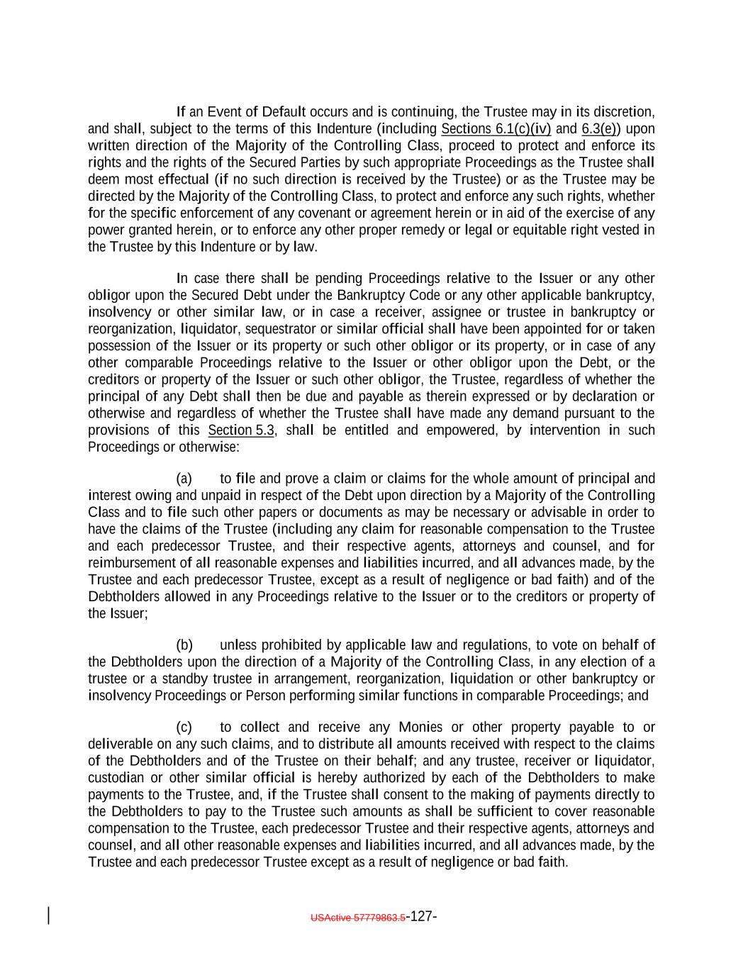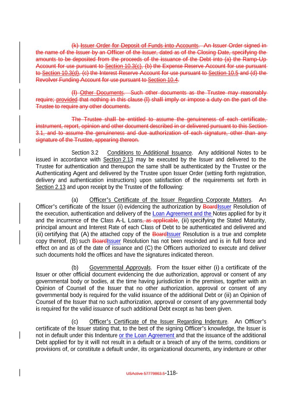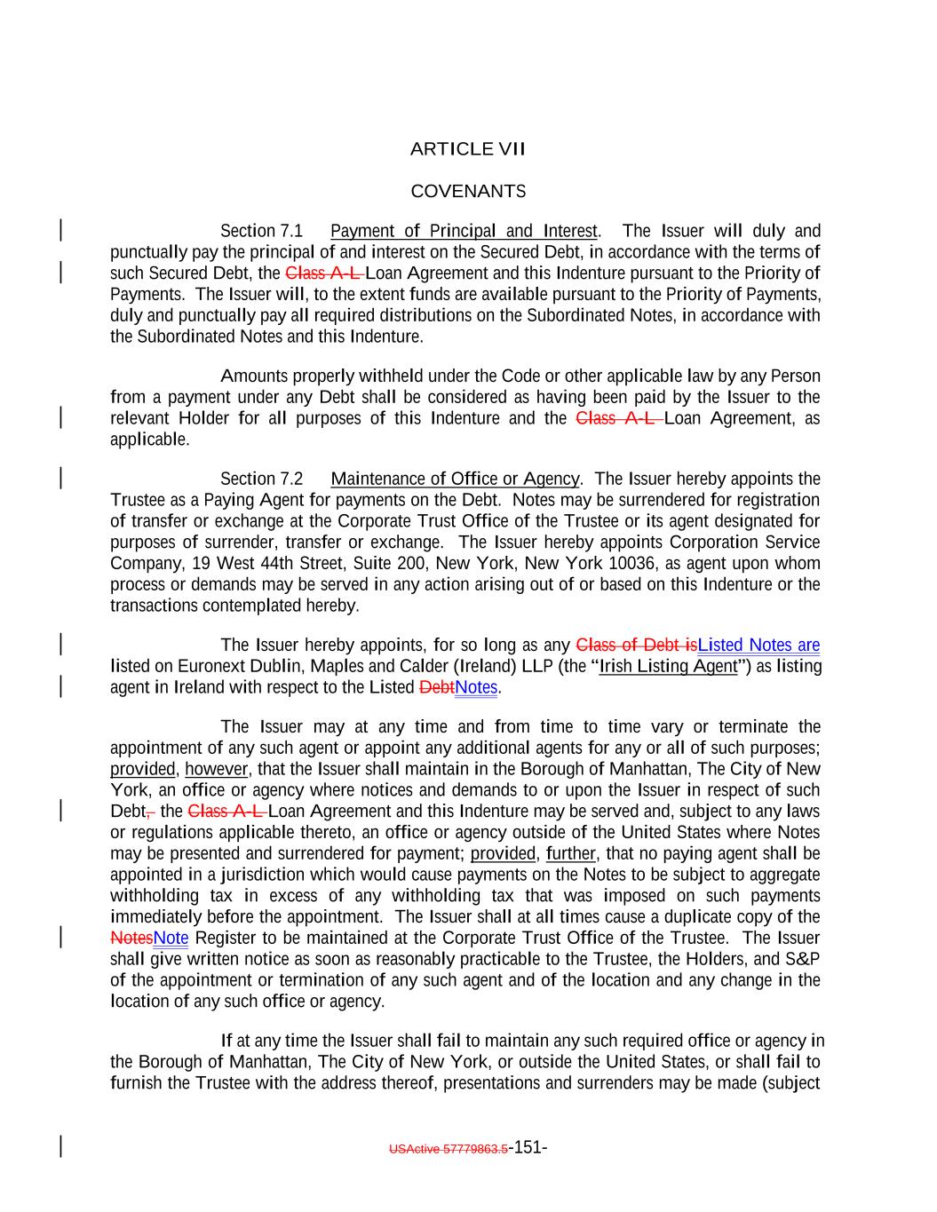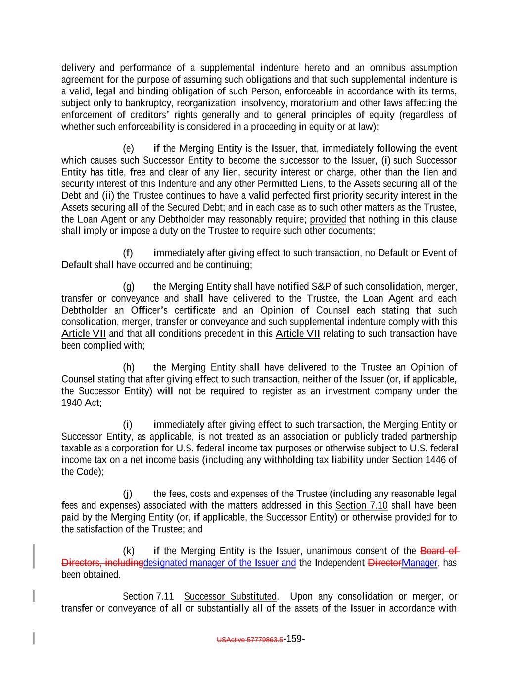 expressly provided herein, be counsel for the Issuer and which attorney or law firm, as the case may be, shall be reasonably satisfactory to the Trustee. Whenever an Opinion of Counsel is required hereunder, such Opinion of Counsel may rely on opinions of other counsel who are so admitted and so satisfactory, which opinions of other counsel shall accompany such Opinion of Counsel and shall be addressed to the Trustee (and, if required by the terms hereof, S&P) or shall state that the Trustee (and, if required by the terms hereof, S&P) shall be entitled to rely thereon. “Optional Redemption”: A redemption of the Debt in accordance with Section 9.2. “Other Plan Law”: Any state, local, other federal or non-U.S. laws or regulations that are substantially similar to the prohibited transaction provisions of Section 406 of ERISA or Section 4975 of the Code. “Outstanding”: With respect to the Debt or the Debt of any specified Class, as of any date of determination, all of the Debt or all of the Debt of such Class, as the case may be, theretofore authenticated and delivered under this Indenture (or, with respect to the Class A-L Loans, incurred under the Class A-L Loan Agreement), except: (i) (x) Notes theretofore canceled by the NotesNote Registrar or delivered to the NotesNote Registrar for cancellation in accordance with the terms of Section 2.9 hereof and (y) Class A-L Loansloan notes, if any, signed by the Issuer in its capacity as borrower under the Loan Agreement and delivered to the applicable Class A-L Lender canceled by the Loan Agent or delivered to the Loan Agent for cancellation in accordance with the Class A-L Loan Agreement; (ii) Debt or portions thereof for whose payment or redemption funds in the necessary amount have been theretofore irrevocably deposited with the Trustee or any Paying Agent for the Holders of such Debt pursuant to Section 4.1(a)(ii) hereof or the Class A-L Loan Agreementagreement, as applicable; provided that if such Debt or portions thereof are to be redeemed, notice of such redemption has been duly given pursuant to this Indenture or provision therefor satisfactory to the Trustee has been made; (iii) Notes in exchange for or in lieu of which other Notes have been authenticated and delivered pursuant to this Indenture, unless proof satisfactory to the Trustee is presented that any such Notes are held by a “protected purchaser” (within the meaning of Section 8-303 of the UCC); (iv) (x) Notes alleged to have been mutilated, destroyed, lost or stolen for which replacement Notes have been issued as provided in Section 2.6 and (y) loan notes, if any, signed by the Issuer in its capacity as borrower under the Class A-L Loan Agreement and delivered to the applicable Class A-L LendersLender that are alleged to have been lost or destroyed for which replacement Class A-L Loan notes havenote, as applicable, has been issued as provided in the Class A-L Loan Agreement; and (v) Class A-L Loans repaid, redeemed or converted into Class A-1 Notes pursuant to the terms hereof and of the Class A-L Loan Agreement. and the Indenture; USActive 57779863.5-55-