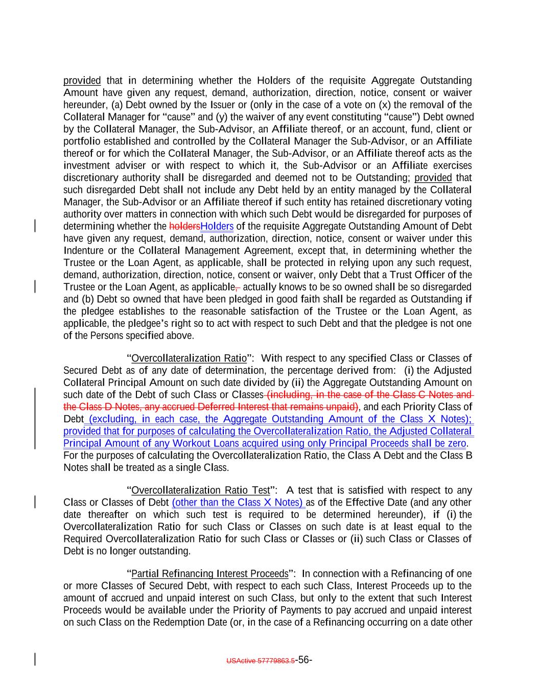 provided that in determining whether the Holders of the requisite Aggregate Outstanding Amount have given any request, demand, authorization, direction, notice, consent or waiver hereunder, (a) Debt owned by the Issuer or (only in the case of a vote on (x) the removal of the Collateral Manager for “cause” and (y) the waiver of any event constituting “cause”) Debt owned by the Collateral Manager, the Sub-Advisor, an Affiliate thereof, or an account, fund, client or portfolio established and controlled by the Collateral Manager the Sub-Advisor, or an Affiliate thereof or for which the Collateral Manager, the Sub-Advisor, or an Affiliate thereof acts as the investment adviser or with respect to which it, the Sub-Advisor or an Affiliate exercises discretionary authority shall be disregarded and deemed not to be Outstanding; provided that such disregarded Debt shall not include any Debt held by an entity managed by the Collateral Manager, the Sub-Advisor or an Affiliate thereof if such entity has retained discretionary voting authority over matters in connection with which such Debt would be disregarded for purposes of determining whether the holdersHolders of the requisite Aggregate Outstanding Amount of Debt have given any request, demand, authorization, direction, notice, consent or waiver under this Indenture or the Collateral Management Agreement, except that, in determining whether the Trustee or the Loan Agent, as applicable, shall be protected in relying upon any such request, demand, authorization, direction, notice, consent or waiver, only Debt that a Trust Officer of the Trustee or the Loan Agent, as applicable, actually knows to be so owned shall be so disregarded and (b) Debt so owned that have been pledged in good faith shall be regarded as Outstanding if the pledgee establishes to the reasonable satisfaction of the Trustee or the Loan Agent, as applicable, the pledgee’s right so to act with respect to such Debt and that the pledgee is not one of the Persons specified above. “Overcollateralization Ratio”: With respect to any specified Class or Classes of Secured Debt as of any date of determination, the percentage derived from: (i) the Adjusted Collateral Principal Amount on such date divided by (ii) the Aggregate Outstanding Amount on such date of the Debt of such Class or Classes (including, in the case of the Class C Notes and the Class D Notes, any accrued Deferred Interest that remains unpaid), and each Priority Class of Debt (excluding, in each case, the Aggregate Outstanding Amount of the Class X Notes); provided that for purposes of calculating the Overcollateralization Ratio, the Adjusted Collateral Principal Amount of any Workout Loans acquired using only Principal Proceeds shall be zero. For the purposes of calculating the Overcollateralization Ratio, the Class A Debt and the Class B Notes shall be treated as a single Class. “Overcollateralization Ratio Test”: A test that is satisfied with respect to any Class or Classes of Debt (other than the Class X Notes) as of the Effective Date (and any other date thereafter on which such test is required to be determined hereunder), if (i) the Overcollateralization Ratio for such Class or Classes on such date is at least equal to the Required Overcollateralization Ratio for such Class or Classes or (ii) such Class or Classes of Debt is no longer outstanding. “Partial Refinancing Interest Proceeds”: In connection with a Refinancing of one or more Classes of Secured Debt, with respect to each such Class, Interest Proceeds up to the amount of accrued and unpaid interest on such Class, but only to the extent that such Interest Proceeds would be available under the Priority of Payments to pay accrued and unpaid interest on such Class on the Redemption Date (or, in the case of a Refinancing occurring on a date other USActive 57779863.5-56-