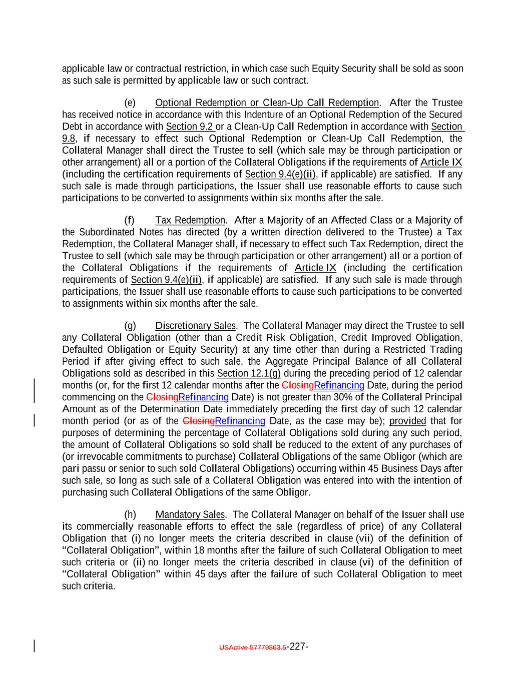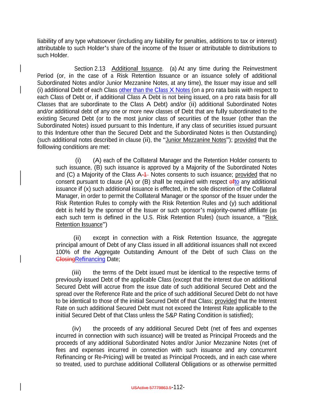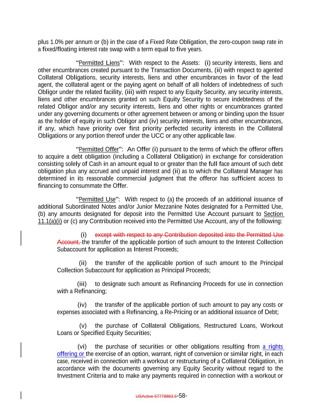 plus 1.0% per annum or (b) in the case of a Fixed Rate Obligation, the zero-coupon swap rate in a fixed/floating interest rate swap with a term equal to five years. “Permitted Liens”: With respect to the Assets: (i) security interests, liens and other encumbrances created pursuant to the Transaction Documents, (ii) with respect to agented Collateral Obligations, security interests, liens and other encumbrances in favor of the lead agent, the collateral agent or the paying agent on behalf of all holders of indebtedness of such Obligor under the related facility, (iii) with respect to any Equity Security, any security interests, liens and other encumbrances granted on such Equity Security to secure indebtedness of the related Obligor and/or any security interests, liens and other rights or encumbrances granted under any governing documents or other agreement between or among or binding upon the Issuer as the holder of equity in such Obligor and (iv) security interests, liens and other encumbrances, if any, which have priority over first priority perfected security interests in the Collateral Obligations or any portion thereof under the UCC or any other applicable law. “Permitted Offer”: An Offer (i) pursuant to the terms of which the offeror offers to acquire a debt obligation (including a Collateral Obligation) in exchange for consideration consisting solely of Cash in an amount equal to or greater than the full face amount of such debt obligation plus any accrued and unpaid interest and (ii) as to which the Collateral Manager has determined in its reasonable commercial judgment that the offeror has sufficient access to financing to consummate the Offer. “Permitted Use”: With respect to (a) the proceeds of an additional issuance of additional Subordinated Notes and/or Junior Mezzanine Notes designated for a Permitted Use, (b) any amounts designated for deposit into the Permitted Use Account pursuant to Section 11.1(a)(i) or (c) any Contribution received into the Permitted Use Account, any of the following: (i) except with respect to any Contribution deposited into the Permitted Use Account, the transfer of the applicable portion of such amount to the Interest Collection Subaccount for application as Interest Proceeds; (ii) the transfer of the applicable portion of such amount to the Principal Collection Subaccount for application as Principal Proceeds; (iii) to designate such amount as Refinancing Proceeds for use in connection with a Refinancing; (iv) the transfer of the applicable portion of such amount to pay any costs or expenses associated with a Refinancing, a Re-Pricing or an additional issuance of Debt; (v) the purchase of Collateral Obligations, Restructured Loans, Workout Loans or Specified Equity Securities; (vi) the purchase of securities or other obligations resulting from a rights offering or the exercise of an option, warrant, right of conversion or similar right, in each case, received in connection with a workout or restructuring of a Collateral Obligation, in accordance with the documents governing any Equity Security without regard to the Investment Criteria and to make any payments required in connection with a workout or USActive 57779863.5-58-