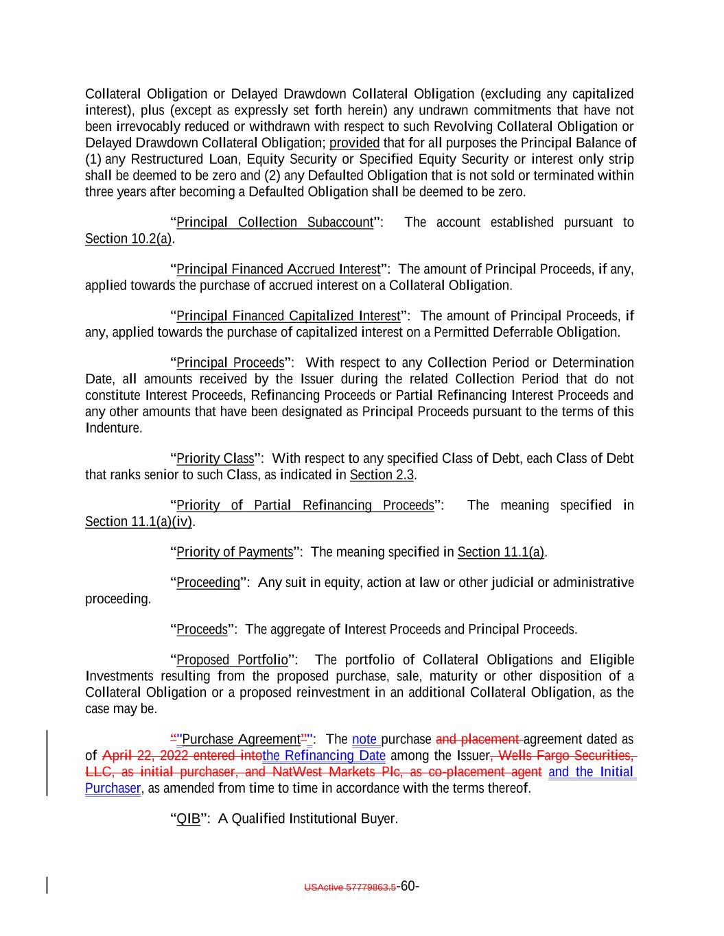 Collateral Obligation or Delayed Drawdown Collateral Obligation (excluding any capitalized interest), plus (except as expressly set forth herein) any undrawn commitments that have not been irrevocably reduced or withdrawn with respect to such Revolving Collateral Obligation or Delayed Drawdown Collateral Obligation; provided that for all purposes the Principal Balance of (1) any Restructured Loan, Equity Security or Specified Equity Security or interest only strip shall be deemed to be zero and (2) any Defaulted Obligation that is not sold or terminated within three years after becoming a Defaulted Obligation shall be deemed to be zero. “Principal Collection Subaccount”: The account established pursuant to Section 10.2(a). “Principal Financed Accrued Interest”: The amount of Principal Proceeds, if any, applied towards the purchase of accrued interest on a Collateral Obligation. “Principal Financed Capitalized Interest”: The amount of Principal Proceeds, if any, applied towards the purchase of capitalized interest on a Permitted Deferrable Obligation. “Principal Proceeds”: With respect to any Collection Period or Determination Date, all amounts received by the Issuer during the related Collection Period that do not constitute Interest Proceeds, Refinancing Proceeds or Partial Refinancing Interest Proceeds and any other amounts that have been designated as Principal Proceeds pursuant to the terms of this Indenture. “Priority Class”: With respect to any specified Class of Debt, each Class of Debt that ranks senior to such Class, as indicated in Section 2.3. “Priority of Partial Refinancing Proceeds”: The meaning specified in Section 11.1(a)(iv). “Priority of Payments”: The meaning specified in Section 11.1(a). “Proceeding”: Any suit in equity, action at law or other judicial or administrative proceeding. “Proceeds”: The aggregate of Interest Proceeds and Principal Proceeds. “Proposed Portfolio”: The portfolio of Collateral Obligations and Eligible Investments resulting from the proposed purchase, sale, maturity or other disposition of a Collateral Obligation or a proposed reinvestment in an additional Collateral Obligation, as the case may be. “"Purchase Agreement”": The note purchase and placement agreement dated as of April 22, 2022 entered intothe Refinancing Date among the Issuer, Wells Fargo Securities, LLC, as initial purchaser, and NatWest Markets Plc, as co-placement agent and the Initial Purchaser, as amended from time to time in accordance with the terms thereof. “QIB”: A Qualified Institutional Buyer. USActive 57779863.5-60-