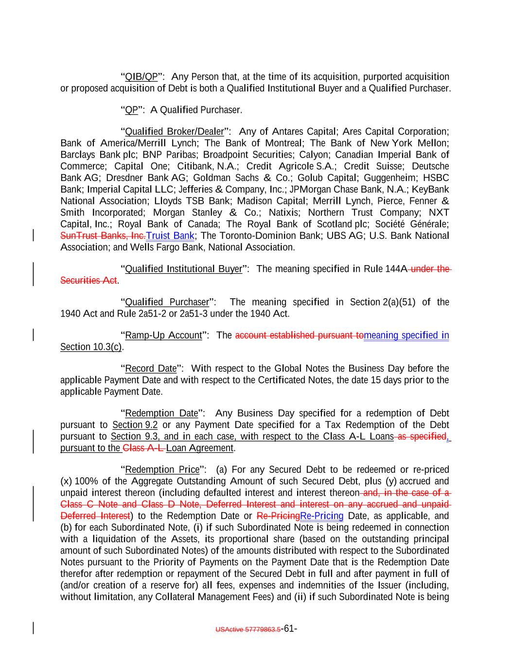 “QIB/QP”: Any Person that, at the time of its acquisition, purported acquisition or proposed acquisition of Debt is both a Qualified Institutional Buyer and a Qualified Purchaser. “QP”: A Qualified Purchaser. “Qualified Broker/Dealer”: Any of Antares Capital; Ares Capital Corporation; Bank of America/Merrill Lynch; The Bank of Montreal; The Bank of New York Mellon; Barclays Bank plc; BNP Paribas; Broadpoint Securities; Calyon; Canadian Imperial Bank of Commerce; Capital One; Citibank, N.A.; Credit Agricole S.A.; Credit Suisse; Deutsche Bank AG; Dresdner Bank AG; Goldman Sachs & Co.; Golub Capital; Guggenheim; HSBC Bank; Imperial Capital LLC; Jefferies & Company, Inc.; JPMorgan Chase Bank, N.A.; KeyBank National Association; Lloyds TSB Bank; Madison Capital; Merrill Lynch, Pierce, Fenner & Smith Incorporated; Morgan Stanley & Co.; Natixis; Northern Trust Company; NXT Capital, Inc.; Royal Bank of Canada; The Royal Bank of Scotland plc; Société Générale; SunTrust Banks, Inc.Truist Bank; The Toronto-Dominion Bank; UBS AG; U.S. Bank National Association; and Wells Fargo Bank, National Association. “Qualified Institutional Buyer”: The meaning specified in Rule 144A under the Securities Act. “Qualified Purchaser”: The meaning specified in Section 2(a)(51) of the 1940 Act and Rule 2a51-2 or 2a51-3 under the 1940 Act. “Ramp-Up Account”: The account established pursuant tomeaning specified in Section 10.3(c). “Record Date”: With respect to the Global Notes the Business Day before the applicable Payment Date and with respect to the Certificated Notes, the date 15 days prior to the applicable Payment Date. “Redemption Date”: Any Business Day specified for a redemption of Debt pursuant to Section 9.2 or any Payment Date specified for a Tax Redemption of the Debt pursuant to Section 9.3, and in each case, with respect to the Class A-L Loans as specified, pursuant to the Class A-L Loan Agreement. “Redemption Price”: (a) For any Secured Debt to be redeemed or re-priced (x) 100% of the Aggregate Outstanding Amount of such Secured Debt, plus (y) accrued and unpaid interest thereon (including defaulted interest and interest thereon and, in the case of a Class C Note and Class D Note, Deferred Interest and interest on any accrued and unpaid Deferred Interest) to the Redemption Date or Re-PricingRe-Pricing Date, as applicable, and (b) for each Subordinated Note, (i) if such Subordinated Note is being redeemed in connection with a liquidation of the Assets, its proportional share (based on the outstanding principal amount of such Subordinated Notes) of the amounts distributed with respect to the Subordinated Notes pursuant to the Priority of Payments on the Payment Date that is the Redemption Date therefor after redemption or repayment of the Secured Debt in full and after payment in full of (and/or creation of a reserve for) all fees, expenses and indemnities of the Issuer (including, without limitation, any Collateral Management Fees) and (ii) if such Subordinated Note is being USActive 57779863.5-61-