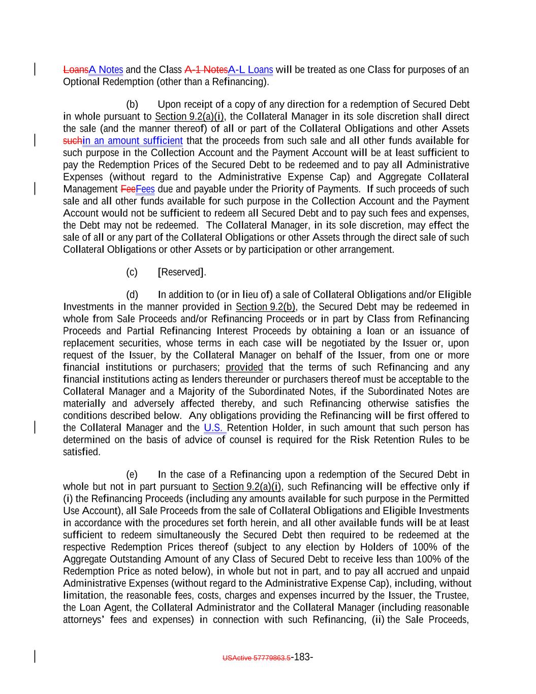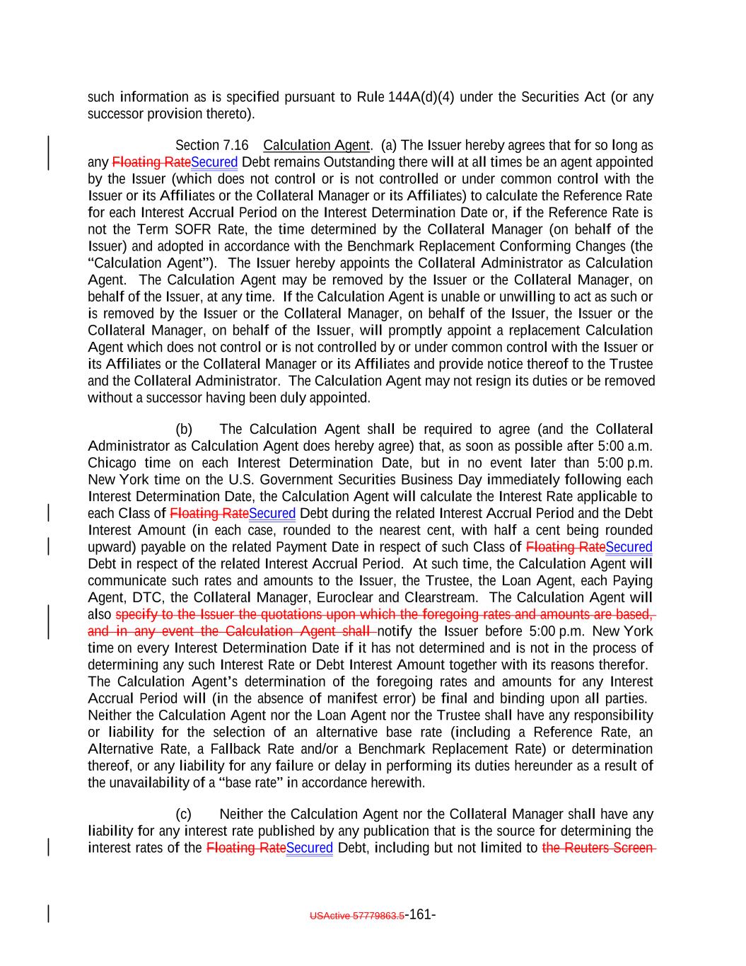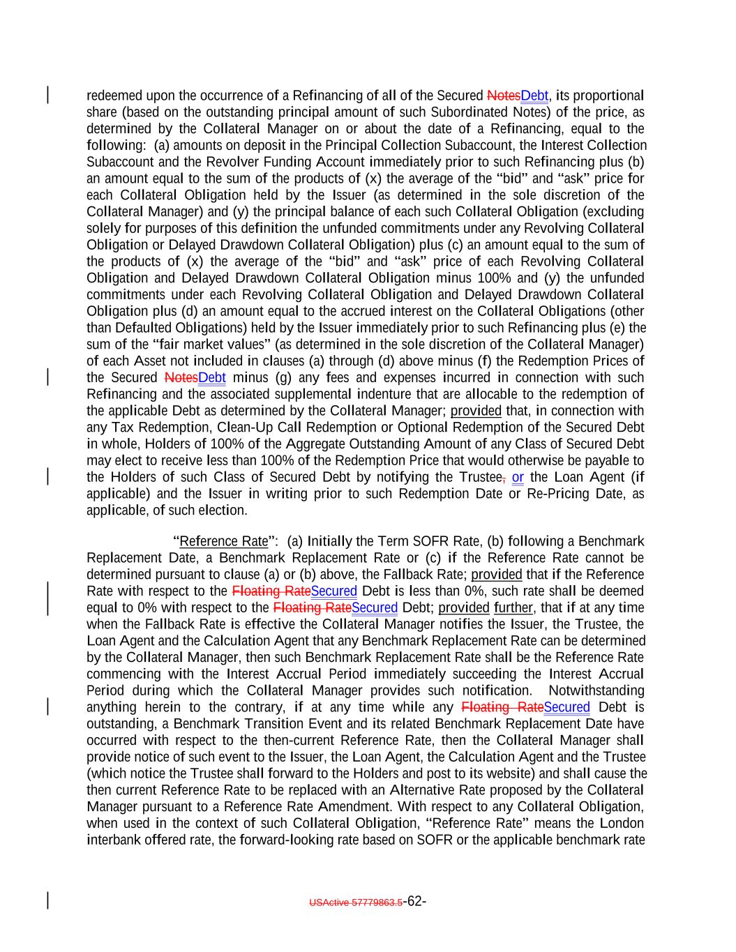 redeemed upon the occurrence of a Refinancing of all of the Secured NotesDebt, its proportional share (based on the outstanding principal amount of such Subordinated Notes) of the price, as determined by the Collateral Manager on or about the date of a Refinancing, equal to the following: (a) amounts on deposit in the Principal Collection Subaccount, the Interest Collection Subaccount and the Revolver Funding Account immediately prior to such Refinancing plus (b) an amount equal to the sum of the products of (x) the average of the “bid” and “ask” price for each Collateral Obligation held by the Issuer (as determined in the sole discretion of the Collateral Manager) and (y) the principal balance of each such Collateral Obligation (excluding solely for purposes of this definition the unfunded commitments under any Revolving Collateral Obligation or Delayed Drawdown Collateral Obligation) plus (c) an amount equal to the sum of the products of (x) the average of the “bid” and “ask” price of each Revolving Collateral Obligation and Delayed Drawdown Collateral Obligation minus 100% and (y) the unfunded commitments under each Revolving Collateral Obligation and Delayed Drawdown Collateral Obligation plus (d) an amount equal to the accrued interest on the Collateral Obligations (other than Defaulted Obligations) held by the Issuer immediately prior to such Refinancing plus (e) the sum of the “fair market values” (as determined in the sole discretion of the Collateral Manager) of each Asset not included in clauses (a) through (d) above minus (f) the Redemption Prices of the Secured NotesDebt minus (g) any fees and expenses incurred in connection with such Refinancing and the associated supplemental indenture that are allocable to the redemption of the applicable Debt as determined by the Collateral Manager; provided that, in connection with any Tax Redemption, Clean-Up Call Redemption or Optional Redemption of the Secured Debt in whole, Holders of 100% of the Aggregate Outstanding Amount of any Class of Secured Debt may elect to receive less than 100% of the Redemption Price that would otherwise be payable to the Holders of such Class of Secured Debt by notifying the Trustee, or the Loan Agent (if applicable) and the Issuer in writing prior to such Redemption Date or Re-Pricing Date, as applicable, of such election. “Reference Rate”: (a) Initially the Term SOFR Rate, (b) following a Benchmark Replacement Date, a Benchmark Replacement Rate or (c) if the Reference Rate cannot be determined pursuant to clause (a) or (b) above, the Fallback Rate; provided that if the Reference Rate with respect to the Floating RateSecured Debt is less than 0%, such rate shall be deemed equal to 0% with respect to the Floating RateSecured Debt; provided further, that if at any time when the Fallback Rate is effective the Collateral Manager notifies the Issuer, the Trustee, the Loan Agent and the Calculation Agent that any Benchmark Replacement Rate can be determined by the Collateral Manager, then such Benchmark Replacement Rate shall be the Reference Rate commencing with the Interest Accrual Period immediately succeeding the Interest Accrual Period during which the Collateral Manager provides such notification. Notwithstanding anything herein to the contrary, if at any time while any Floating RateSecured Debt is outstanding, a Benchmark Transition Event and its related Benchmark Replacement Date have occurred with respect to the then-current Reference Rate, then the Collateral Manager shall provide notice of such event to the Issuer, the Loan Agent, the Calculation Agent and the Trustee (which notice the Trustee shall forward to the Holders and post to its website) and shall cause the then current Reference Rate to be replaced with an Alternative Rate proposed by the Collateral Manager pursuant to a Reference Rate Amendment. With respect to any Collateral Obligation, when used in the context of such Collateral Obligation, “Reference Rate” means the London interbank offered rate, the forward-looking rate based on SOFR or the applicable benchmark rate USActive 57779863.5-62-
