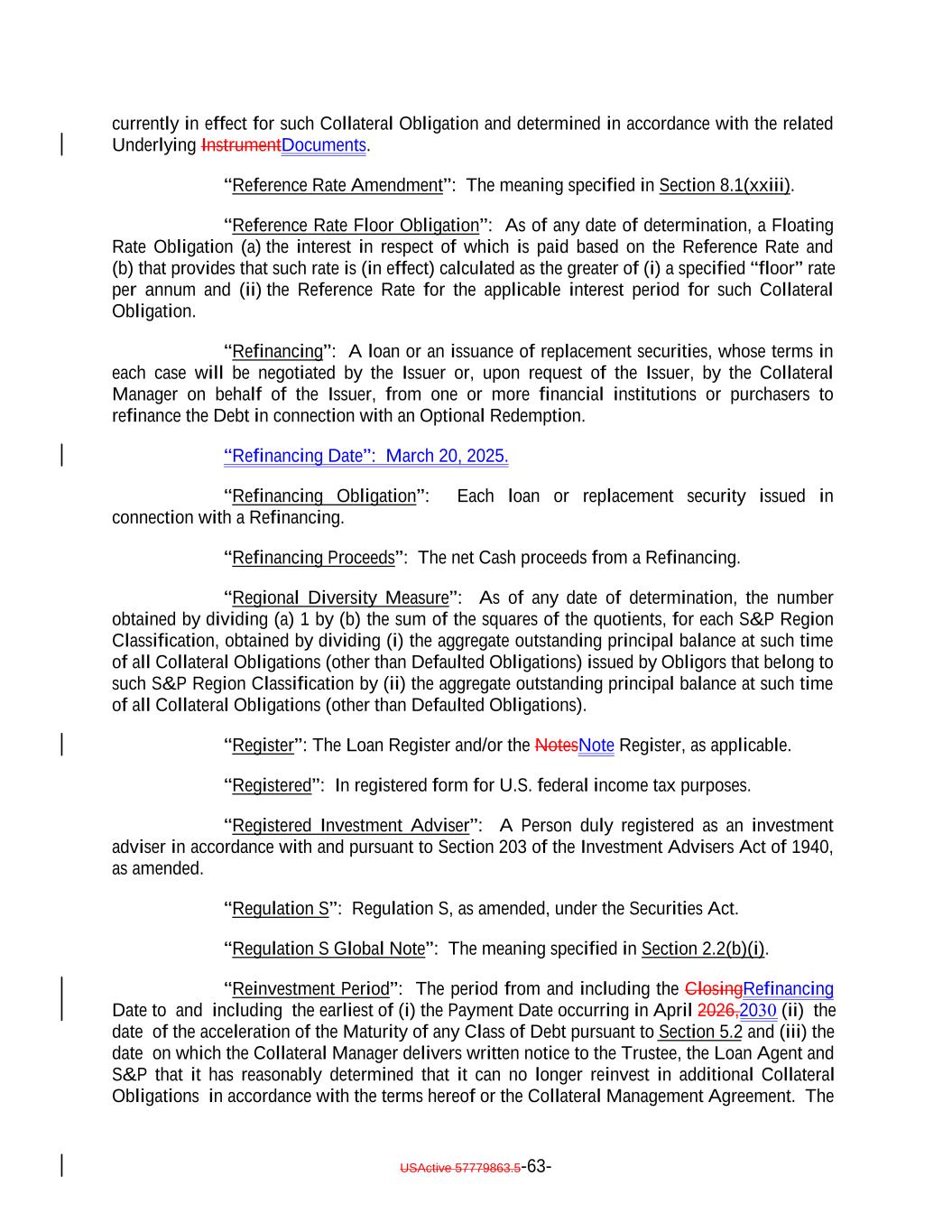 currently in effect for such Collateral Obligation and determined in accordance with the related Underlying InstrumentDocuments. “Reference Rate Amendment”: The meaning specified in Section 8.1(xxiii). “Reference Rate Floor Obligation”: As of any date of determination, a Floating Rate Obligation (a) the interest in respect of which is paid based on the Reference Rate and (b) that provides that such rate is (in effect) calculated as the greater of (i) a specified “floor” rate per annum and (ii) the Reference Rate for the applicable interest period for such Collateral Obligation. “Refinancing”: A loan or an issuance of replacement securities, whose terms in each case will be negotiated by the Issuer or, upon request of the Issuer, by the Collateral Manager on behalf of the Issuer, from one or more financial institutions or purchasers to refinance the Debt in connection with an Optional Redemption. “Refinancing Date”: March 20, 2025. “Refinancing Obligation”: Each loan or replacement security issued in connection with a Refinancing. “Refinancing Proceeds”: The net Cash proceeds from a Refinancing. “Regional Diversity Measure”: As of any date of determination, the number obtained by dividing (a) 1 by (b) the sum of the squares of the quotients, for each S&P Region Classification, obtained by dividing (i) the aggregate outstanding principal balance at such time of all Collateral Obligations (other than Defaulted Obligations) issued by Obligors that belong to such S&P Region Classification by (ii) the aggregate outstanding principal balance at such time of all Collateral Obligations (other than Defaulted Obligations). “Register”: The Loan Register and/or the NotesNote Register, as applicable. “Registered”: In registered form for U.S. federal income tax purposes. “Registered Investment Adviser”: A Person duly registered as an investment adviser in accordance with and pursuant to Section 203 of the Investment Advisers Act of 1940, as amended. “Regulation S”: Regulation S, as amended, under the Securities Act. “Regulation S Global Note”: The meaning specified in Section 2.2(b)(i). “Reinvestment Period”: The period from and including the ClosingRefinancing USActive 57779863.5 Date to and including the earliest of (i) the Payment Date occurring in April 2026,2030 (ii) the date of the acceleration of the Maturity of any Class of Debt pursuant to Section 5.2 and (iii) the date on which the Collateral Manager delivers written notice to the Trustee, the Loan Agent and S&P that it has reasonably determined that it can no longer reinvest in additional Collateral Obligations in accordance with the terms hereof or the Collateral Management Agreement. The -63-
