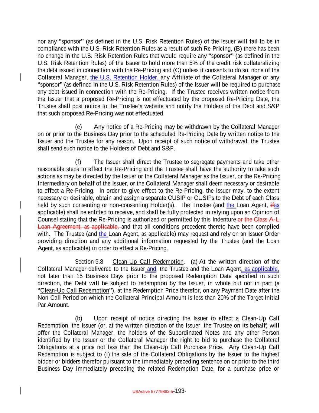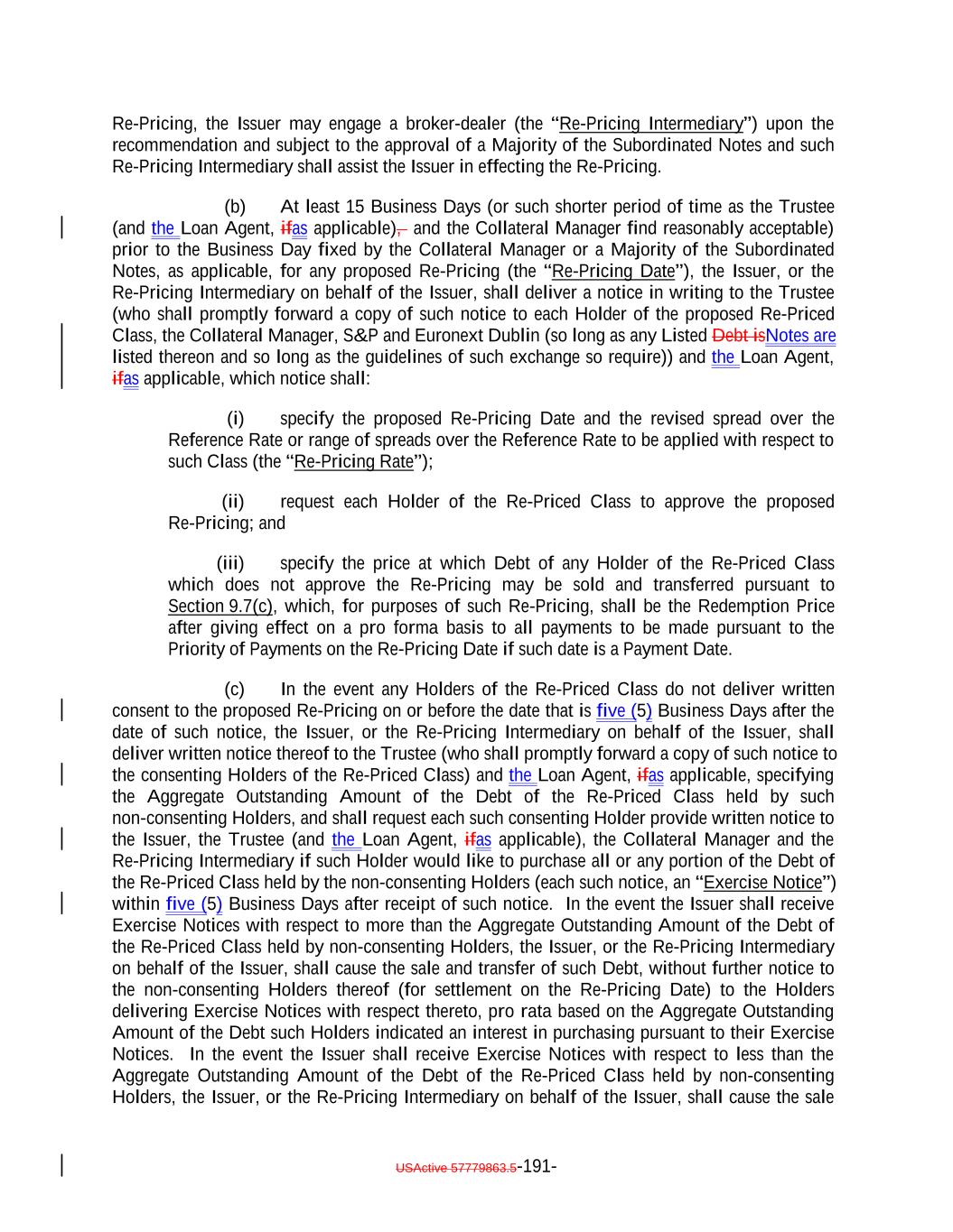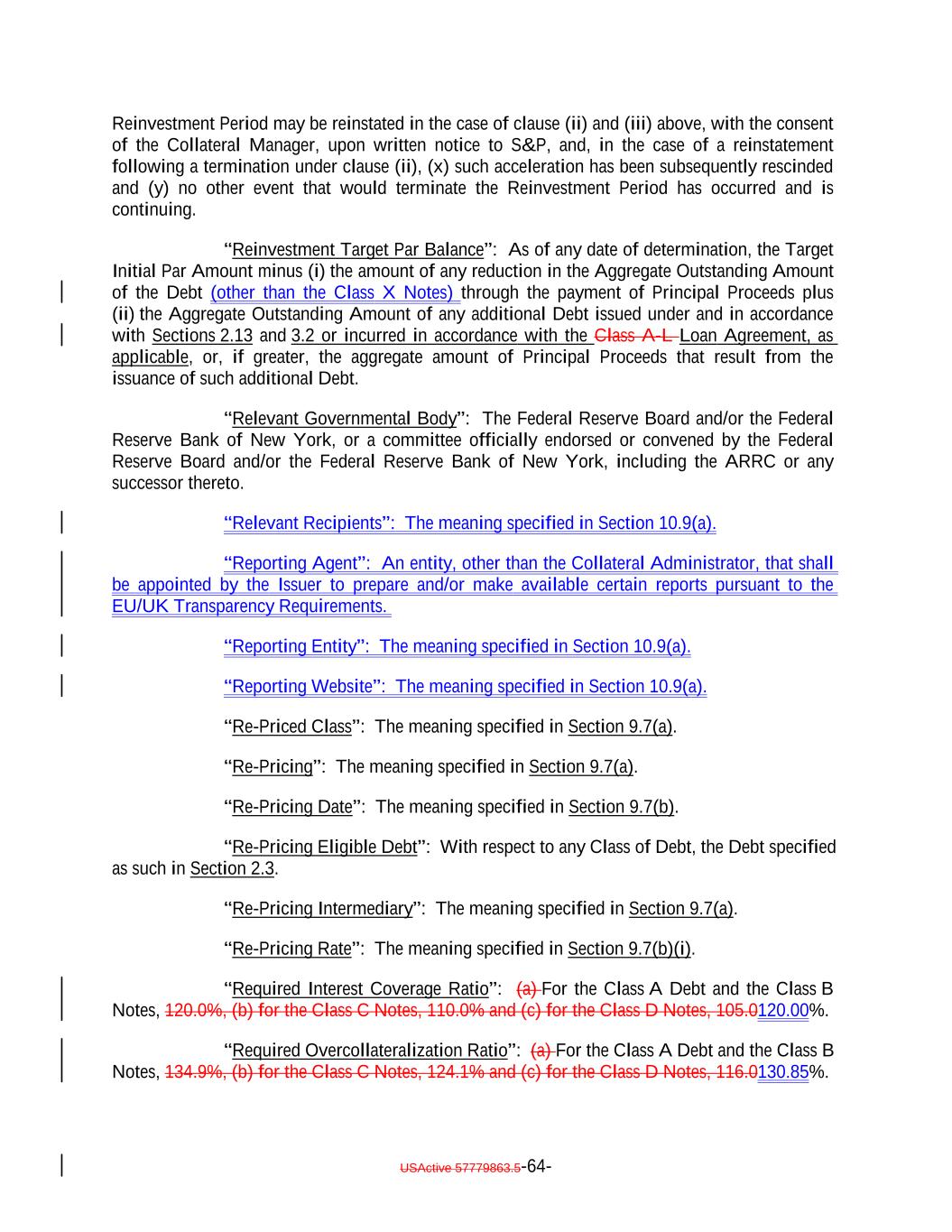 Reinvestment Period may be reinstated in the case of clause (ii) and (iii) above, with the consent of the Collateral Manager, upon written notice to S&P, and, in the case of a reinstatement following a termination under clause (ii), (x) such acceleration has been subsequently rescinded and (y) no other event that would terminate the Reinvestment Period has occurred and is continuing. “Reinvestment Target Par Balance”: As of any date of determination, the Target Initial Par Amount minus (i) the amount of any reduction in the Aggregate Outstanding Amount of the Debt (other than the Class X Notes) through the payment of Principal Proceeds plus (ii) the Aggregate Outstanding Amount of any additional Debt issued under and in accordance with Sections 2.13 and 3.2 or incurred in accordance with the Class A-L Loan Agreement, as applicable, or, if greater, the aggregate amount of Principal Proceeds that result from the issuance of such additional Debt. “Relevant Governmental Body”: The Federal Reserve Board and/or the Federal Reserve Bank of New York, or a committee officially endorsed or convened by the Federal Reserve Board and/or the Federal Reserve Bank of New York, including the ARRC or any successor thereto. “Relevant Recipients”: The meaning specified in Section 10.9(a). “Reporting Agent”: An entity, other than the Collateral Administrator, that shall be appointed by the Issuer to prepare and/or make available certain reports pursuant to the EU/UK Transparency Requirements. “Reporting Entity”: The meaning specified in Section 10.9(a). “Reporting Website”: The meaning specified in Section 10.9(a). “Re-Priced Class”: The meaning specified in Section 9.7(a). “Re-Pricing”: The meaning specified in Section 9.7(a). “Re-Pricing Date”: The meaning specified in Section 9.7(b). “Re-Pricing Eligible Debt”: With respect to any Class of Debt, the Debt specified as such in Section 2.3. “Re-Pricing Intermediary”: The meaning specified in Section 9.7(a). “Re-Pricing Rate”: The meaning specified in Section 9.7(b)(i). “Required Interest Coverage Ratio”: (a) For the Class A Debt and the Class B Notes, 120.0%, (b) for the Class C Notes, 110.0% and (c) for the Class D Notes, 105.0120.00%. “Required Overcollateralization Ratio”: (a) For the Class A Debt and the Class B Notes, 134.9%, (b) for the Class C Notes, 124.1% and (c) for the Class D Notes, 116.0130.85%. USActive 57779863.5-64-