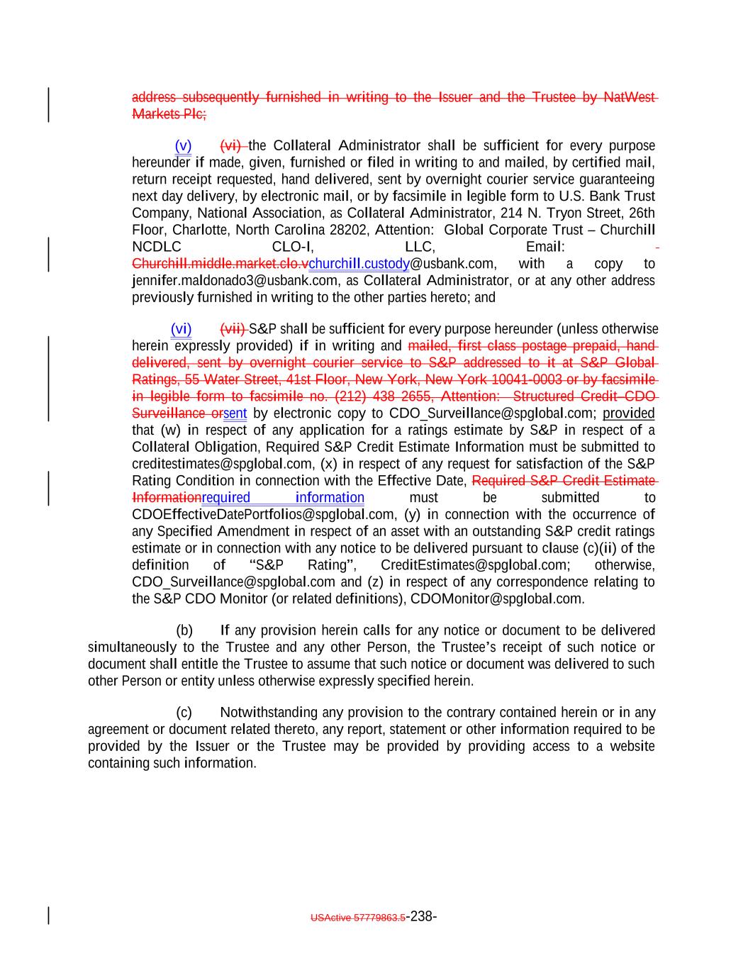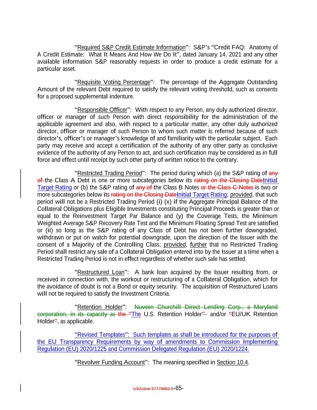 “Required S&P Credit Estimate Information”: S&P’s “Credit FAQ: Anatomy of A Credit Estimate: What It Means And How We Do It”, dated January 14, 2021 and any other available information S&P reasonably requests in order to produce a credit estimate for a particular asset. “Requisite Voting Percentage”: The percentage of the Aggregate Outstanding Amount of the relevant Debt required to satisfy the relevant voting threshold, such as consents for a proposed supplemental indenture. “Responsible Officer”: With respect to any Person, any duly authorized director, officer or manager of such Person with direct responsibility for the administration of the applicable agreement and also, with respect to a particular matter, any other duly authorized director, officer or manager of such Person to whom such matter is referred because of such director’s, officer’s or manager’s knowledge of and familiarity with the particular subject. Each party may receive and accept a certification of the authority of any other party as conclusive evidence of the authority of any Person to act, and such certification may be considered as in full force and effect until receipt by such other party of written notice to the contrary. “Restricted Trading Period”: The period during which (a) the S&P rating of any of the Class A Debt is one or more subcategories below its rating on the Closing DateInitial Target Rating or (b) the S&P rating of any of the Class B Notes or the Class C Notes is two or more subcategories below its rating on the Closing DateInitial Target Rating; provided, that such period will not be a Restricted Trading Period (i) (x) if the Aggregate Principal Balance of the Collateral Obligations plus Eligible Investments constituting Principal Proceeds is greater than or equal to the Reinvestment Target Par Balance and (y) the Coverage Tests, the Minimum Weighted Average S&P Recovery Rate Test and the Minimum Floating Spread Test are satisfied or (ii) so long as the S&P rating of any Class of Debt has not been further downgraded, withdrawn or put on watch for potential downgrade, upon the direction of the Issuer with the consent of a Majority of the Controlling Class; provided, further that no Restricted Trading Period shall restrict any sale of a Collateral Obligation entered into by the Issuer at a time when a Restricted Trading Period is not in effect regardless of whether such sale has settled. “Restructured Loan”: A bank loan acquired by the Issuer resulting from, or received in connection with, the workout or restructuring of a Collateral Obligation, which for the avoidance of doubt is not a Bond or equity security. The acquisition of Restructured Loans will not be required to satisfy the Investment Criteria. “Retention Holder”: Nuveen Churchill Direct Lending Corp., a Maryland corporation, in its capacity as the “The U.S. Retention Holder” and/or “EU/UK Retention Holder”, as applicable. “Revised Templates”: Such templates as shall be introduced for the purposes of the EU Transparency Requirements by way of amendments to Commission Implementing Regulation (EU) 2020/1225 and Commission Delegated Regulation (EU) 2020/1224. “Revolver Funding Account”: The meaning specified in Section 10.4. USActive 57779863.5-65-