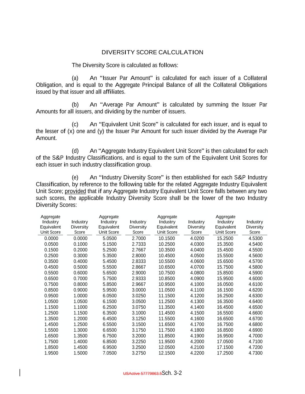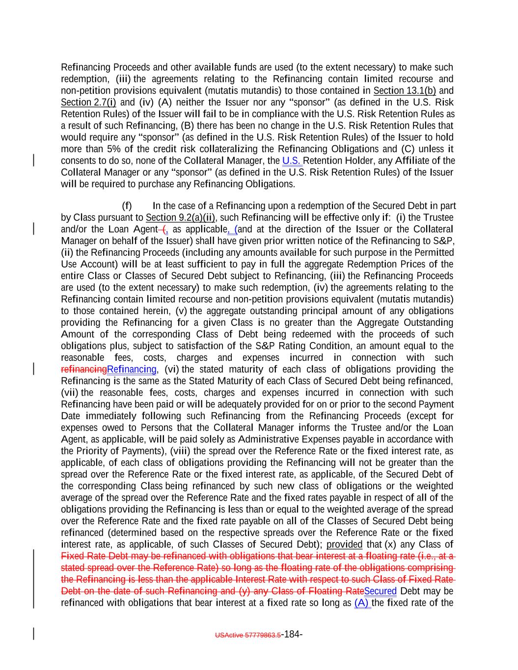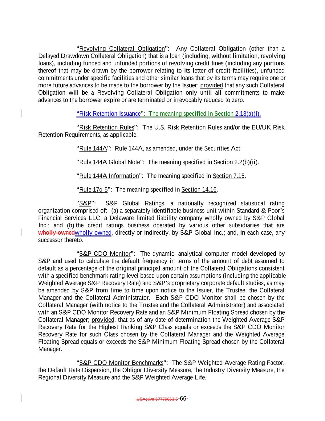 “Revolving Collateral Obligation”: Any Collateral Obligation (other than a Delayed Drawdown Collateral Obligation) that is a loan (including, without limitation, revolving loans), including funded and unfunded portions of revolving credit lines (including any portions thereof that may be drawn by the borrower relating to its letter of credit facilities), unfunded commitments under specific facilities and other similar loans that by its terms may require one or more future advances to be made to the borrower by the Issuer; provided that any such Collateral Obligation will be a Revolving Collateral Obligation only until all commitments to make advances to the borrower expire or are terminated or irrevocably reduced to zero. “Risk Retention Issuance”: The meaning specified in Section 2.13(a)(i). “Risk Retention Rules”: The U.S. Risk Retention Rules and/or the EU/UK Risk Retention Requirements, as applicable. “Rule 144A”: Rule 144A, as amended, under the Securities Act. “Rule 144A Global Note”: The meaning specified in Section 2.2(b)(ii). “Rule 144A Information”: The meaning specified in Section 7.15. “Rule 17g-5”: The meaning specified in Section 14.16. “S&P”: S&P Global Ratings, a nationally recognized statistical rating organization comprised of: (a) a separately identifiable business unit within Standard & Poor’s Financial Services LLC, a Delaware limited liability company wholly owned by S&P Global Inc.; and (b) the credit ratings business operated by various other subsidiaries that are wholly-ownedwholly owned, directly or indirectly, by S&P Global Inc.; and, in each case, any successor thereto. “S&P CDO Monitor”: The dynamic, analytical computer model developed by S&P and used to calculate the default frequency in terms of the amount of debt assumed to default as a percentage of the original principal amount of the Collateral Obligations consistent with a specified benchmark rating level based upon certain assumptions (including the applicable Weighted Average S&P Recovery Rate) and S&P’s proprietary corporate default studies, as may be amended by S&P from time to time upon notice to the Issuer, the Trustee, the Collateral Manager and the Collateral Administrator. Each S&P CDO Monitor shall be chosen by the Collateral Manager (with notice to the Trustee and the Collateral Administrator) and associated with an S&P CDO Monitor Recovery Rate and an S&P Minimum Floating Spread chosen by the Collateral Manager; provided, that as of any date of determination the Weighted Average S&P Recovery Rate for the Highest Ranking S&P Class equals or exceeds the S&P CDO Monitor Recovery Rate for such Class chosen by the Collateral Manager and the Weighted Average Floating Spread equals or exceeds the S&P Minimum Floating Spread chosen by the Collateral Manager. “S&P CDO Monitor Benchmarks”: The S&P Weighted Average Rating Factor, the Default Rate Dispersion, the Obligor Diversity Measure, the Industry Diversity Measure, the Regional Diversity Measure and the S&P Weighted Average Life. USActive 57779863.5-66-
