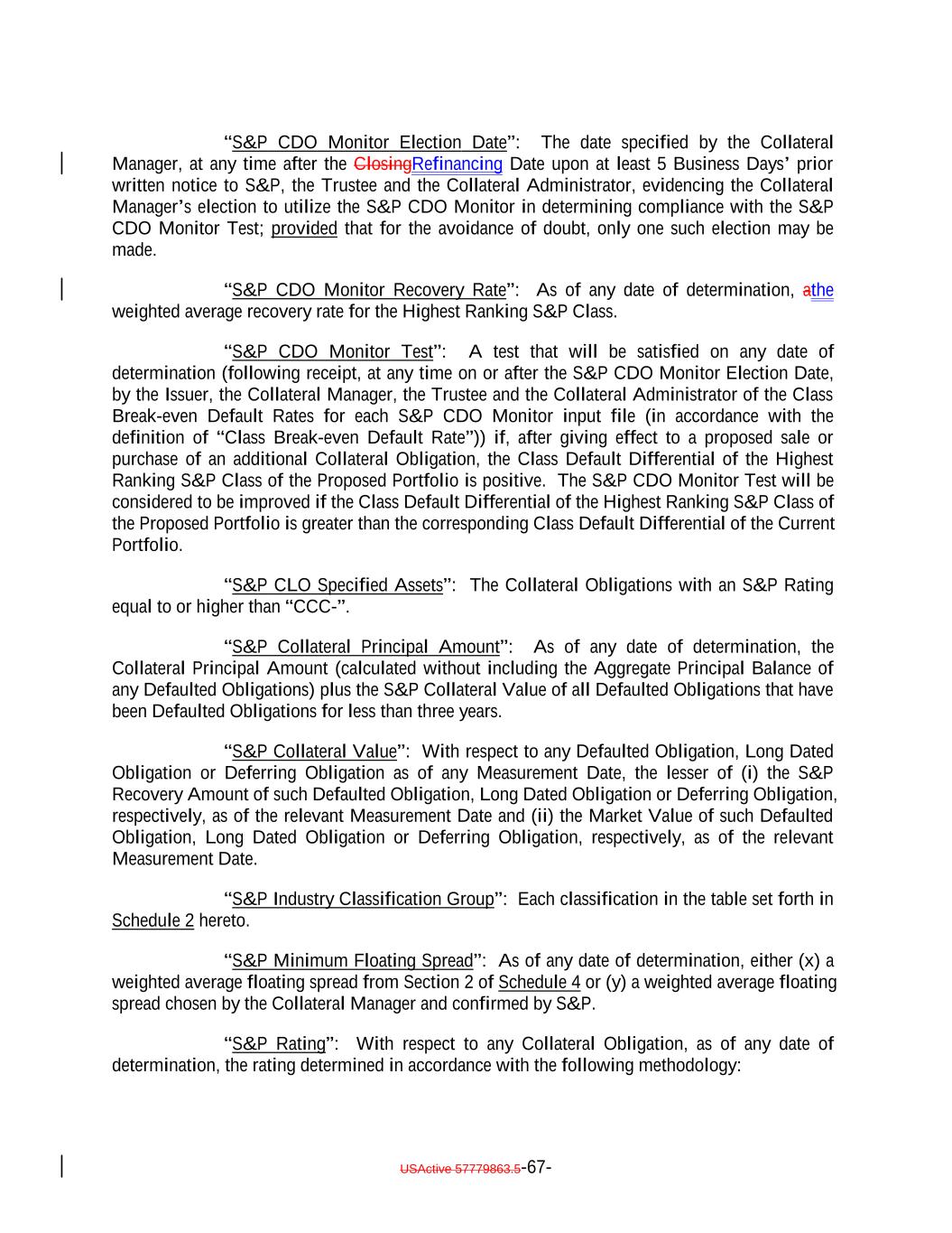 “S&P CDO Monitor Election Date”: The date specified by the Collateral Manager, at any time after the ClosingRefinancing Date upon at least 5 Business Days’ prior written notice to S&P, the Trustee and the Collateral Administrator, evidencing the Collateral Manager’s election to utilize the S&P CDO Monitor in determining compliance with the S&P CDO Monitor Test; provided that for the avoidance of doubt, only one such election may be made. “S&P CDO Monitor Recovery Rate”: As of any date of determination, athe weighted average recovery rate for the Highest Ranking S&P Class. “S&P CDO Monitor Test”: A test that will be satisfied on any date of determination (following receipt, at any time on or after the S&P CDO Monitor Election Date, by the Issuer, the Collateral Manager, the Trustee and the Collateral Administrator of the Class Break-even Default Rates for each S&P CDO Monitor input file (in accordance with the definition of “Class Break-even Default Rate”)) if, after giving effect to a proposed sale or purchase of an additional Collateral Obligation, the Class Default Differential of the Highest Ranking S&P Class of the Proposed Portfolio is positive. The S&P CDO Monitor Test will be considered to be improved if the Class Default Differential of the Highest Ranking S&P Class of the Proposed Portfolio is greater than the corresponding Class Default Differential of the Current Portfolio. “S&P CLO Specified Assets”: The Collateral Obligations with an S&P Rating equal to or higher than “CCC-”. “S&P Collateral Principal Amount”: As of any date of determination, the Collateral Principal Amount (calculated without including the Aggregate Principal Balance of any Defaulted Obligations) plus the S&P Collateral Value of all Defaulted Obligations that have been Defaulted Obligations for less than three years. “S&P Collateral Value”: With respect to any Defaulted Obligation, Long Dated Obligation or Deferring Obligation as of any Measurement Date, the lesser of (i) the S&P Recovery Amount of such Defaulted Obligation, Long Dated Obligation or Deferring Obligation, respectively, as of the relevant Measurement Date and (ii) the Market Value of such Defaulted Obligation, Long Dated Obligation or Deferring Obligation, respectively, as of the relevant Measurement Date. “S&P Industry Classification Group”: Each classification in the table set forth in Schedule 2 hereto. “S&P Minimum Floating Spread”: As of any date of determination, either (x) a weighted average floating spread from Section 2 of Schedule 4 or (y) a weighted average floating spread chosen by the Collateral Manager and confirmed by S&P. “S&P Rating”: With respect to any Collateral Obligation, as of any date of determination, the rating determined in accordance with the following methodology: USActive 57779863.5-67-