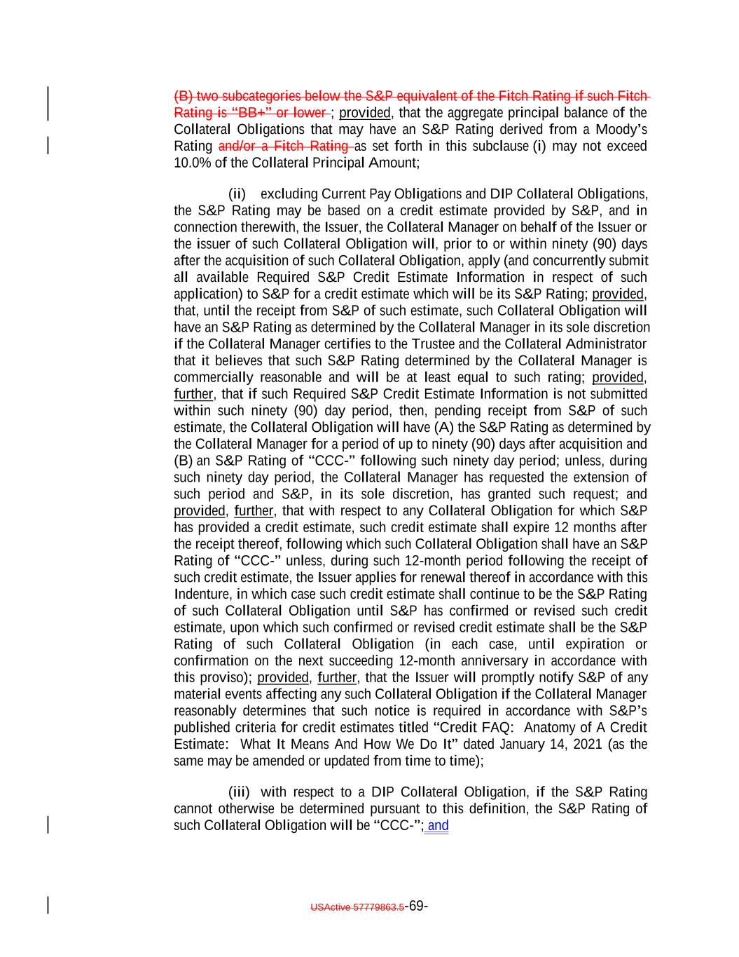 (B) two subcategories below the S&P equivalent of the Fitch Rating if such Fitch Rating is “BB+” or lower ; provided, that the aggregate principal balance of the Collateral Obligations that may have an S&P Rating derived from a Moody’s Rating and/or a Fitch Rating as set forth in this subclause (i) may not exceed 10.0% of the Collateral Principal Amount; (ii) excluding Current Pay Obligations and DIP Collateral Obligations, the S&P Rating may be based on a credit estimate provided by S&P, and in connection therewith, the Issuer, the Collateral Manager on behalf of the Issuer or the issuer of such Collateral Obligation will, prior to or within ninety (90) days after the acquisition of such Collateral Obligation, apply (and concurrently submit all available Required S&P Credit Estimate Information in respect of such application) to S&P for a credit estimate which will be its S&P Rating; provided, that, until the receipt from S&P of such estimate, such Collateral Obligation will have an S&P Rating as determined by the Collateral Manager in its sole discretion if the Collateral Manager certifies to the Trustee and the Collateral Administrator that it believes that such S&P Rating determined by the Collateral Manager is commercially reasonable and will be at least equal to such rating; provided, further, that if such Required S&P Credit Estimate Information is not submitted within such ninety (90) day period, then, pending receipt from S&P of such estimate, the Collateral Obligation will have (A) the S&P Rating as determined by the Collateral Manager for a period of up to ninety (90) days after acquisition and (B) an S&P Rating of “CCC-” following such ninety day period; unless, during such ninety day period, the Collateral Manager has requested the extension of such period and S&P, in its sole discretion, has granted such request; and provided, further, that with respect to any Collateral Obligation for which S&P has provided a credit estimate, such credit estimate shall expire 12 months after the receipt thereof, following which such Collateral Obligation shall have an S&P Rating of “CCC-” unless, during such 12-month period following the receipt of such credit estimate, the Issuer applies for renewal thereof in accordance with this Indenture, in which case such credit estimate shall continue to be the S&P Rating of such Collateral Obligation until S&P has confirmed or revised such credit estimate, upon which such confirmed or revised credit estimate shall be the S&P Rating of such Collateral Obligation (in each case, until expiration or confirmation on the next succeeding 12-month anniversary in accordance with this proviso); provided, further, that the Issuer will promptly notify S&P of any material events affecting any such Collateral Obligation if the Collateral Manager reasonably determines that such notice is required in accordance with S&P’s published criteria for credit estimates titled “Credit FAQ: Anatomy of A Credit Estimate: What It Means And How We Do It” dated January 14, 2021 (as the same may be amended or updated from time to time); (iii) with respect to a DIP Collateral Obligation, if the S&P Rating cannot otherwise be determined pursuant to this definition, the S&P Rating of such Collateral Obligation will be “CCC-”; and USActive 57779863.5-69-