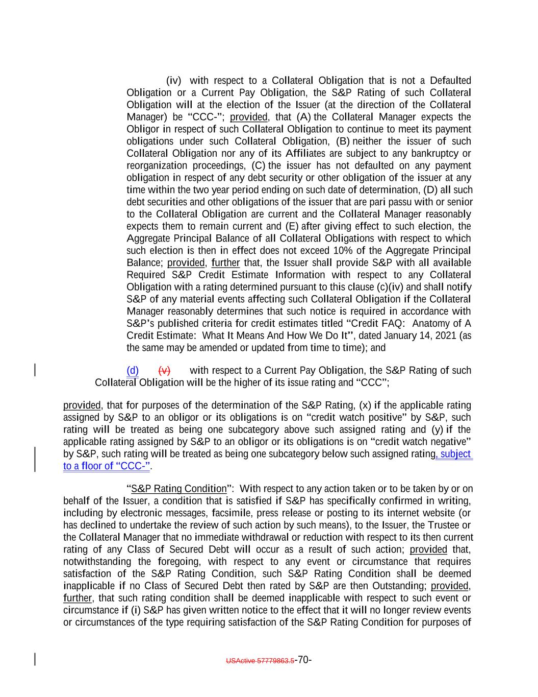 (iv) with respect to a Collateral Obligation that is not a Defaulted Obligation or a Current Pay Obligation, the S&P Rating of such Collateral Obligation will at the election of the Issuer (at the direction of the Collateral Manager) be “CCC-”; provided, that (A) the Collateral Manager expects the Obligor in respect of such Collateral Obligation to continue to meet its payment obligations under such Collateral Obligation, (B) neither the issuer of such Collateral Obligation nor any of its Affiliates are subject to any bankruptcy or reorganization proceedings, (C) the issuer has not defaulted on any payment obligation in respect of any debt security or other obligation of the issuer at any time within the two year period ending on such date of determination, (D) all such debt securities and other obligations of the issuer that are pari passu with or senior to the Collateral Obligation are current and the Collateral Manager reasonably expects them to remain current and (E) after giving effect to such election, the Aggregate Principal Balance of all Collateral Obligations with respect to which such election is then in effect does not exceed 10% of the Aggregate Principal Balance; provided, further that, the Issuer shall provide S&P with all available Required S&P Credit Estimate Information with respect to any Collateral Obligation with a rating determined pursuant to this clause (c)(iv) and shall notify S&P of any material events affecting such Collateral Obligation if the Collateral Manager reasonably determines that such notice is required in accordance with S&P’s published criteria for credit estimates titled “Credit FAQ: Anatomy of A Credit Estimate: What It Means And How We Do It”, dated January 14, 2021 (as the same may be amended or updated from time to time); and (d) (v) with respect to a Current Pay Obligation, the S&P Rating of such Collateral Obligation will be the higher of its issue rating and “CCC”; provided, that for purposes of the determination of the S&P Rating, (x) if the applicable rating assigned by S&P to an obligor or its obligations is on “credit watch positive” by S&P, such rating will be treated as being one subcategory above such assigned rating and (y) if the applicable rating assigned by S&P to an obligor or its obligations is on “credit watch negative” by S&P, such rating will be treated as being one subcategory below such assigned rating, subject to a floor of “CCC-”. “S&P Rating Condition”: With respect to any action taken or to be taken by or on behalf of the Issuer, a condition that is satisfied if S&P has specifically confirmed in writing, including by electronic messages, facsimile, press release or posting to its internet website (or has declined to undertake the review of such action by such means), to the Issuer, the Trustee or the Collateral Manager that no immediate withdrawal or reduction with respect to its then current rating of any Class of Secured Debt will occur as a result of such action; provided that, notwithstanding the foregoing, with respect to any event or circumstance that requires satisfaction of the S&P Rating Condition, such S&P Rating Condition shall be deemed inapplicable if no Class of Secured Debt then rated by S&P are then Outstanding; provided, further, that such rating condition shall be deemed inapplicable with respect to such event or circumstance if (i) S&P has given written notice to the effect that it will no longer review events or circumstances of the type requiring satisfaction of the S&P Rating Condition for purposes of USActive 57779863.5-70-