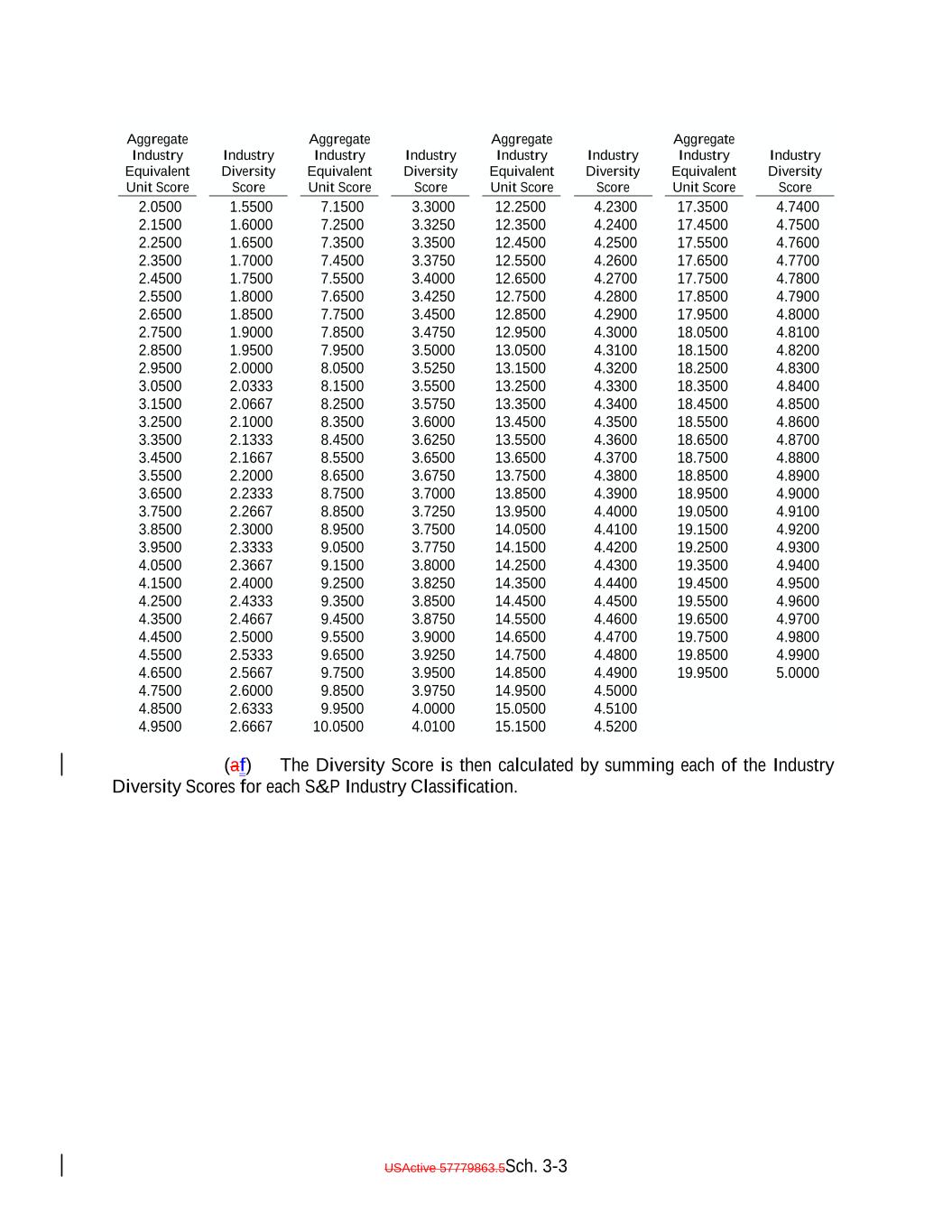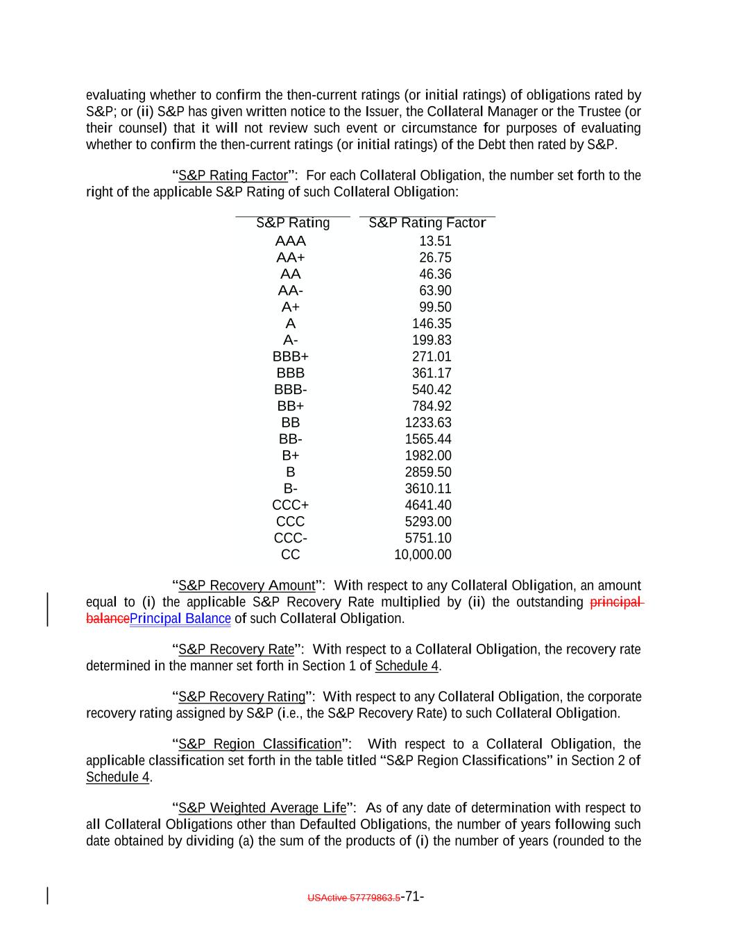 USActive 57779863.5-71- 13.51 BBB- 63.90 540.42 S&P Rating BB+ 784.92 A+ BB 99.50 1233.63 AA+ BB- S&P Rating Factor 1565.44 A 26.75 B+ 146.35 1982.00 evaluating whether to confirm the then-current ratings (or initial ratings) of obligations rated by S&P; or (ii) S&P has given written notice to the Issuer, the Collateral Manager or the Trustee (or their counsel) that it will not review such event or circumstance for purposes of evaluating whether to confirm the then-current ratings (or initial ratings) of the Debt then rated by S&P. “S&P Rating Factor”: For each Collateral Obligation, the number set forth to the right of the applicable S&P Rating of such Collateral Obligation: B 2859.50 A- B- 199.83 3610.11 AA CCC+ 4641.40 BBB+ 46.36 CCC 271.01 5293.00 AAA CCC- 5751.10 BBB CC 361.17 10,000.00 AA- “S&P Recovery Amount”: With respect to any Collateral Obligation, an amount equal to (i) the applicable S&P Recovery Rate multiplied by (ii) the outstanding principal balancePrincipal Balance of such Collateral Obligation. “S&P Recovery Rate”: With respect to a Collateral Obligation, the recovery rate determined in the manner set forth in Section 1 of Schedule 4. “S&P Recovery Rating”: With respect to any Collateral Obligation, the corporate recovery rating assigned by S&P (i.e., the S&P Recovery Rate) to such Collateral Obligation. “S&P Region Classification”: With respect to a Collateral Obligation, the applicable classification set forth in the table titled “S&P Region Classifications” in Section 2 of Schedule 4. “S&P Weighted Average Life”: As of any date of determination with respect to all Collateral Obligations other than Defaulted Obligations, the number of years following such date obtained by dividing (a) the sum of the products of (i) the number of years (rounded to the