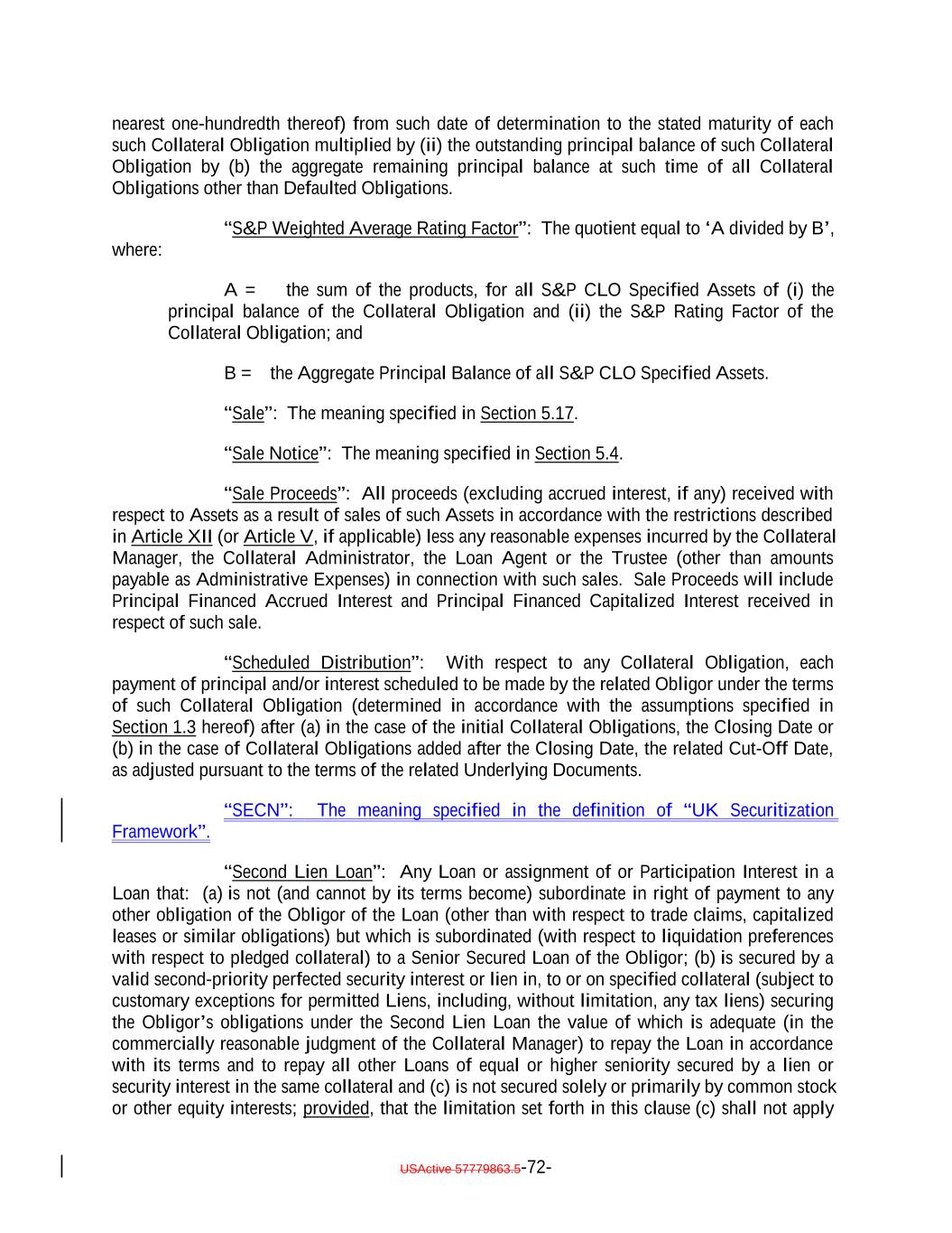 nearest one-hundredth thereof) from such date of determination to the stated maturity of each such Collateral Obligation multiplied by (ii) the outstanding principal balance of such Collateral Obligation by (b) the aggregate remaining principal balance at such time of all Collateral Obligations other than Defaulted Obligations. “S&P Weighted Average Rating Factor”: The quotient equal to ‘A divided by B’, where: A = the sum of the products, for all S&P CLO Specified Assets of (i) the principal balance of the Collateral Obligation and (ii) the S&P Rating Factor of the Collateral Obligation; and B = the Aggregate Principal Balance of all S&P CLO Specified Assets. “Sale”: The meaning specified in Section 5.17. “Sale Notice”: The meaning specified in Section 5.4. “Sale Proceeds”: All proceeds (excluding accrued interest, if any) received with respect to Assets as a result of sales of such Assets in accordance with the restrictions described in Article XII (or Article V, if applicable) less any reasonable expenses incurred by the Collateral Manager, the Collateral Administrator, the Loan Agent or the Trustee (other than amounts payable as Administrative Expenses) in connection with such sales. Sale Proceeds will include Principal Financed Accrued Interest and Principal Financed Capitalized Interest received in respect of such sale. “Scheduled Distribution”: With respect to any Collateral Obligation, each payment of principal and/or interest scheduled to be made by the related Obligor under the terms of such Collateral Obligation (determined in accordance with the assumptions specified in Section 1.3 hereof) after (a) in the case of the initial Collateral Obligations, the Closing Date or (b) in the case of Collateral Obligations added after the Closing Date, the related Cut-Off Date, as adjusted pursuant to the terms of the related Underlying Documents. “SECN”: The meaning specified in the definition of “UK Securitization Framework”. “Second Lien Loan”: Any Loan or assignment of or Participation Interest in a Loan that: (a) is not (and cannot by its terms become) subordinate in right of payment to any other obligation of the Obligor of the Loan (other than with respect to trade claims, capitalized leases or similar obligations) but which is subordinated (with respect to liquidation preferences with respect to pledged collateral) to a Senior Secured Loan of the Obligor; (b) is secured by a valid second-priority perfected security interest or lien in, to or on specified collateral (subject to customary exceptions for permitted Liens, including, without limitation, any tax liens) securing the Obligor’s obligations under the Second Lien Loan the value of which is adequate (in the commercially reasonable judgment of the Collateral Manager) to repay the Loan in accordance with its terms and to repay all other Loans of equal or higher seniority secured by a lien or security interest in the same collateral and (c) is not secured solely or primarily by common stock or other equity interests; provided, that the limitation set forth in this clause (c) shall not apply USActive 57779863.5-72-
