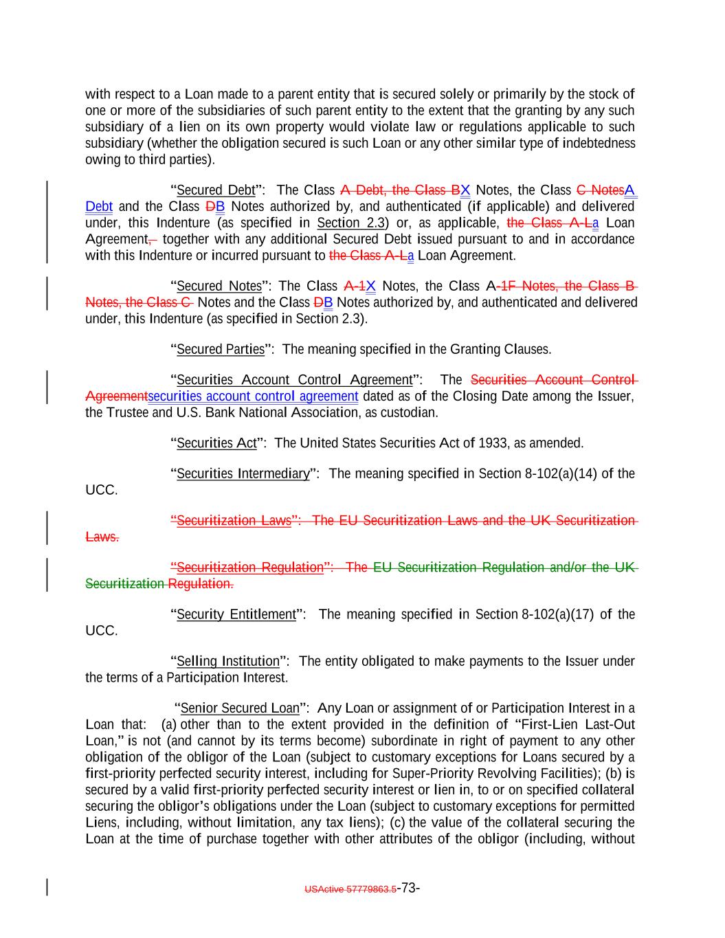 with respect to a Loan made to a parent entity that is secured solely or primarily by the stock of one or more of the subsidiaries of such parent entity to the extent that the granting by any such subsidiary of a lien on its own property would violate law or regulations applicable to such subsidiary (whether the obligation secured is such Loan or any other similar type of indebtedness owing to third parties). “Secured Debt”: The Class A Debt, the Class BX Notes, the Class C NotesA Debt and the Class DB Notes authorized by, and authenticated (if applicable) and delivered under, this Indenture (as specified in Section 2.3) or, as applicable, the Class A-La Loan Agreement, together with any additional Secured Debt issued pursuant to and in accordance with this Indenture or incurred pursuant to the Class A-La Loan Agreement. “Secured Notes”: The Class A-1X Notes, the Class A-1F Notes, the Class B Notes, the Class C Notes and the Class DB Notes authorized by, and authenticated and delivered under, this Indenture (as specified in Section 2.3). “Secured Parties”: The meaning specified in the Granting Clauses. “Securities Account Control Agreement”: The Securities Account Control Agreementsecurities account control agreement dated as of the Closing Date among the Issuer, the Trustee and U.S. Bank National Association, as custodian. “Securities Act”: The United States Securities Act of 1933, as amended. “Securities Intermediary”: The meaning specified in Section 8-102(a)(14) of the UCC. “Securitization Laws”: The EU Securitization Laws and the UK Securitization Laws. “Securitization Regulation”: The EU Securitization Regulation and/or the UK Securitization Regulation. “Security Entitlement”: The meaning specified in Section 8-102(a)(17) of the UCC. “Selling Institution”: The entity obligated to make payments to the Issuer under the terms of a Participation Interest. “Senior Secured Loan”: Any Loan or assignment of or Participation Interest in a Loan that: (a) other than to the extent provided in the definition of “First-Lien Last-Out Loan,” is not (and cannot by its terms become) subordinate in right of payment to any other obligation of the obligor of the Loan (subject to customary exceptions for Loans secured by a first-priority perfected security interest, including for Super-Priority Revolving Facilities); (b) is secured by a valid first-priority perfected security interest or lien in, to or on specified collateral securing the obligor’s obligations under the Loan (subject to customary exceptions for permitted Liens, including, without limitation, any tax liens); (c) the value of the collateral securing the Loan at the time of purchase together with other attributes of the obligor (including, without USActive 57779863.5-73-