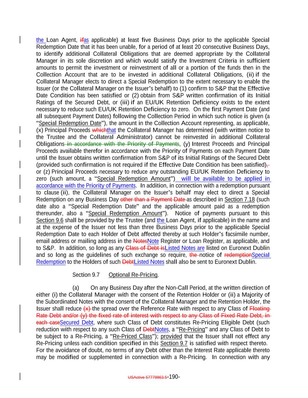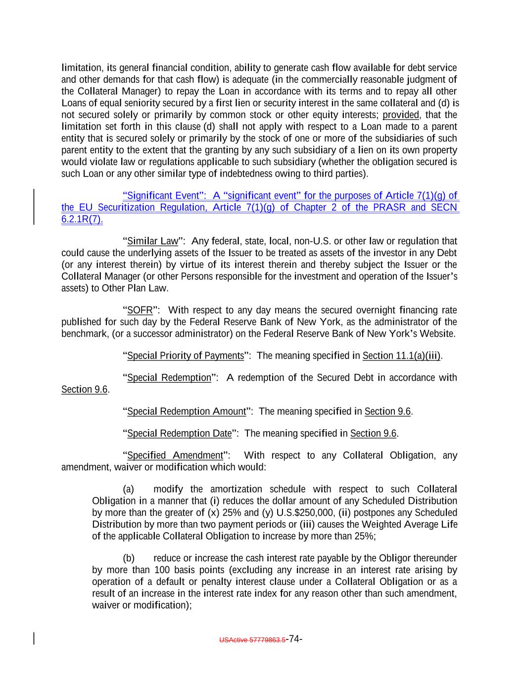 limitation, its general financial condition, ability to generate cash flow available for debt service and other demands for that cash flow) is adequate (in the commercially reasonable judgment of the Collateral Manager) to repay the Loan in accordance with its terms and to repay all other Loans of equal seniority secured by a first lien or security interest in the same collateral and (d) is not secured solely or primarily by common stock or other equity interests; provided, that the limitation set forth in this clause (d) shall not apply with respect to a Loan made to a parent entity that is secured solely or primarily by the stock of one or more of the subsidiaries of such parent entity to the extent that the granting by any such subsidiary of a lien on its own property would violate law or regulations applicable to such subsidiary (whether the obligation secured is such Loan or any other similar type of indebtedness owing to third parties). “Significant Event”: A “significant event” for the purposes of Article 7(1)(g) of the EU Securitization Regulation, Article 7(1)(g) of Chapter 2 of the PRASR and SECN 6.2.1R(7). “Similar Law”: Any federal, state, local, non-U.S. or other law or regulation that could cause the underlying assets of the Issuer to be treated as assets of the investor in any Debt (or any interest therein) by virtue of its interest therein and thereby subject the Issuer or the Collateral Manager (or other Persons responsible for the investment and operation of the Issuer’s assets) to Other Plan Law. “SOFR”: With respect to any day means the secured overnight financing rate published for such day by the Federal Reserve Bank of New York, as the administrator of the benchmark, (or a successor administrator) on the Federal Reserve Bank of New York’s Website. “Special Priority of Payments”: The meaning specified in Section 11.1(a)(iii). “Special Redemption”: A redemption of the Secured Debt in accordance with Section 9.6. “Special Redemption Amount”: The meaning specified in Section 9.6. “Special Redemption Date”: The meaning specified in Section 9.6. “Specified Amendment”: With respect to any Collateral Obligation, any amendment, waiver or modification which would: (a) modify the amortization schedule with respect to such Collateral Obligation in a manner that (i) reduces the dollar amount of any Scheduled Distribution by more than the greater of (x) 25% and (y) U.S.$250,000, (ii) postpones any Scheduled Distribution by more than two payment periods or (iii) causes the Weighted Average Life of the applicable Collateral Obligation to increase by more than 25%; (b) reduce or increase the cash interest rate payable by the Obligor thereunder by more than 100 basis points (excluding any increase in an interest rate arising by operation of a default or penalty interest clause under a Collateral Obligation or as a result of an increase in the interest rate index for any reason other than such amendment, waiver or modification); USActive 57779863.5-74-