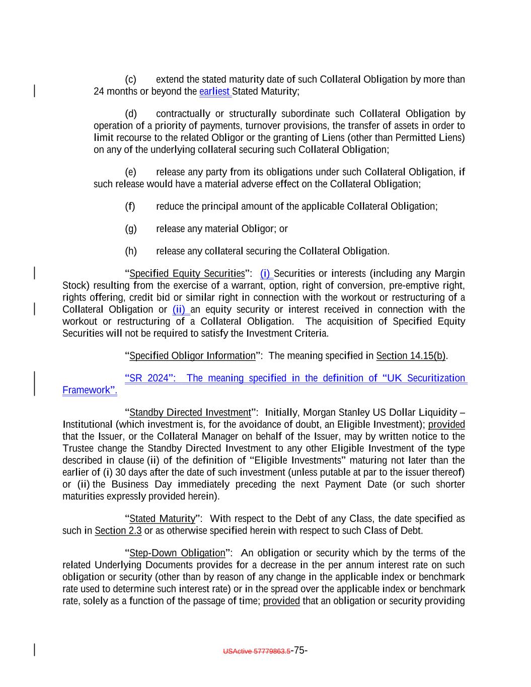 (c) extend the stated maturity date of such Collateral Obligation by more than 24 months or beyond the earliest Stated Maturity; (d) contractually or structurally subordinate such Collateral Obligation by operation of a priority of payments, turnover provisions, the transfer of assets in order to limit recourse to the related Obligor or the granting of Liens (other than Permitted Liens) on any of the underlying collateral securing such Collateral Obligation; (e) release any party from its obligations under such Collateral Obligation, if such release would have a material adverse effect on the Collateral Obligation; (f) reduce the principal amount of the applicable Collateral Obligation; (g) release any material Obligor; or (h) release any collateral securing the Collateral Obligation. “Specified Equity Securities”: (i) Securities or interests (including any Margin Stock) resulting from the exercise of a warrant, option, right of conversion, pre-emptive right, rights offering, credit bid or similar right in connection with the workout or restructuring of a Collateral Obligation or (ii) an equity security or interest received in connection with the workout or restructuring of a Collateral Obligation. The acquisition of Specified Equity Securities will not be required to satisfy the Investment Criteria. “Specified Obligor Information”: The meaning specified in Section 14.15(b). “SR 2024”: The meaning specified in the definition of “UK Securitization Framework”. “Standby Directed Investment”: Initially, Morgan Stanley US Dollar Liquidity – Institutional (which investment is, for the avoidance of doubt, an Eligible Investment); provided that the Issuer, or the Collateral Manager on behalf of the Issuer, may by written notice to the Trustee change the Standby Directed Investment to any other Eligible Investment of the type described in clause (ii) of the definition of “Eligible Investments” maturing not later than the earlier of (i) 30 days after the date of such investment (unless putable at par to the issuer thereof) or (ii) the Business Day immediately preceding the next Payment Date (or such shorter maturities expressly provided herein). “Stated Maturity”: With respect to the Debt of any Class, the date specified as such in Section 2.3 or as otherwise specified herein with respect to such Class of Debt. “Step-Down Obligation”: An obligation or security which by the terms of the related Underlying Documents provides for a decrease in the per annum interest rate on such obligation or security (other than by reason of any change in the applicable index or benchmark rate used to determine such interest rate) or in the spread over the applicable index or benchmark rate, solely as a function of the passage of time; provided that an obligation or security providing USActive 57779863.5-75-