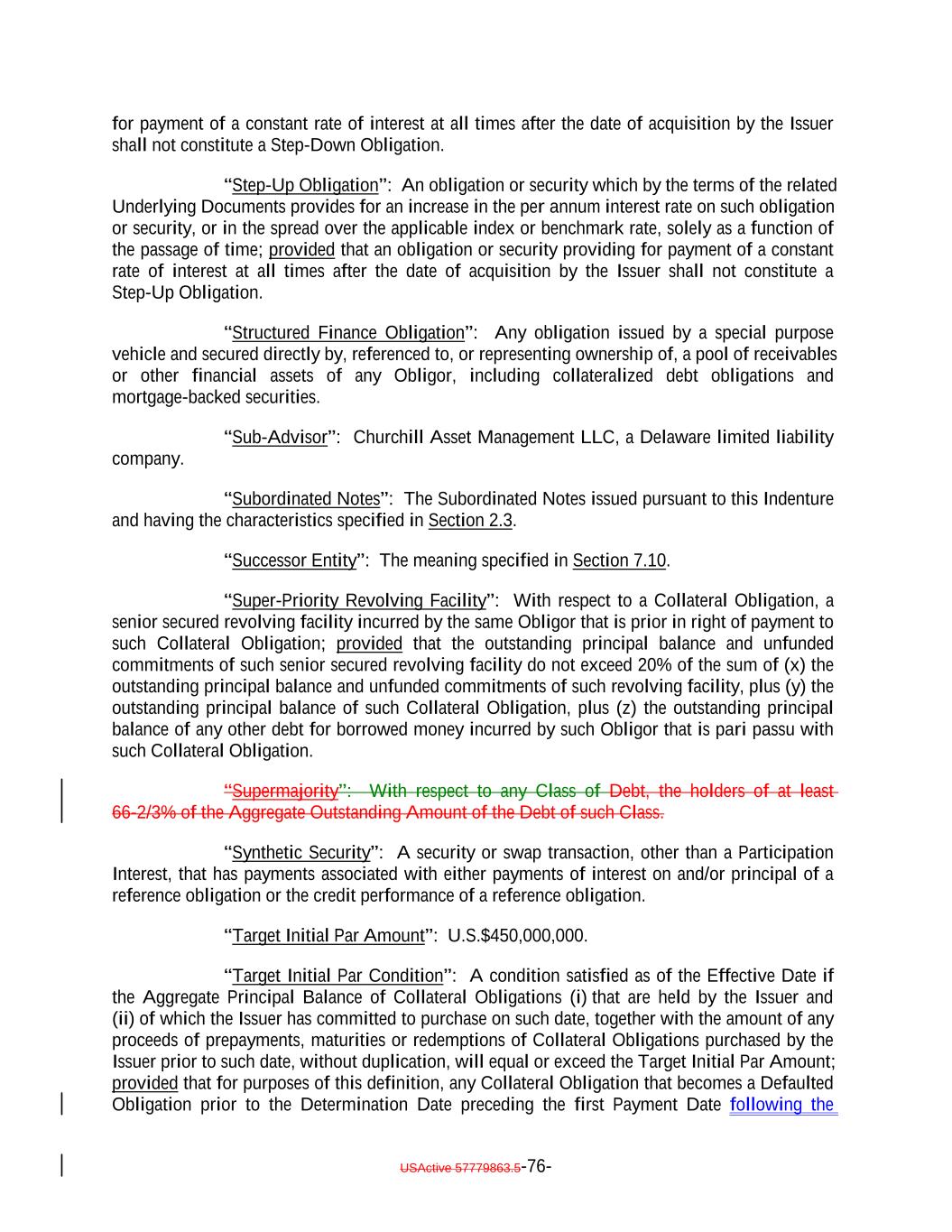 for payment of a constant rate of interest at all times after the date of acquisition by the Issuer shall not constitute a Step-Down Obligation. “Step-Up Obligation”: An obligation or security which by the terms of the related Underlying Documents provides for an increase in the per annum interest rate on such obligation or security, or in the spread over the applicable index or benchmark rate, solely as a function of the passage of time; provided that an obligation or security providing for payment of a constant rate of interest at all times after the date of acquisition by the Issuer shall not constitute a Step-Up Obligation. “Structured Finance Obligation”: Any obligation issued by a special purpose vehicle and secured directly by, referenced to, or representing ownership of, a pool of receivables or other financial assets of any Obligor, including collateralized debt obligations and mortgage-backed securities. “Sub-Advisor”: Churchill Asset Management LLC, a Delaware limited liability company. “Subordinated Notes”: The Subordinated Notes issued pursuant to this Indenture and having the characteristics specified in Section 2.3. “Successor Entity”: The meaning specified in Section 7.10. “Super-Priority Revolving Facility”: With respect to a Collateral Obligation, a senior secured revolving facility incurred by the same Obligor that is prior in right of payment to such Collateral Obligation; provided that the outstanding principal balance and unfunded commitments of such senior secured revolving facility do not exceed 20% of the sum of (x) the outstanding principal balance and unfunded commitments of such revolving facility, plus (y) the outstanding principal balance of such Collateral Obligation, plus (z) the outstanding principal balance of any other debt for borrowed money incurred by such Obligor that is pari passu with such Collateral Obligation. “Supermajority”: With respect to any Class of Debt, the holders of at least 66-2/3% of the Aggregate Outstanding Amount of the Debt of such Class. “Synthetic Security”: A security or swap transaction, other than a Participation Interest, that has payments associated with either payments of interest on and/or principal of a reference obligation or the credit performance of a reference obligation. “Target Initial Par Amount”: U.S.$450,000,000. “Target Initial Par Condition”: A condition satisfied as of the Effective Date if the Aggregate Principal Balance of Collateral Obligations (i) that are held by the Issuer and (ii) of which the Issuer has committed to purchase on such date, together with the amount of any proceeds of prepayments, maturities or redemptions of Collateral Obligations purchased by the Issuer prior to such date, without duplication, will equal or exceed the Target Initial Par Amount; provided that for purposes of this definition, any Collateral Obligation that becomes a Defaulted Obligation prior to the Determination Date preceding the first Payment Date following the USActive 57779863.5-76-
