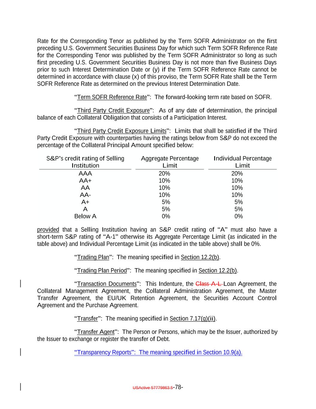 USActive 57779863.5-78- 10% 20% AA- 20% 10% Aggregate Percentage Limit 10% Rate for the Corresponding Tenor as published by the Term SOFR Administrator on the first preceding U.S. Government Securities Business Day for which such Term SOFR Reference Rate for the Corresponding Tenor was published by the Term SOFR Administrator so long as such first preceding U.S. Government Securities Business Day is not more than five Business Days prior to such Interest Determination Date or (y) if the Term SOFR Reference Rate cannot be determined in accordance with clause (x) of this proviso, the Term SOFR Rate shall be the Term SOFR Reference Rate as determined on the previous Interest Determination Date. “Term SOFR Reference Rate”: The forward-looking term rate based on SOFR. “Third Party Credit Exposure”: As of any date of determination, the principal balance of each Collateral Obligation that consists of a Participation Interest. “Third Party Credit Exposure Limits”: Limits that shall be satisfied if the Third Party Credit Exposure with counterparties having the ratings below from S&P do not exceed the percentage of the Collateral Principal Amount specified below: A+ AA+ 5% Individual Percentage Limit 5% 10% A 10% 5% 5% Below A AA 0% AAA 0% 10% provided that a Selling Institution having an S&P credit rating of “A” must also have a short-term S&P rating of “A-1” otherwise its Aggregate Percentage Limit (as indicated in the table above) and Individual Percentage Limit (as indicated in the table above) shall be 0%. “Trading Plan”: The meaning specified in Section 12.2(b). “Trading Plan Period”: The meaning specified in Section 12.2(b). “Transaction Documents”: This Indenture, the Class A-L Loan Agreement, the Collateral Management Agreement, the Collateral Administration Agreement, the Master Transfer Agreement, the EU/UK Retention Agreement, the Securities Account Control Agreement and the Purchase Agreement. “Transfer”: The meaning specified in Section 7.17(g)(ii). “Transfer Agent”: The Person or Persons, which may be the Issuer, authorized by the Issuer to exchange or register the transfer of Debt. “Transparency Reports”: The meaning specified in Section 10.9(a). S&P’s credit rating of Selling Institution