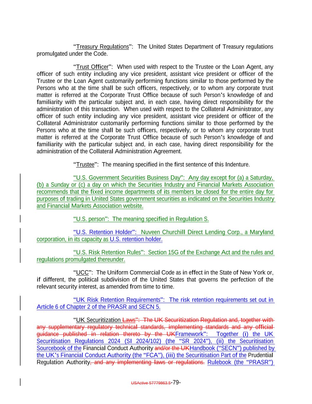 “Treasury Regulations”: The United States Department of Treasury regulations promulgated under the Code. “Trust Officer”: When used with respect to the Trustee or the Loan Agent, any officer of such entity including any vice president, assistant vice president or officer of the Trustee or the Loan Agent customarily performing functions similar to those performed by the Persons who at the time shall be such officers, respectively, or to whom any corporate trust matter is referred at the Corporate Trust Office because of such Person’s knowledge of and familiarity with the particular subject and, in each case, having direct responsibility for the administration of this transaction. When used with respect to the Collateral Administrator, any officer of such entity including any vice president, assistant vice president or officer of the Collateral Administrator customarily performing functions similar to those performed by the Persons who at the time shall be such officers, respectively, or to whom any corporate trust matter is referred at the Corporate Trust Office because of such Person’s knowledge of and familiarity with the particular subject and, in each case, having direct responsibility for the administration of the Collateral Administration Agreement. “Trustee”: The meaning specified in the first sentence of this Indenture. “U.S. Government Securities Business Day”: Any day except for (a) a Saturday, (b) a Sunday or (c) a day on which the Securities Industry and Financial Markets Association recommends that the fixed income departments of its members be closed for the entire day for purposes of trading in United States government securities as indicated on the Securities Industry and Financial Markets Association website. “U.S. person”: The meaning specified in Regulation S. “U.S. Retention Holder”: Nuveen Churchill Direct Lending Corp., a Maryland corporation, in its capacity as U.S. retention holder. “U.S. Risk Retention Rules”: Section 15G of the Exchange Act and the rules and regulations promulgated thereunder. “UCC”: The Uniform Commercial Code as in effect in the State of New York or, if different, the political subdivision of the United States that governs the perfection of the relevant security interest, as amended from time to time. “UK Risk Retention Requirements”: The risk retention requirements set out in Article 6 of Chapter 2 of the PRASR and SECN 5. “UK Securitization Laws”: The UK Securitization Regulation and, together with any supplementary regulatory technical standards, implementing standards and any official guidance published in relation thereto by the UKFramework”: Together (i) the UK Securitisation Regulations 2024 (SI 2024/102) (the “SR 2024”), (ii) the Securitisation Sourcebook of the Financial Conduct Authority and/or the UKHandbook (“SECN”) published by the UK’s Financial Conduct Authority (the “FCA”), (iii) the Securitisation Part of the Prudential Regulation Authority, and any implementing laws or regulations. Rulebook (the “PRASR”) USActive 57779863.5-79-