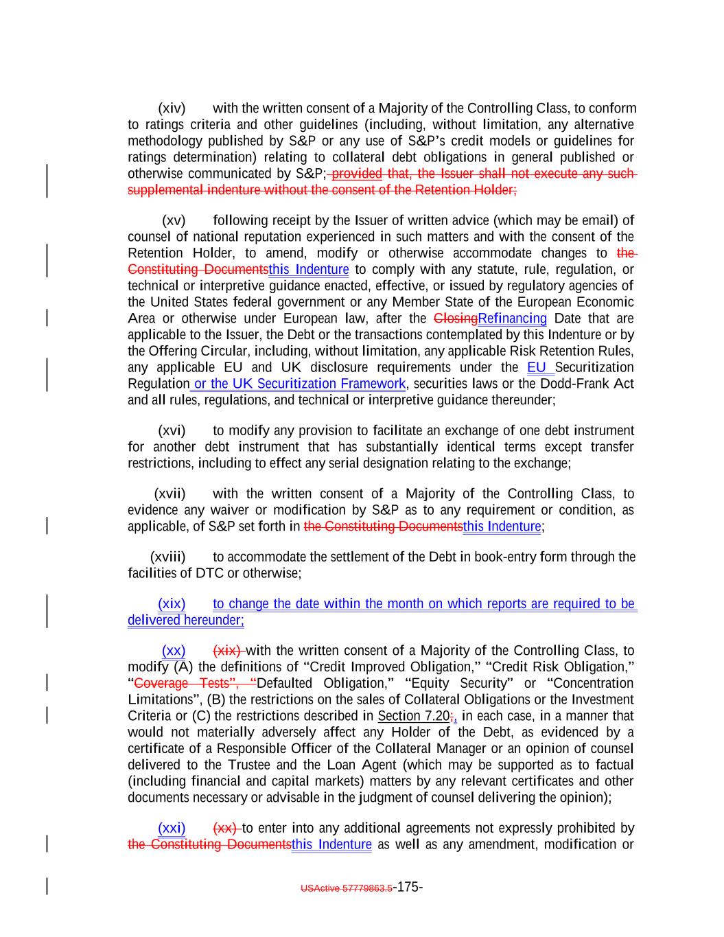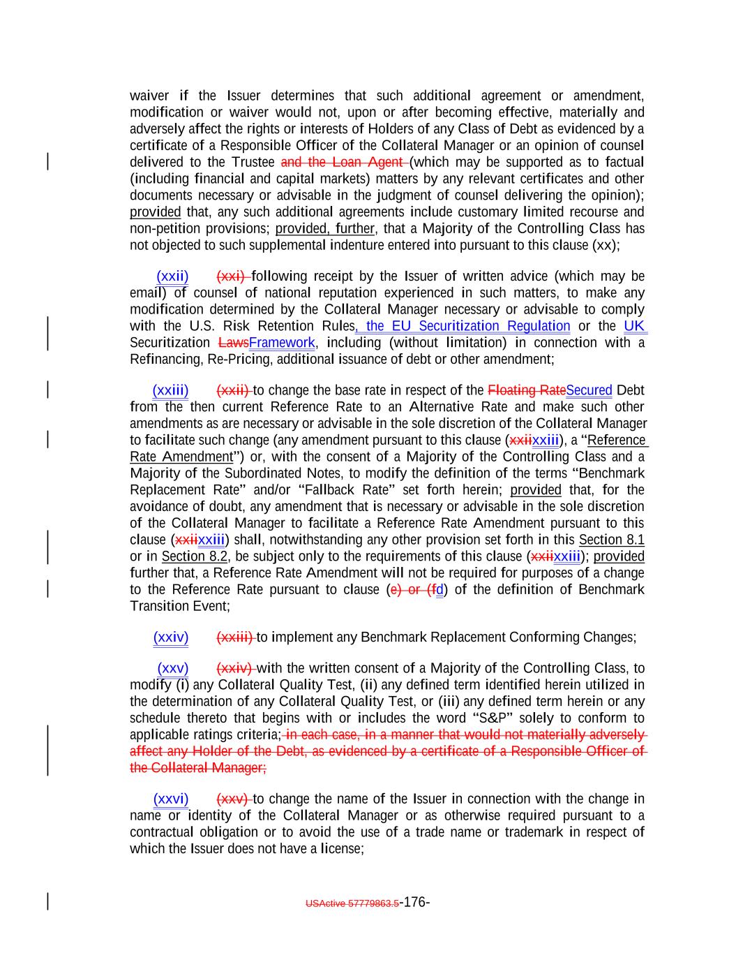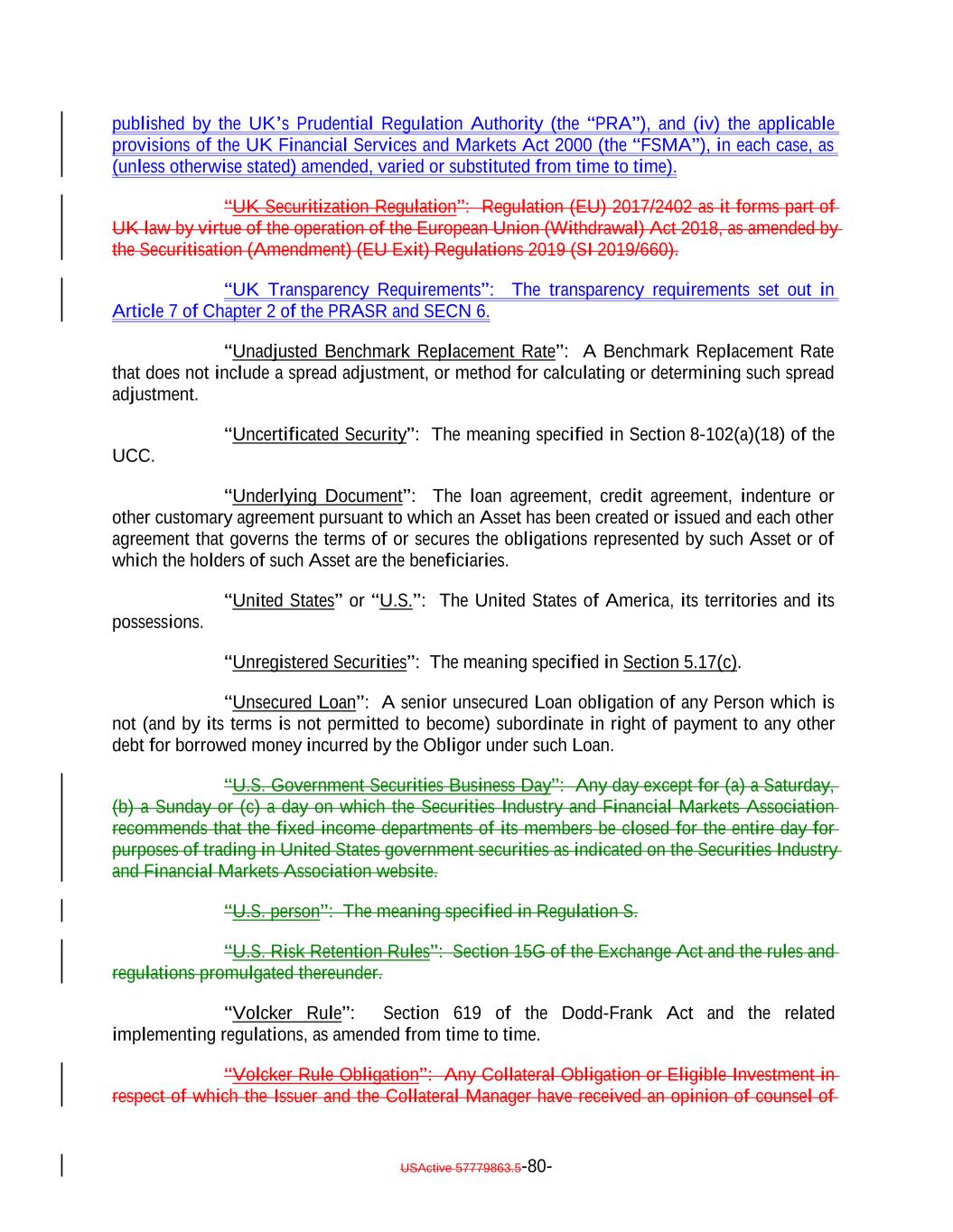 published by the UK’s Prudential Regulation Authority (the “PRA”), and (iv) the applicable provisions of the UK Financial Services and Markets Act 2000 (the “FSMA”), in each case, as (unless otherwise stated) amended, varied or substituted from time to time). “UK Securitization Regulation”: Regulation (EU) 2017/2402 as it forms part of UK law by virtue of the operation of the European Union (Withdrawal) Act 2018, as amended by the Securitisation (Amendment) (EU Exit) Regulations 2019 (SI 2019/660). “UK Transparency Requirements”: The transparency requirements set out in Article 7 of Chapter 2 of the PRASR and SECN 6. “Unadjusted Benchmark Replacement Rate”: A Benchmark Replacement Rate that does not include a spread adjustment, or method for calculating or determining such spread adjustment. “Uncertificated Security”: The meaning specified in Section 8-102(a)(18) of the UCC. “Underlying Document”: The loan agreement, credit agreement, indenture or other customary agreement pursuant to which an Asset has been created or issued and each other agreement that governs the terms of or secures the obligations represented by such Asset or of which the holders of such Asset are the beneficiaries. “United States” or “U.S.”: The United States of America, its territories and its possessions. “Unregistered Securities”: The meaning specified in Section 5.17(c). “Unsecured Loan”: A senior unsecured Loan obligation of any Person which is not (and by its terms is not permitted to become) subordinate in right of payment to any other debt for borrowed money incurred by the Obligor under such Loan. “U.S. Government Securities Business Day”: Any day except for (a) a Saturday, (b) a Sunday or (c) a day on which the Securities Industry and Financial Markets Association recommends that the fixed income departments of its members be closed for the entire day for purposes of trading in United States government securities as indicated on the Securities Industry and Financial Markets Association website. “U.S. person”: The meaning specified in Regulation S. “U.S. Risk Retention Rules”: Section 15G of the Exchange Act and the rules and regulations promulgated thereunder. “Volcker Rule”: Section 619 of the Dodd-Frank Act and the related implementing regulations, as amended from time to time. “Volcker Rule Obligation”: Any Collateral Obligation or Eligible Investment in respect of which the Issuer and the Collateral Manager have received an opinion of counsel of USActive 57779863.5-80-