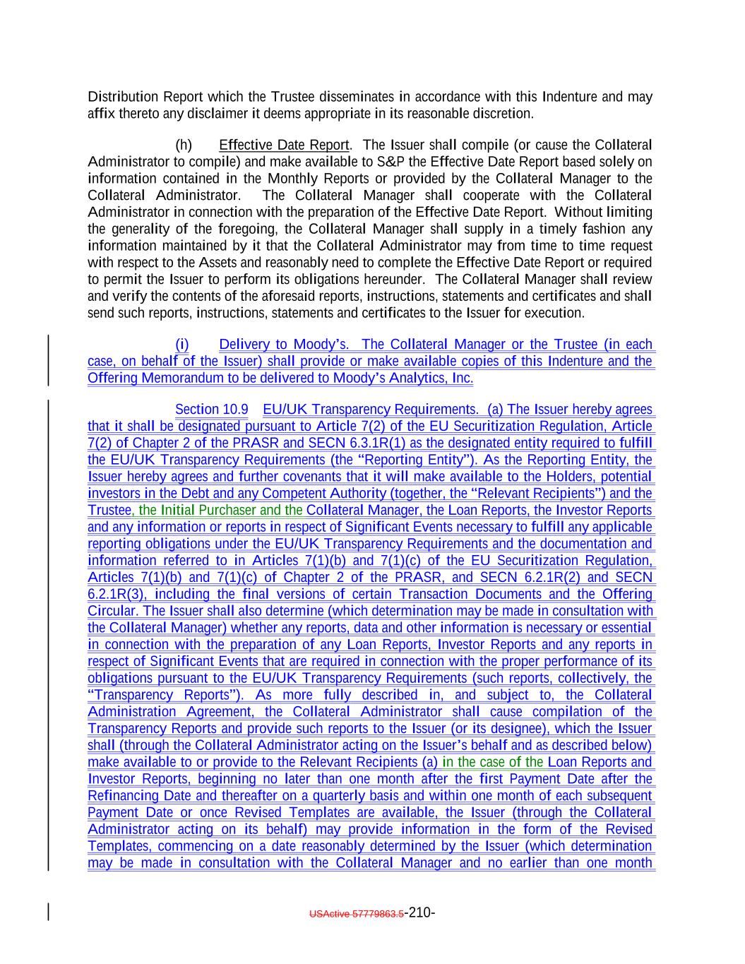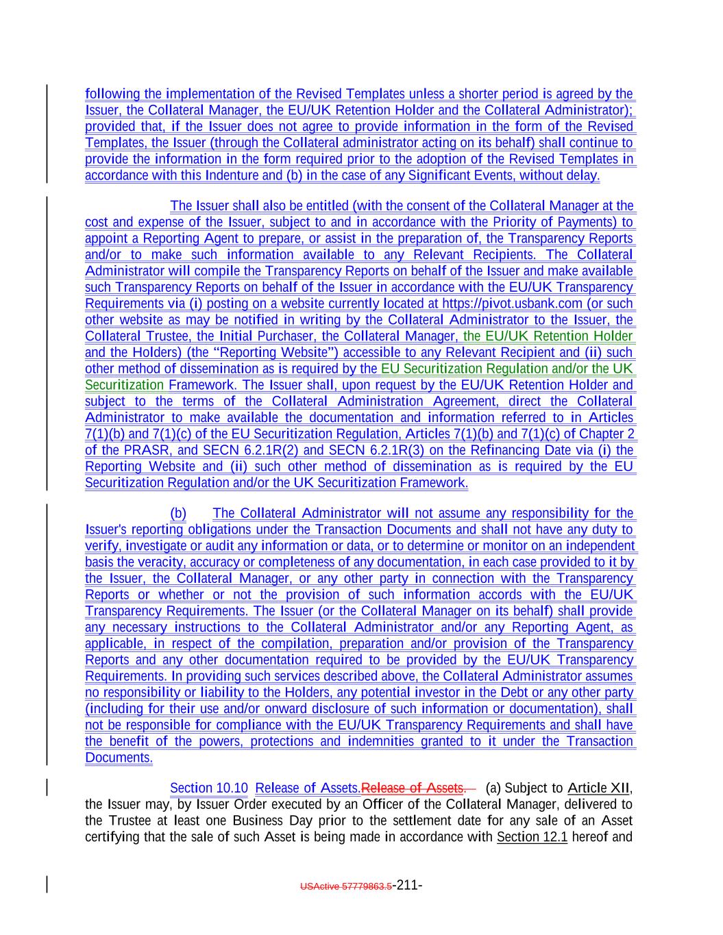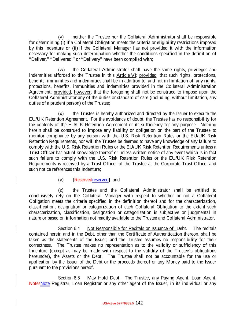 published by the UK’s Prudential Regulation Authority (the “PRA”), and (iv) the applicable provisions of the UK Financial Services and Markets Act 2000 (the “FSMA”), in each case, as (unless otherwise stated) amended, varied or substituted from time to time). “UK Securitization Regulation”: Regulation (EU) 2017/2402 as it forms part of UK law by virtue of the operation of the European Union (Withdrawal) Act 2018, as amended by the Securitisation (Amendment) (EU Exit) Regulations 2019 (SI 2019/660). “UK Transparency Requirements”: The transparency requirements set out in Article 7 of Chapter 2 of the PRASR and SECN 6. “Unadjusted Benchmark Replacement Rate”: A Benchmark Replacement Rate that does not include a spread adjustment, or method for calculating or determining such spread adjustment. “Uncertificated Security”: The meaning specified in Section 8-102(a)(18) of the UCC. “Underlying Document”: The loan agreement, credit agreement, indenture or other customary agreement pursuant to which an Asset has been created or issued and each other agreement that governs the terms of or secures the obligations represented by such Asset or of which the holders of such Asset are the beneficiaries. “United States” or “U.S.”: The United States of America, its territories and its possessions. “Unregistered Securities”: The meaning specified in Section 5.17(c). “Unsecured Loan”: A senior unsecured Loan obligation of any Person which is not (and by its terms is not permitted to become) subordinate in right of payment to any other debt for borrowed money incurred by the Obligor under such Loan. “U.S. Government Securities Business Day”: Any day except for (a) a Saturday, (b) a Sunday or (c) a day on which the Securities Industry and Financial Markets Association recommends that the fixed income departments of its members be closed for the entire day for purposes of trading in United States government securities as indicated on the Securities Industry and Financial Markets Association website. “U.S. person”: The meaning specified in Regulation S. “U.S. Risk Retention Rules”: Section 15G of the Exchange Act and the rules and regulations promulgated thereunder. “Volcker Rule”: Section 619 of the Dodd-Frank Act and the related implementing regulations, as amended from time to time. “Volcker Rule Obligation”: Any Collateral Obligation or Eligible Investment in respect of which the Issuer and the Collateral Manager have received an opinion of counsel of USActive 57779863.5-80-